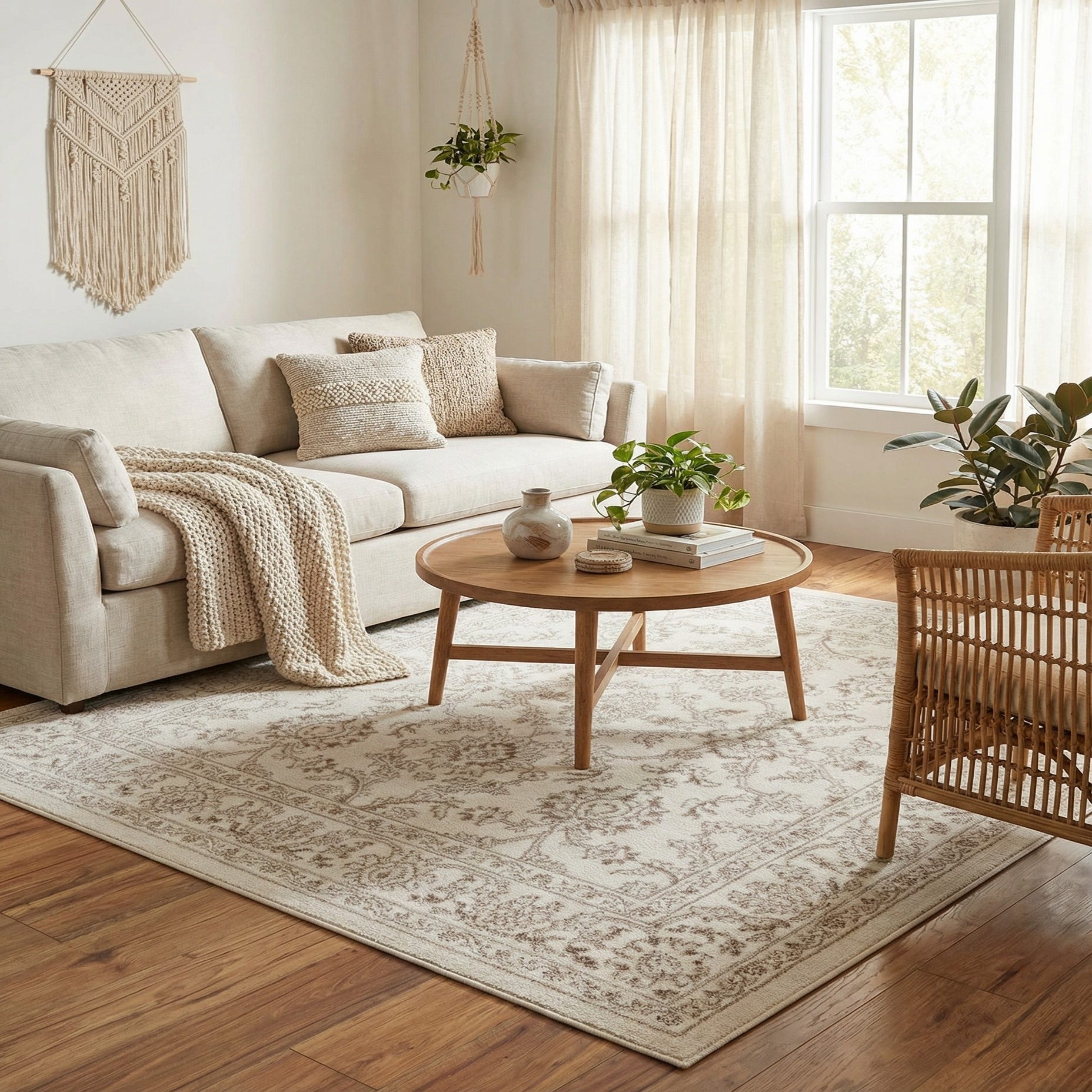 Works well as an anchor for a neutral living room seating area, layered under a sofa and coffee table to add quiet pattern and warmth. It also complements a serene bedroom palette or a casual dining space, pairing easily with light wood tones, linen fabrics, and matte metal accents in transitional, modern farmhouse, coastal, or Scandinavian-inspired interiors.