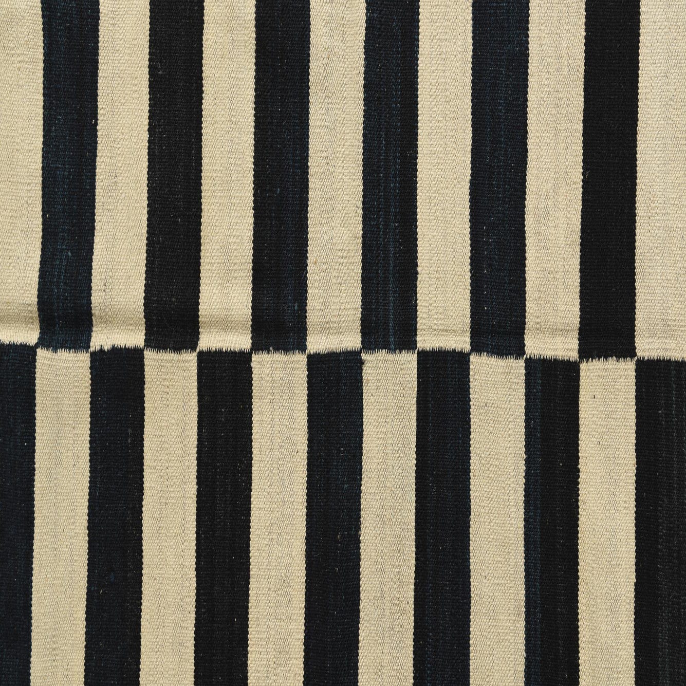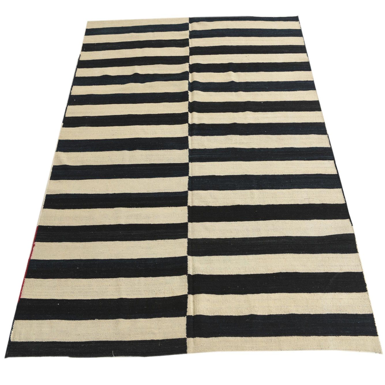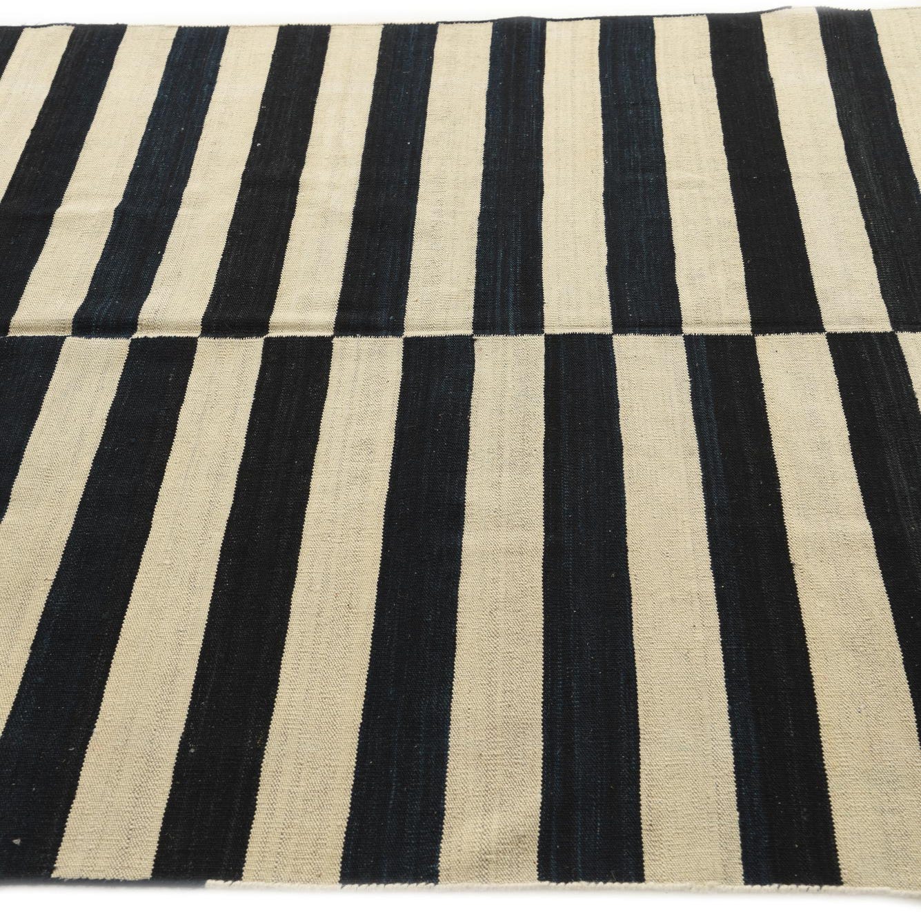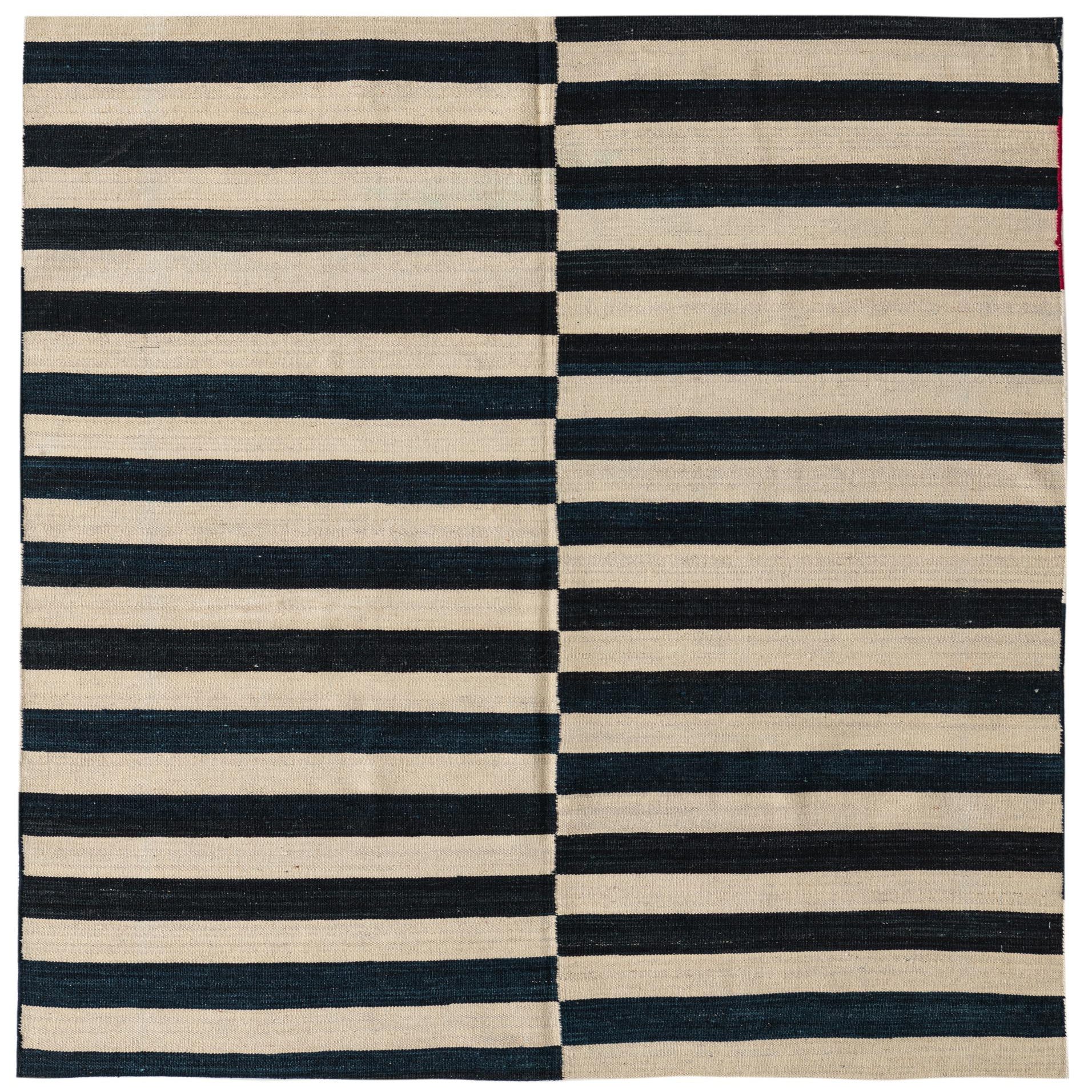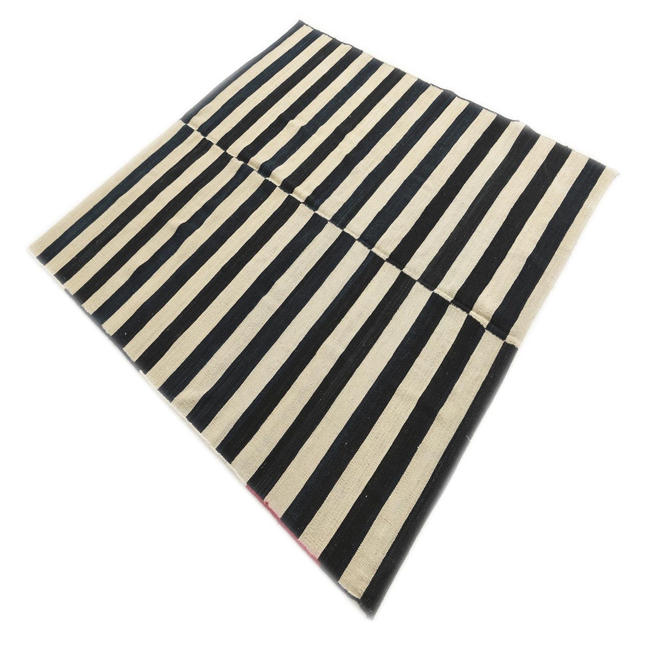 A 5' 2 x 5' 7 square flatweave wool rug featuring wide horizontal stripes in cream and black, with a vertical seam creating a staggered pattern.