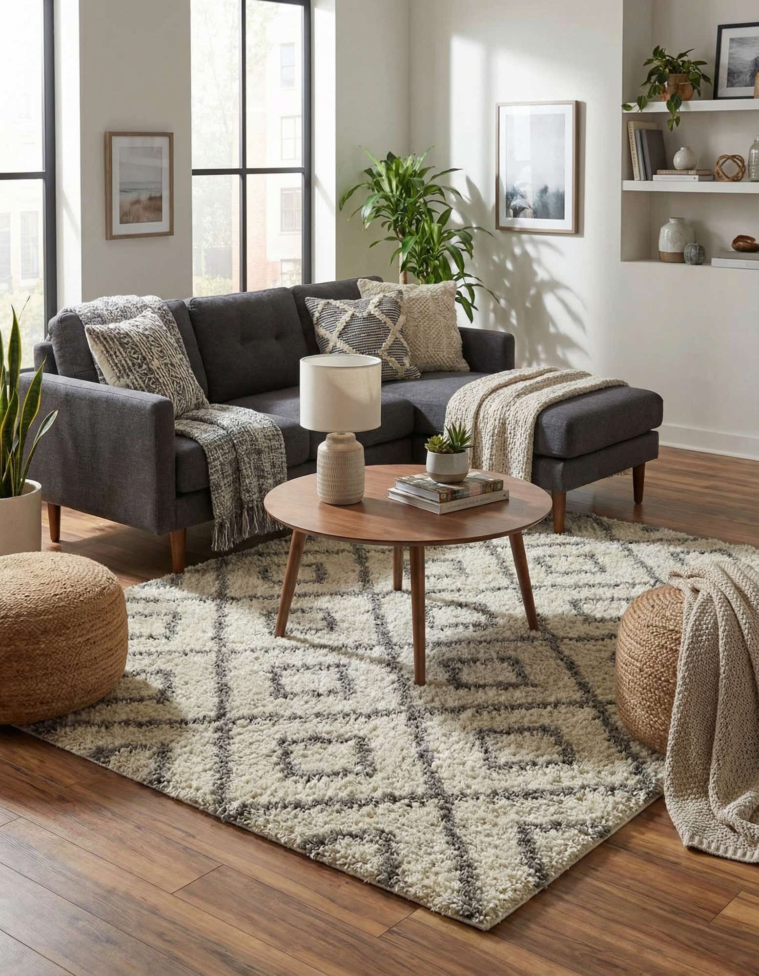 This piece works well in small seating areas or layered beneath a coffee table to anchor a living room, and it brings cozy warmth when placed at the side of a bed or in a reading nook. Its neutral ivory-and-gray palette pairs effortlessly with light wood or matte metal furniture, linen textiles, and muted colors — a good match for modern, Scandinavian, transitional, or casual contemporary interiors that benefit from a soft, patterned focal point.