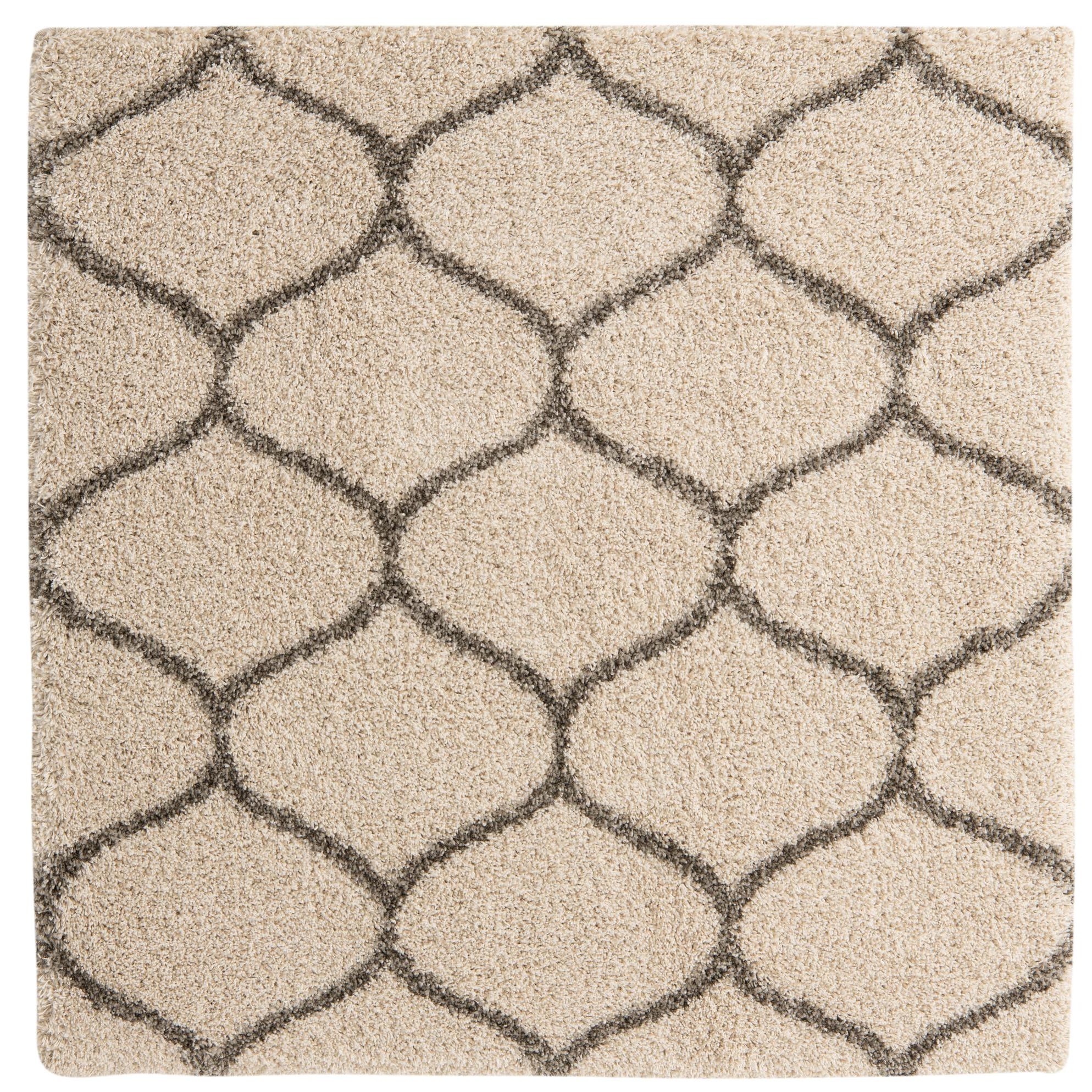 A soft, square ivory shag rug with a modern abstract dark gray trellis pattern, perfect for a cozy indoor space.