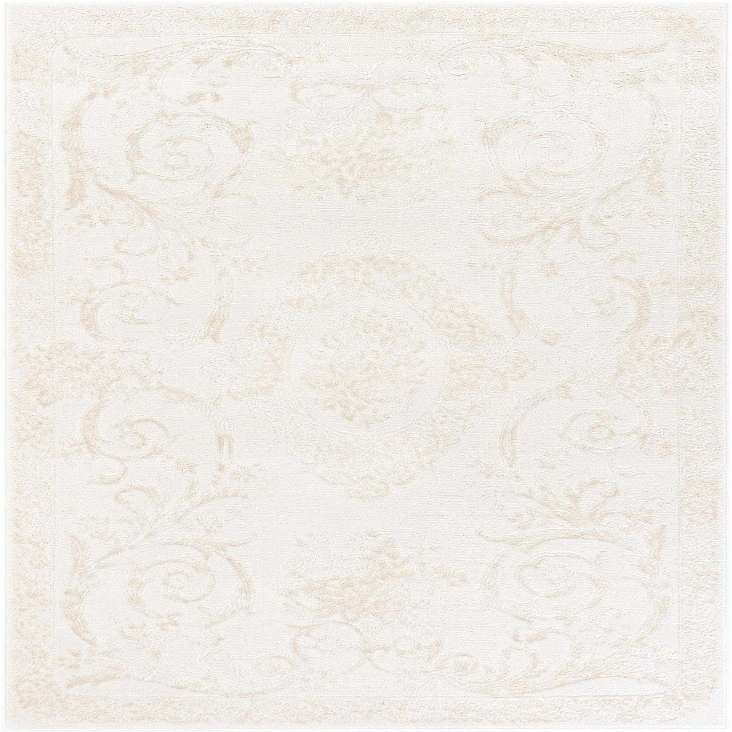 A soft ivory field sets the stage for a low-contrast, traditional medallion and scrolling-vine motif rendered in warm beige tones. The pattern is classic without heavy contrast, offering a subtle ornamental presence that reads calm and refined. Machine-made from 60% polypropylene and 40% polyester, the weave produces a gently textured surface with a slight sheen from the polyester and a soft, even pile that invites touch. Raised areas of the design add a mild dimensionality you can feel beneath bare feet.