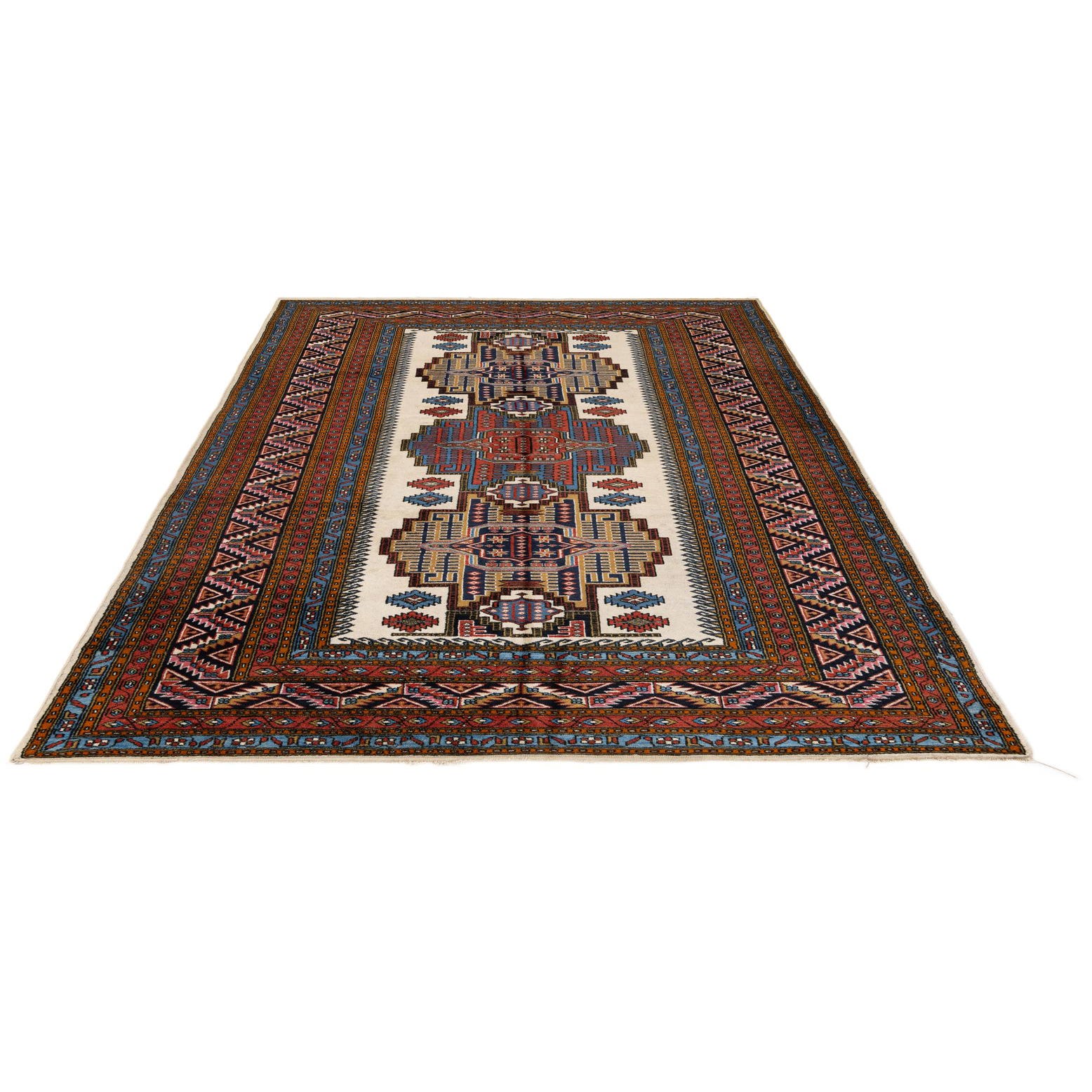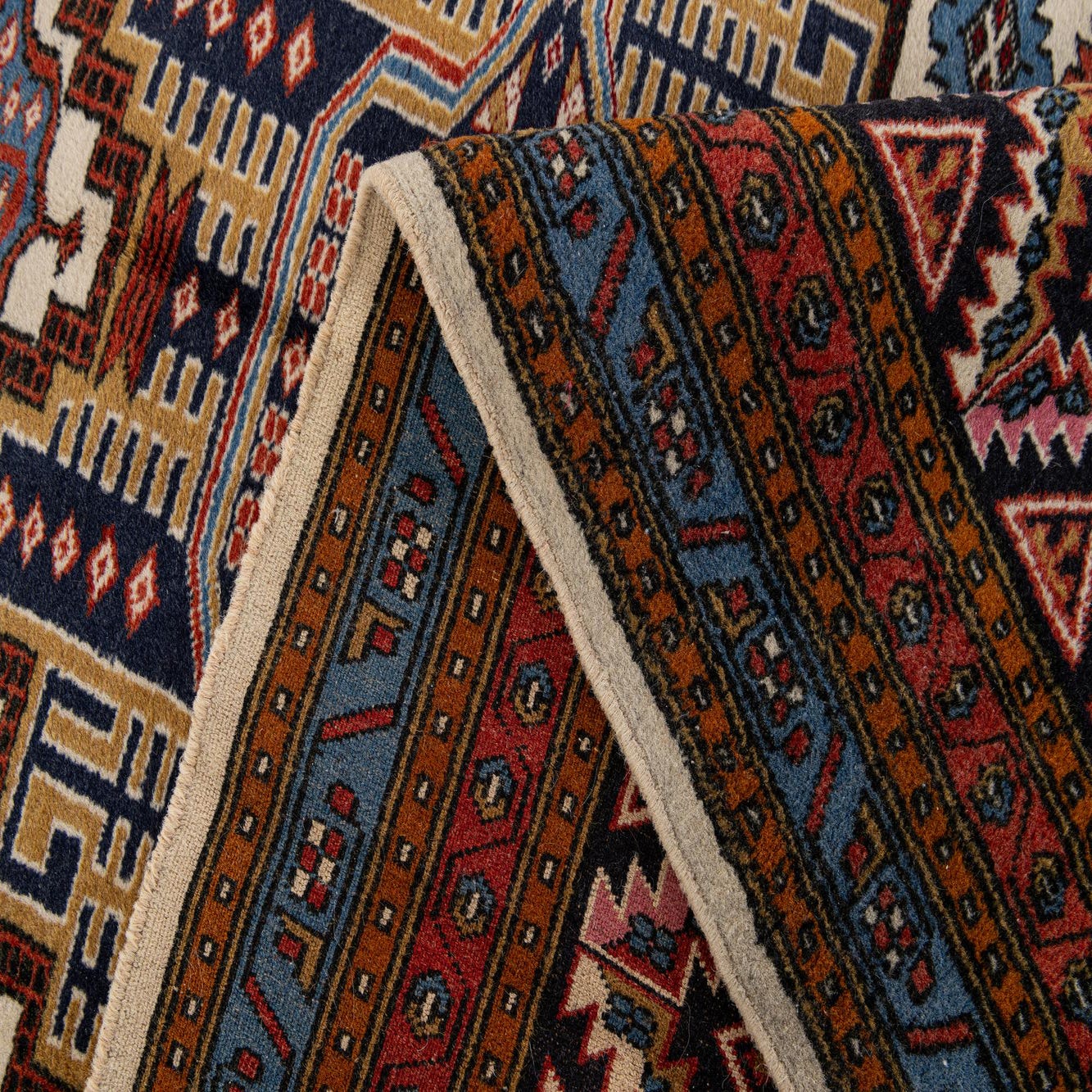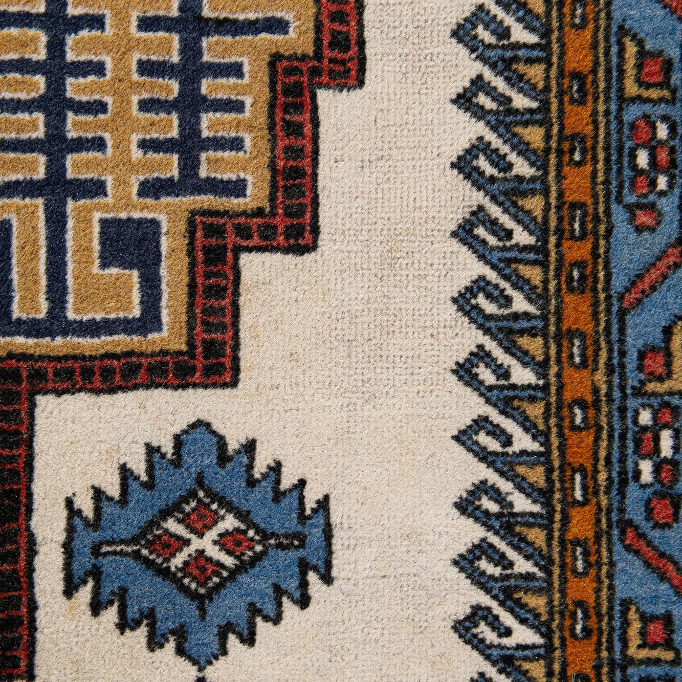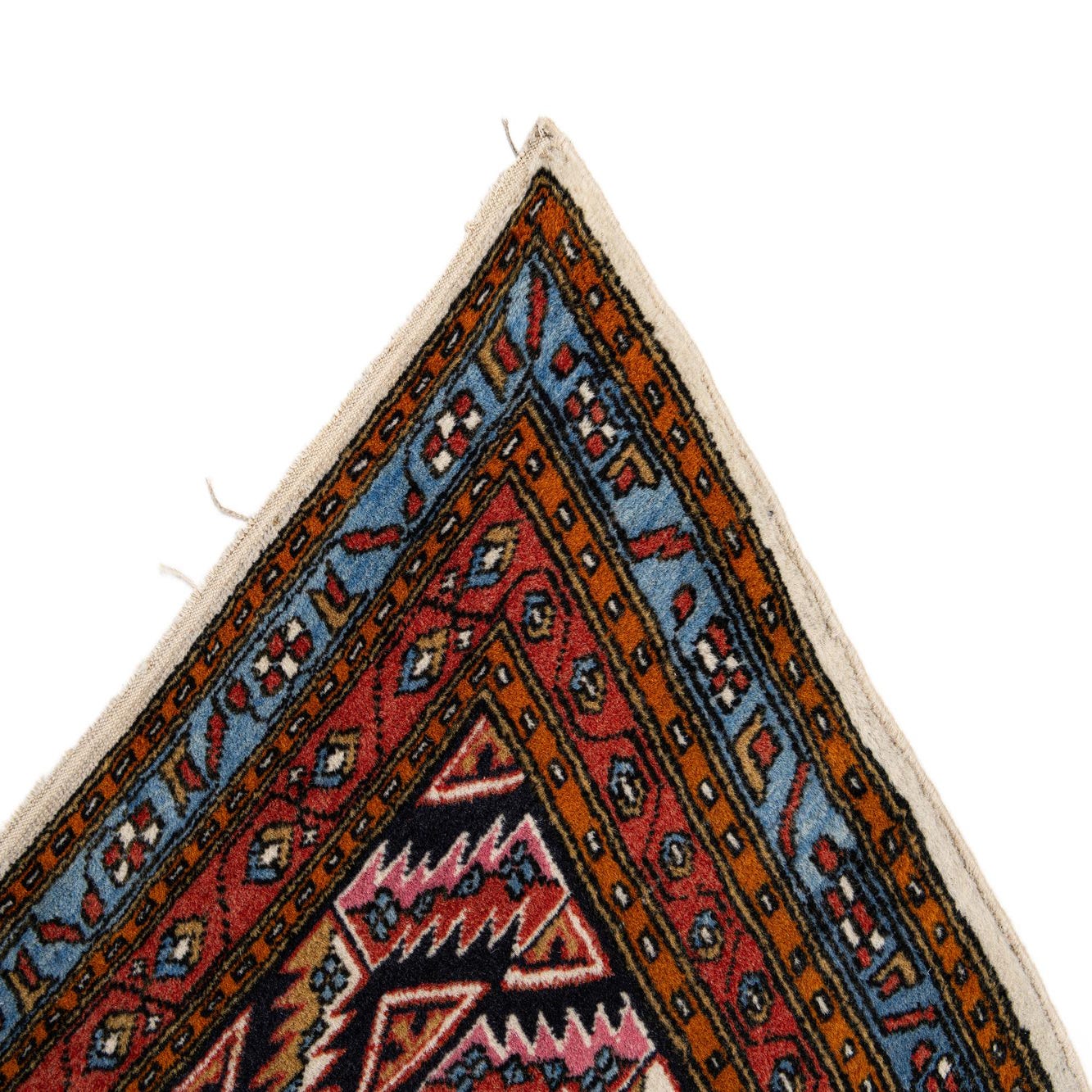 The wool pile has a tactile presence: dense and tightly knotted, it feels substantial beneath bare feet while still offering a soft surface. Its graphic, traditional pattern works well in a variety of interiors — place it under a coffee table to ground a compact living room, layer it in a study or home office for visual interest, or use it to add pattern and warmth to a bedroom seating area. Pair with mid-century wooden furniture and warm neutrals for a balanced, collected look, or contrast it with clean, modern lines and cool blues to highlight the rug’s handcrafted texture and color.