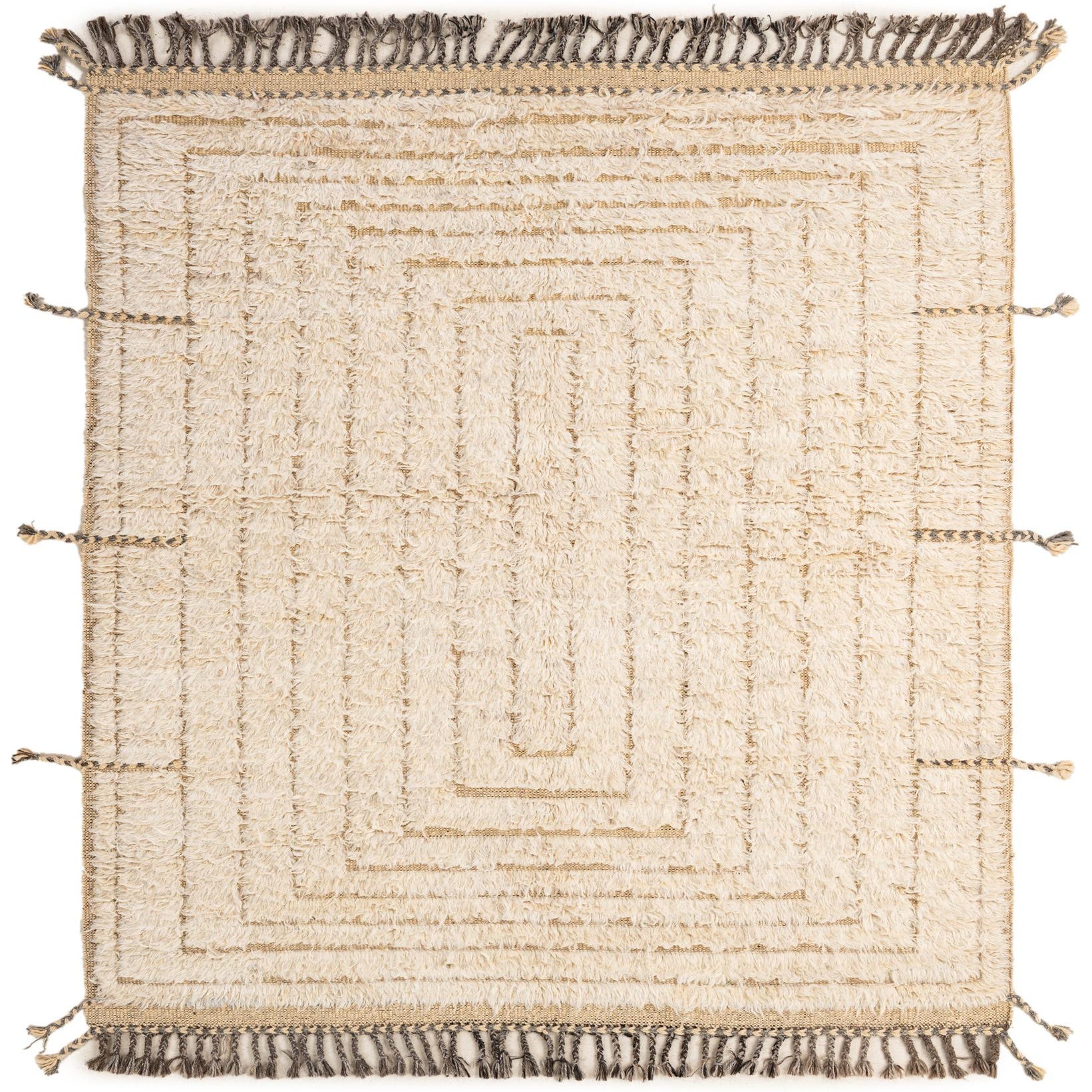 A 5x7 rectangular ivory wool rug featuring a tribal geometric pattern and decorative dark brown tassels on two ends.