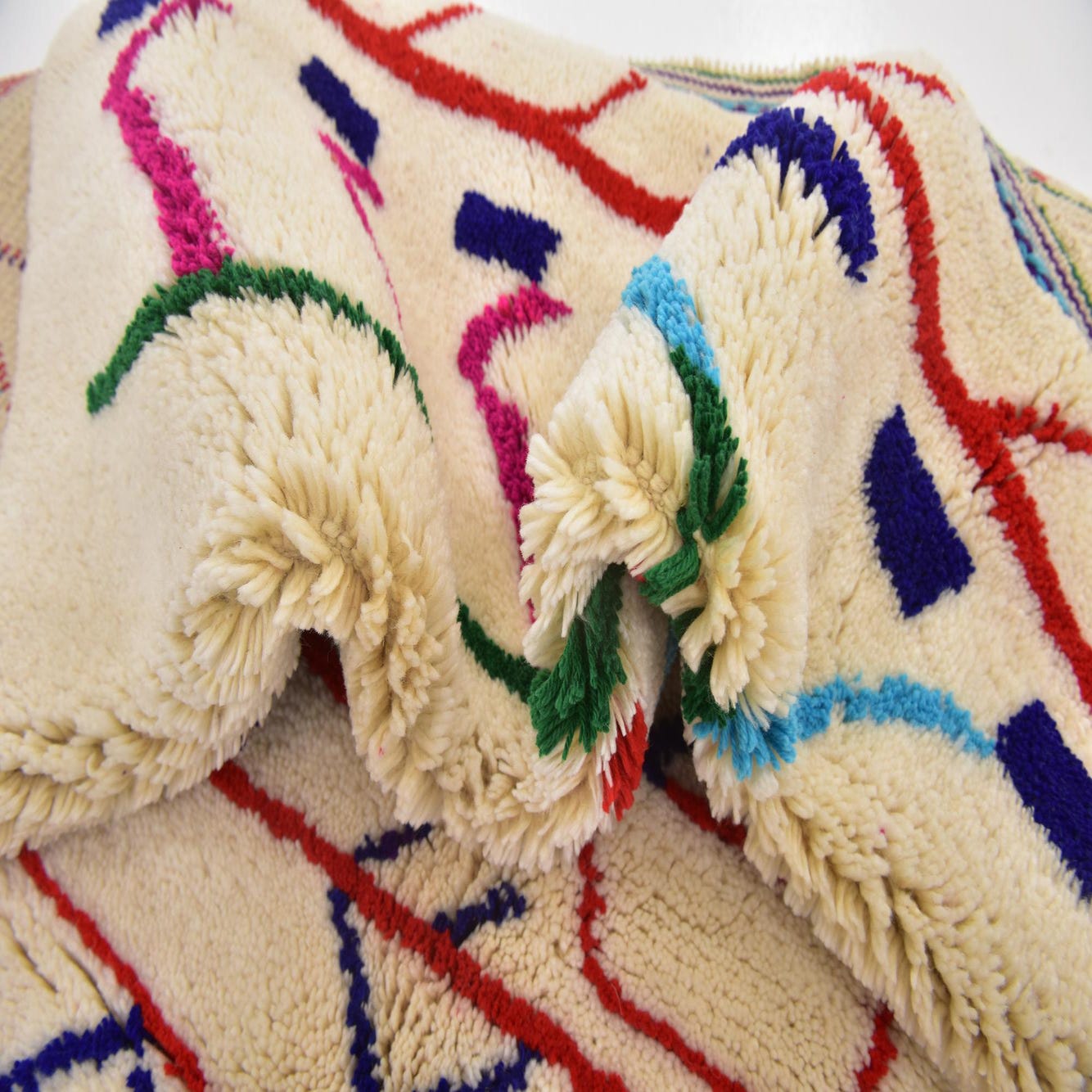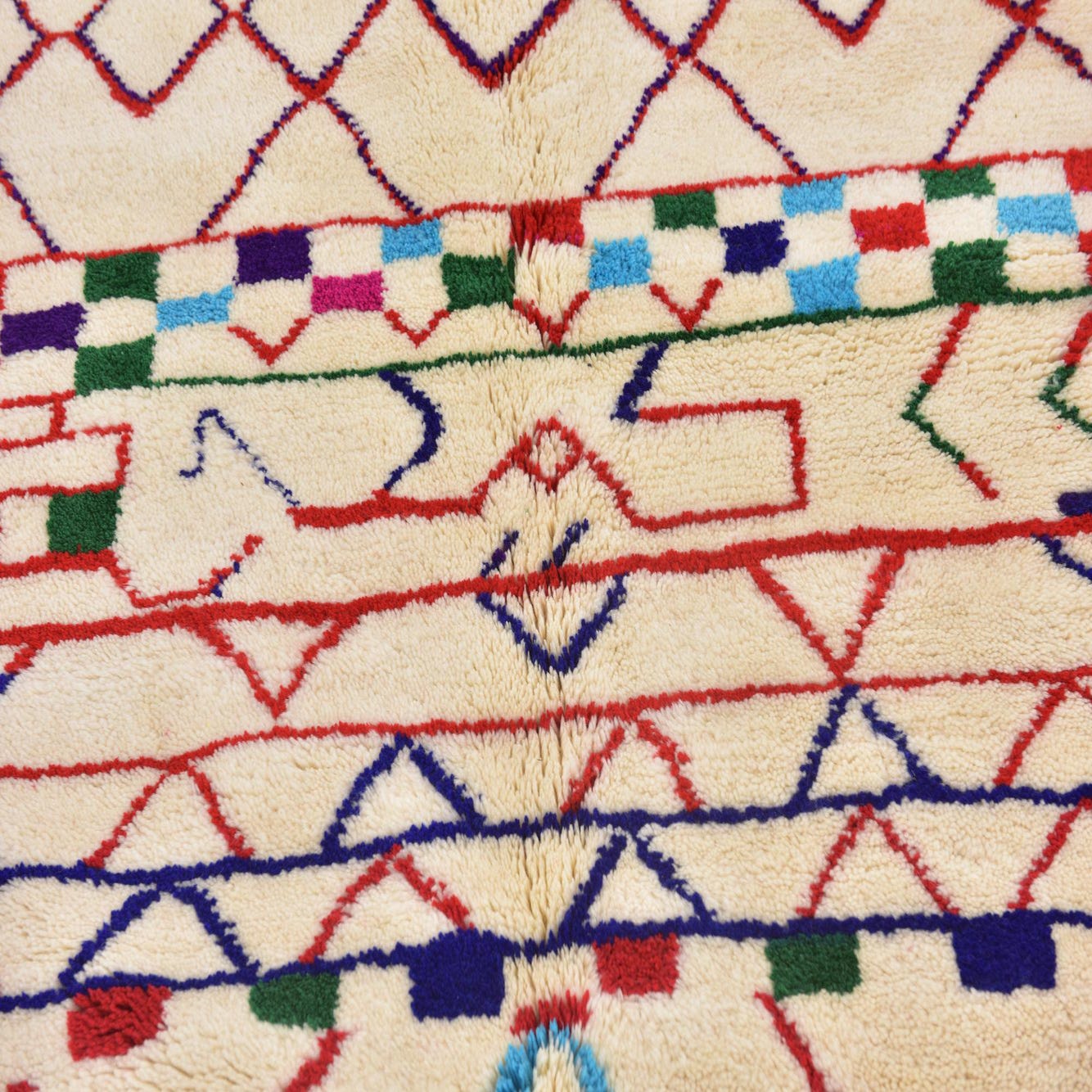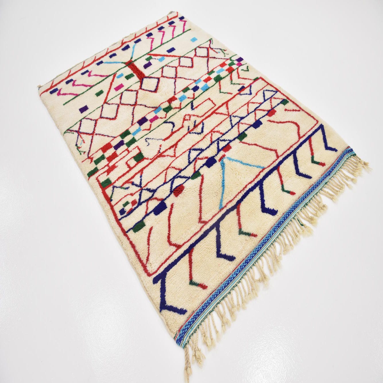 This Moroccan Hand Knotted rug, measuring 5x7 feet, is crafted from 100% wool and offers a fascinating visual narrative with its dynamic patterns and vibrant color palette, including ivory, black, green, light blue, red, and navy blue against an ivory background. The semi-antique quality of the rug, with an age ranging from 40 to 60 years, indicates a strong cultural heritage and traditional craftsmanship.