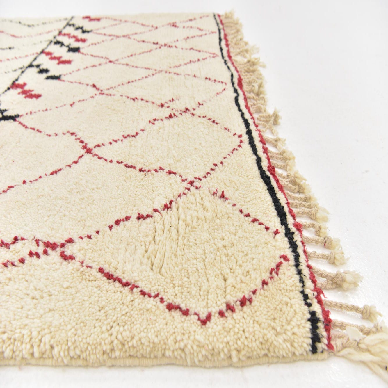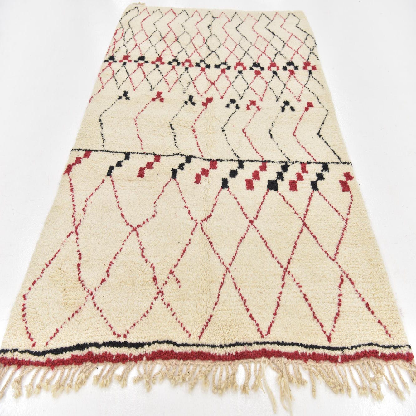 The harmonious blend of ivory, black, and red within this rug allows for flexible decorating options. This Moroccan rug would serve as a compelling centerpiece in a minimalist setting or could complement an eclectic mix of global-inspired decor. It could fit seamlessly in a living room, dining area, or bedroom, where its artisanal heritage and handcrafted quality will enhance the overall aesthetic. The timeless design of this rug ensures it can integrate with existing interior elements while standing out as a distinct statement piece.