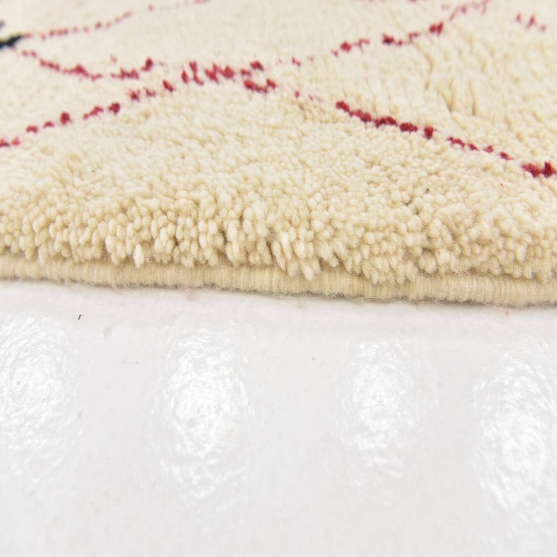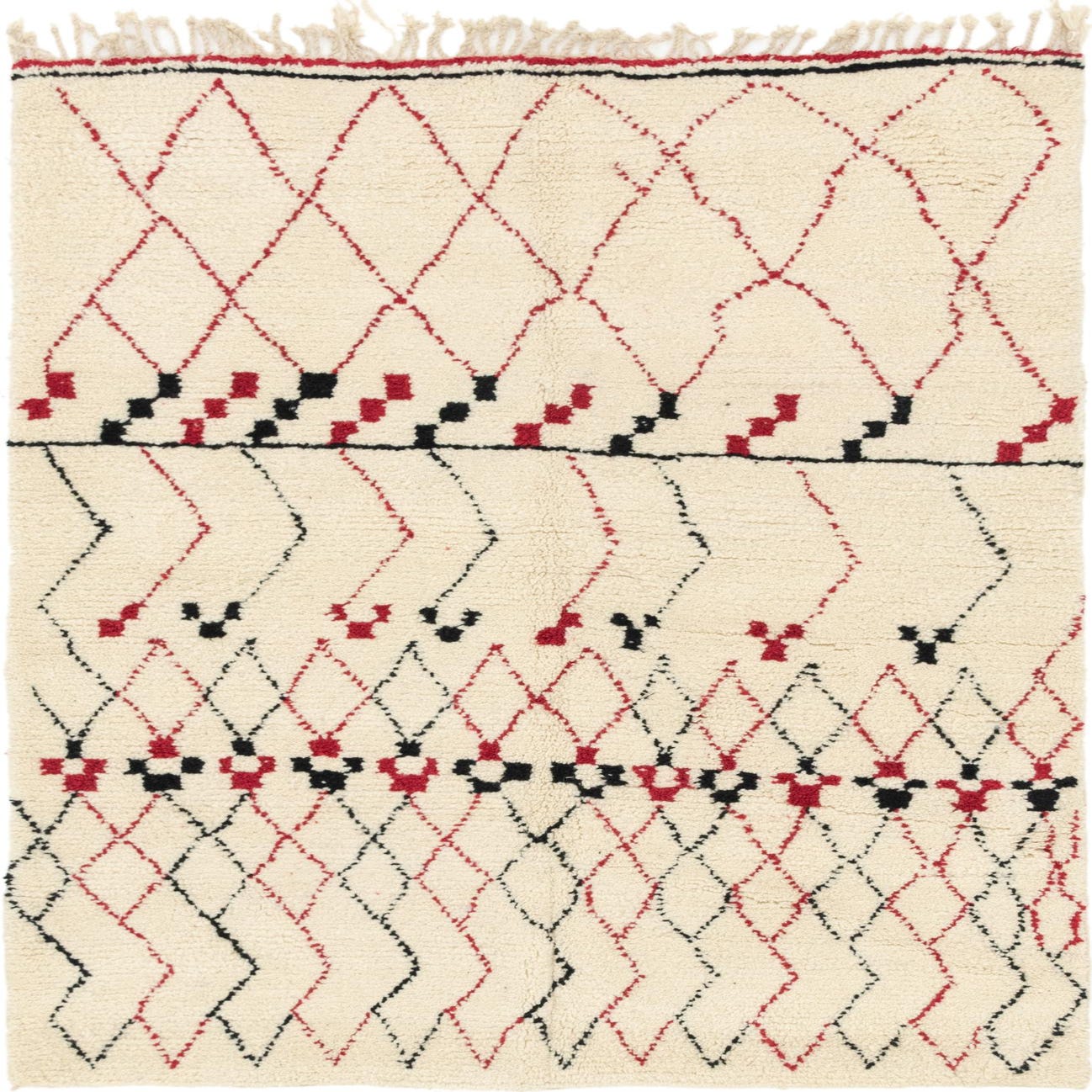 This hand-knotted Moroccan rug features a dynamic geometric pattern, showcasing a lattice design composed of black lines with accents of red, bringing a bold contrast against the ivory background. Crafted from 100% wool, the rug offers a robust texture that adds warmth and tactile comfort underfoot.
