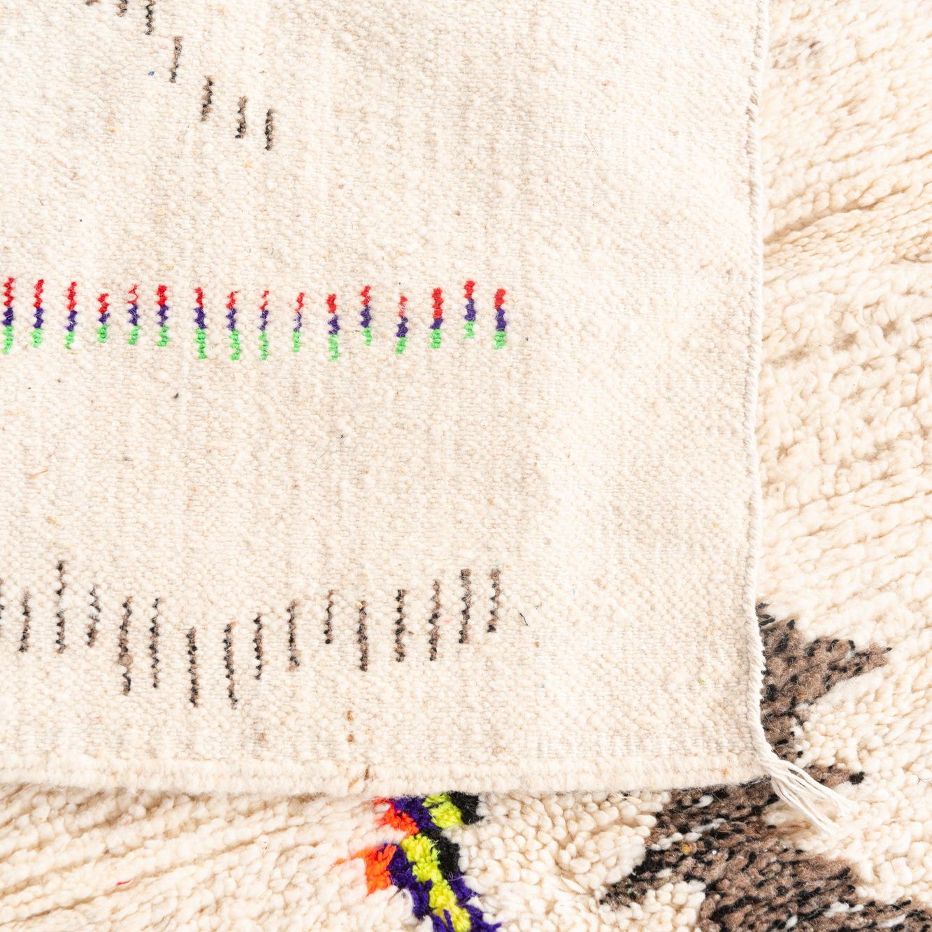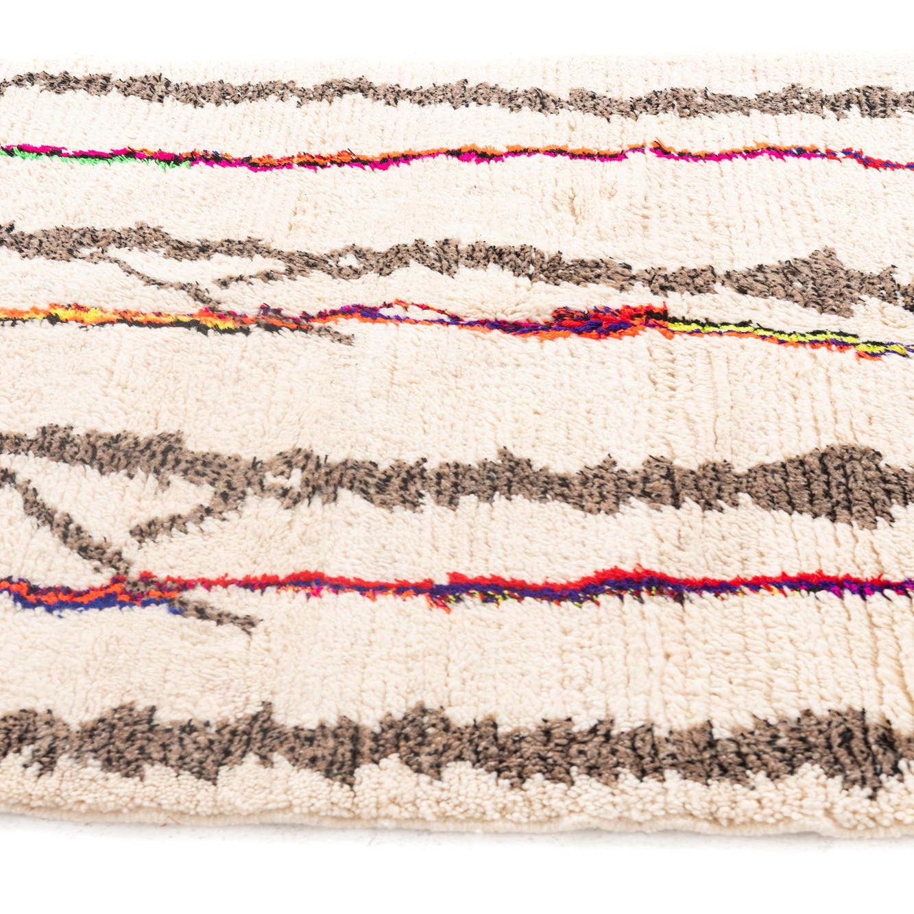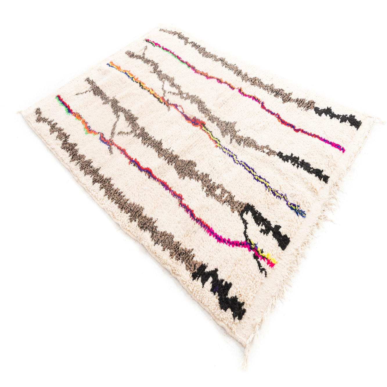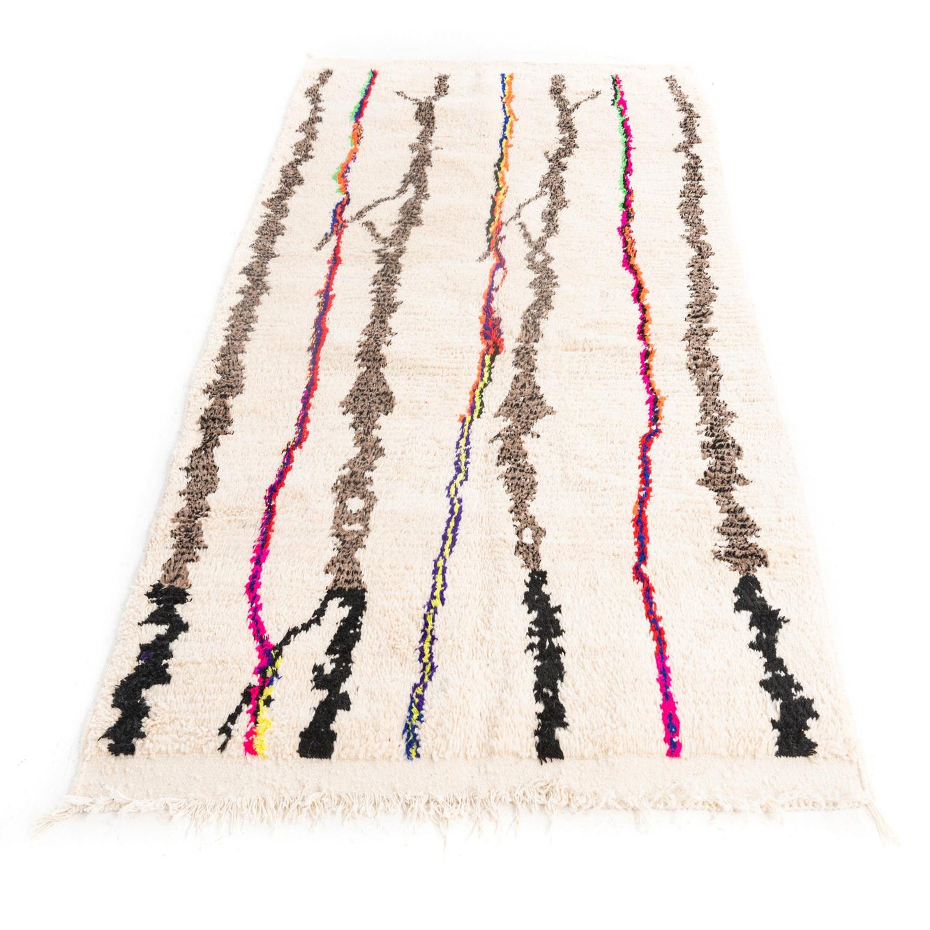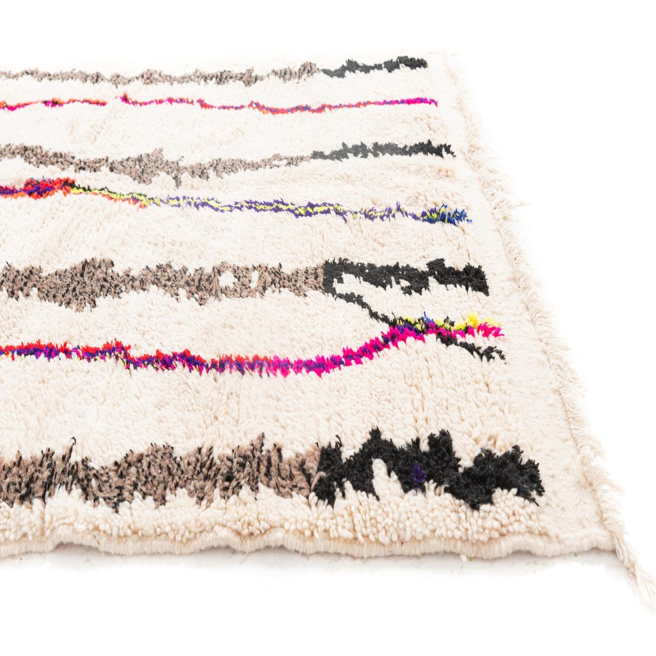This Moroccan collection rug features a dynamic and bold design, hand-knotted with 100% wool to create a plush and durable piece. The 5x7 size is versatile for a variety of rooms and settings. The rug showcases a timeless ivory background adorned with organic patterns in black, complemented by vivid lines of color, including brown, orange, purple, red, pink, and yellow. These bright accents introduce a playful yet sophisticated element to the piece. The rug's texture and semi-antique age add depth and character, while the presence of fringe lends it a traditional aesthetic.