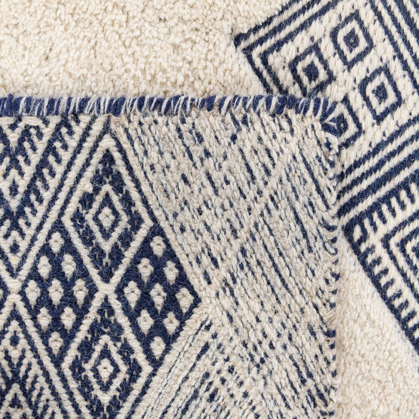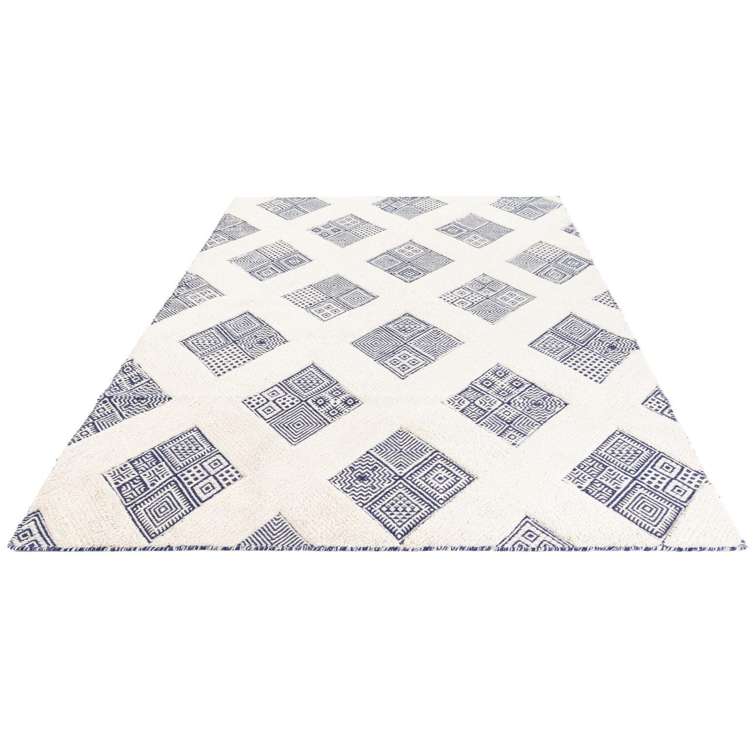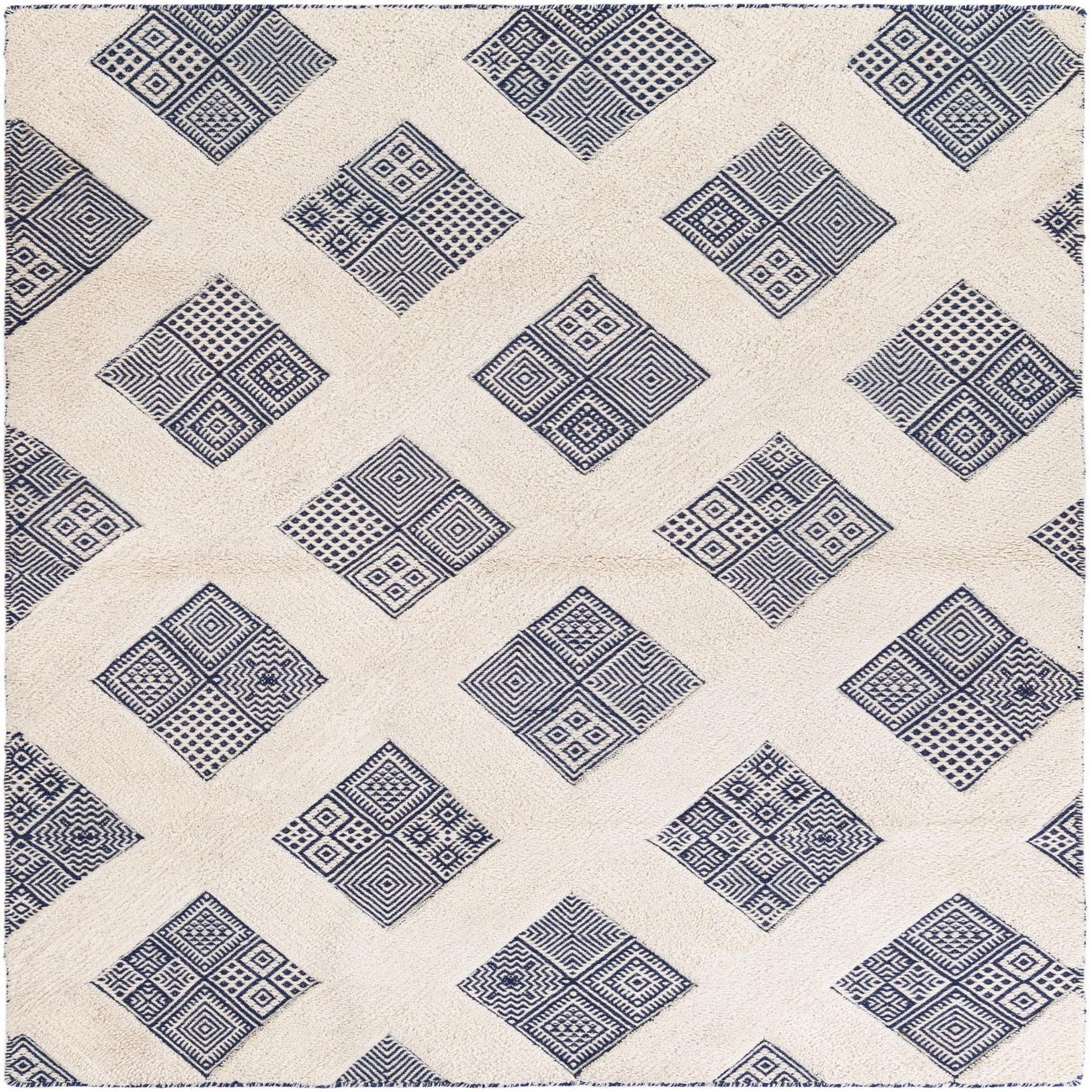 Primary color is Ivory. Colors in this rug include: Ivory, Navy Blue.