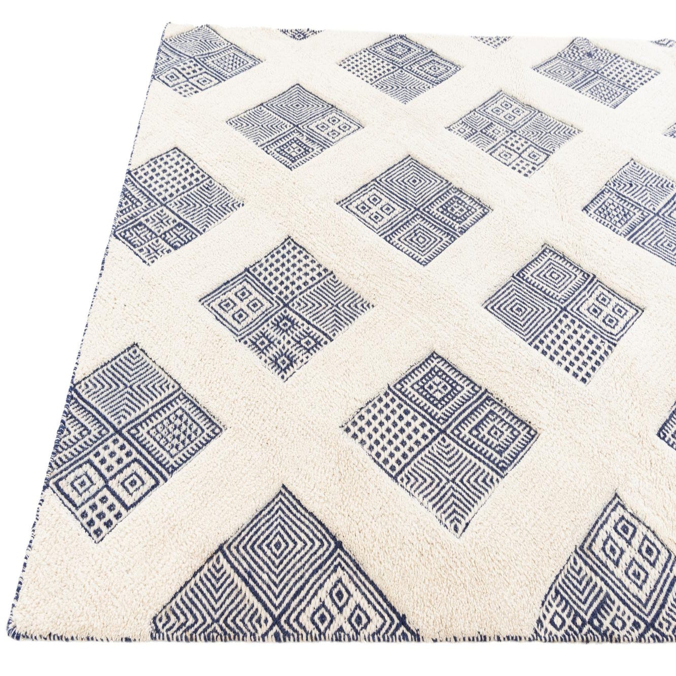 A 5x8 rectangular ivory modern wool rug with a pattern of large navy blue geometric diamonds.