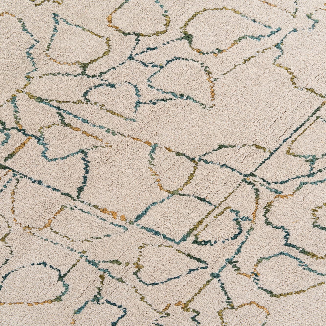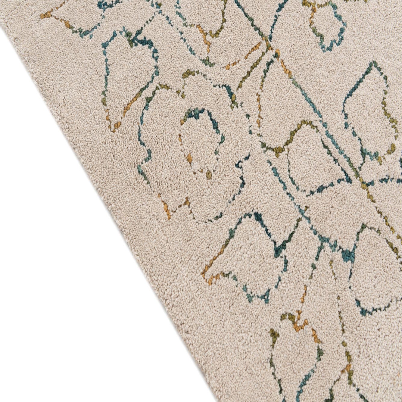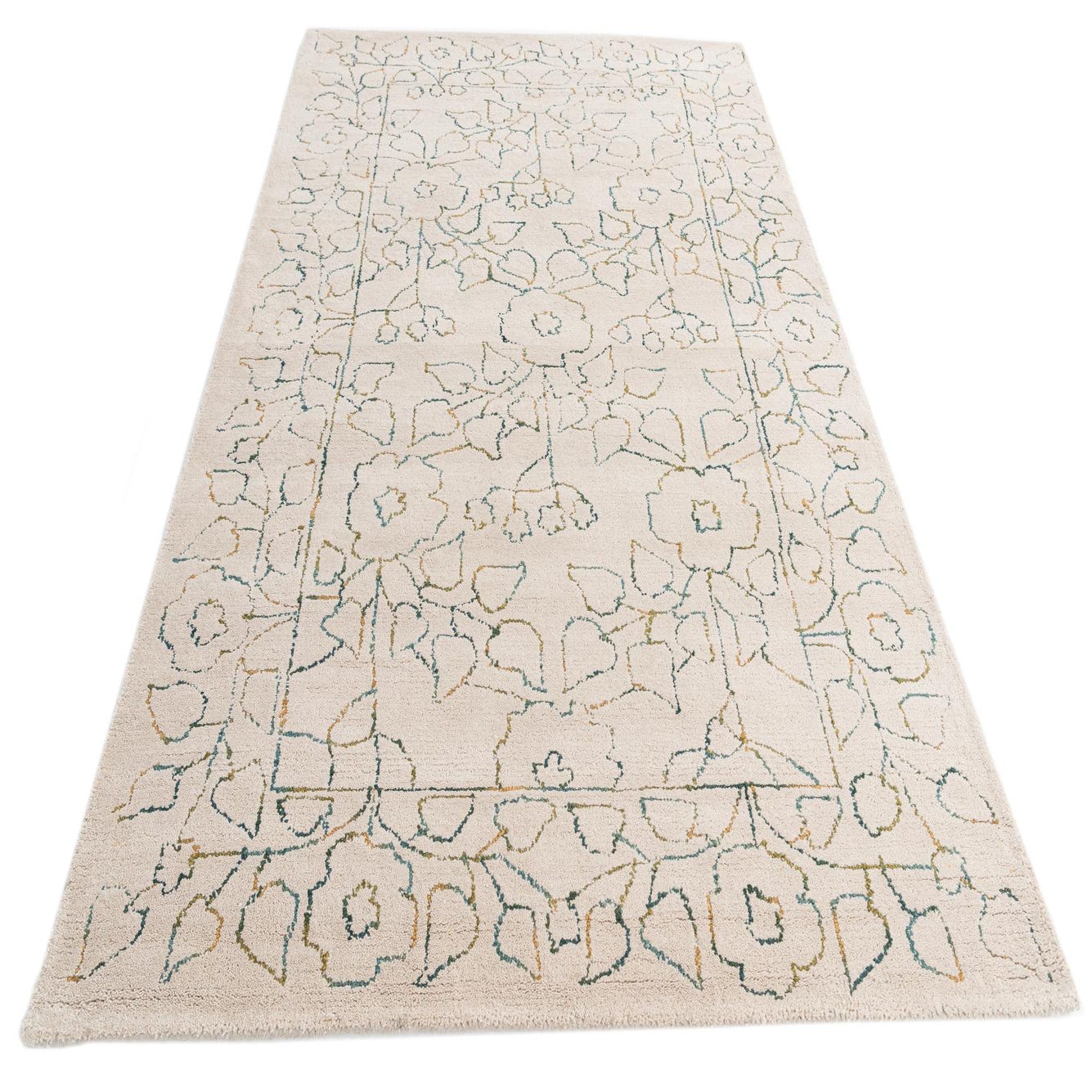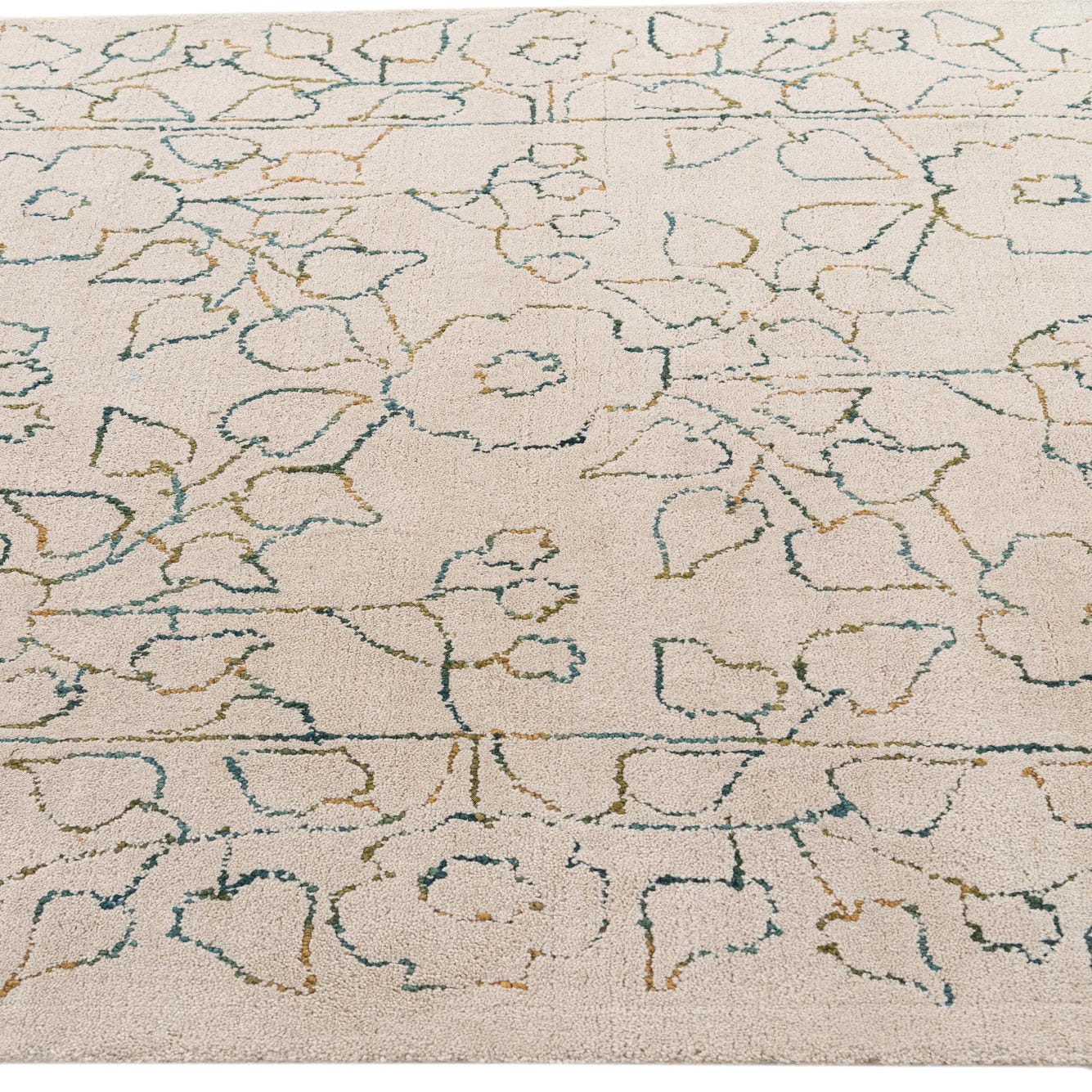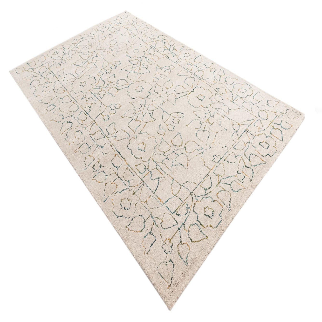 A 5x8 rectangular ivory area rug with a modern floral pattern in teal and gold outlines, perfect for a living room.