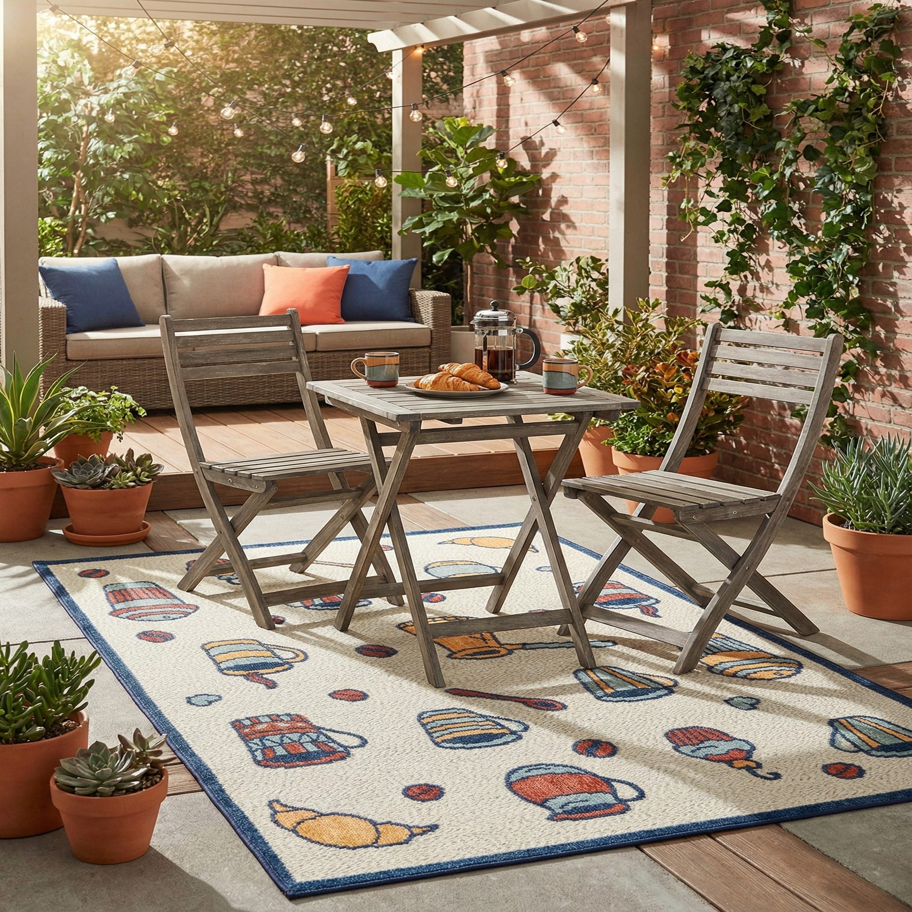 A 5x8 rectangular ivory rug with a playful pattern of colorful coffee cups, spoons, coffee beans, and croissants, framed by a dark blue border.