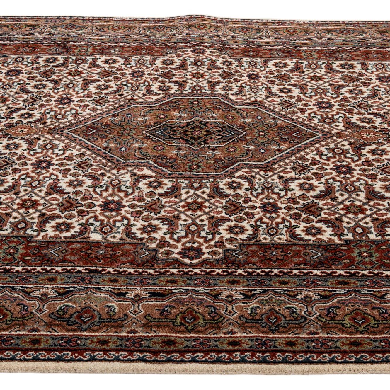 A rectangular 5x8 ivory and brown traditional Bidjar wool rug with an intricate medallion pattern and fringe.