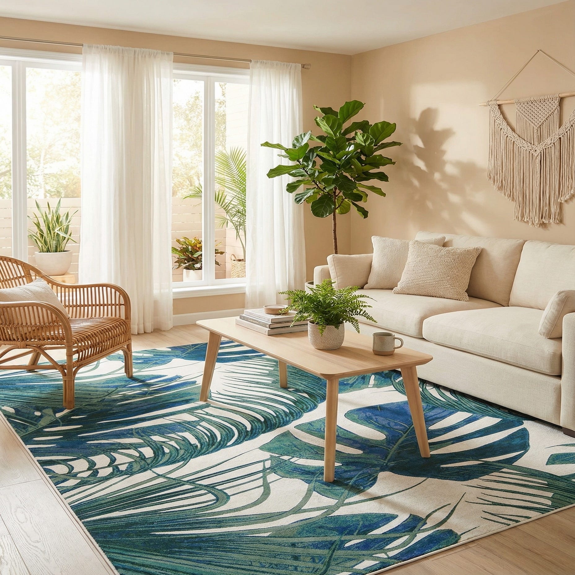 A 5x8 rectangular ivory rug with large blue and green tropical monstera and palm leaves, perfect for a living room.
