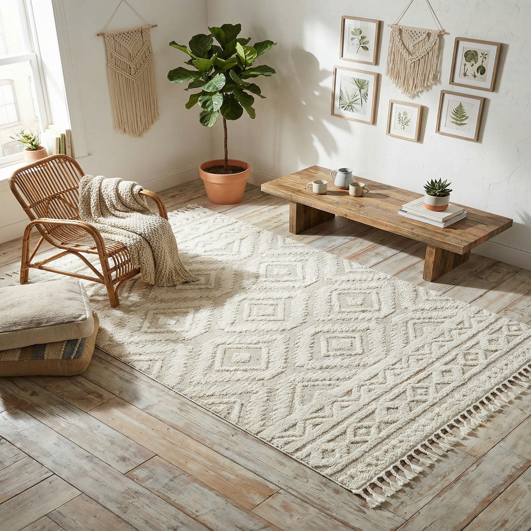 This Boho Collection rug features a versatile ivory background with a subdued geometric diamond pattern that lends a sense of relaxed sophistication to any space. Machine-woven from 100% polyester, this 5x8 rug presents a soft, inviting texture that is pleasing underfoot and visually appealing.