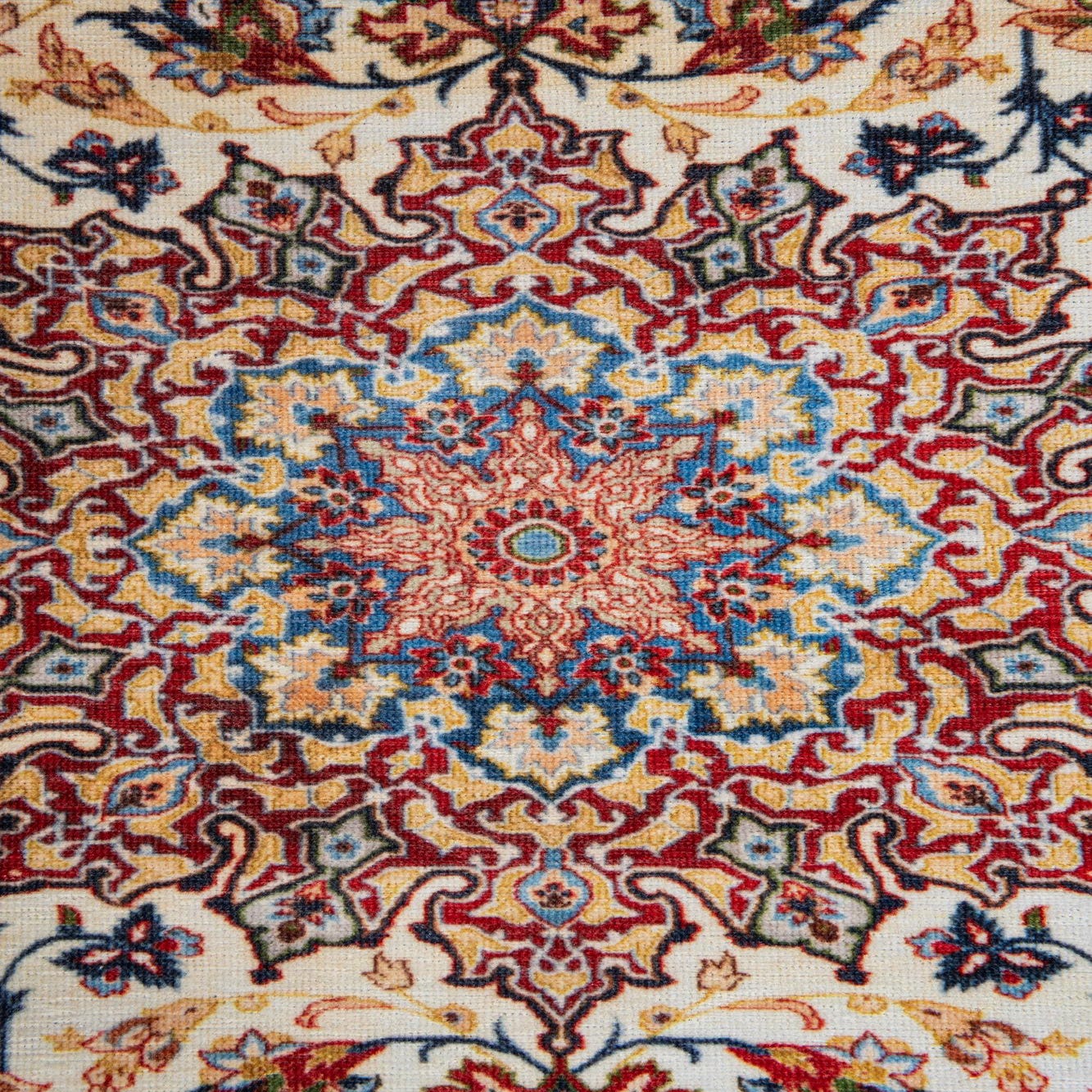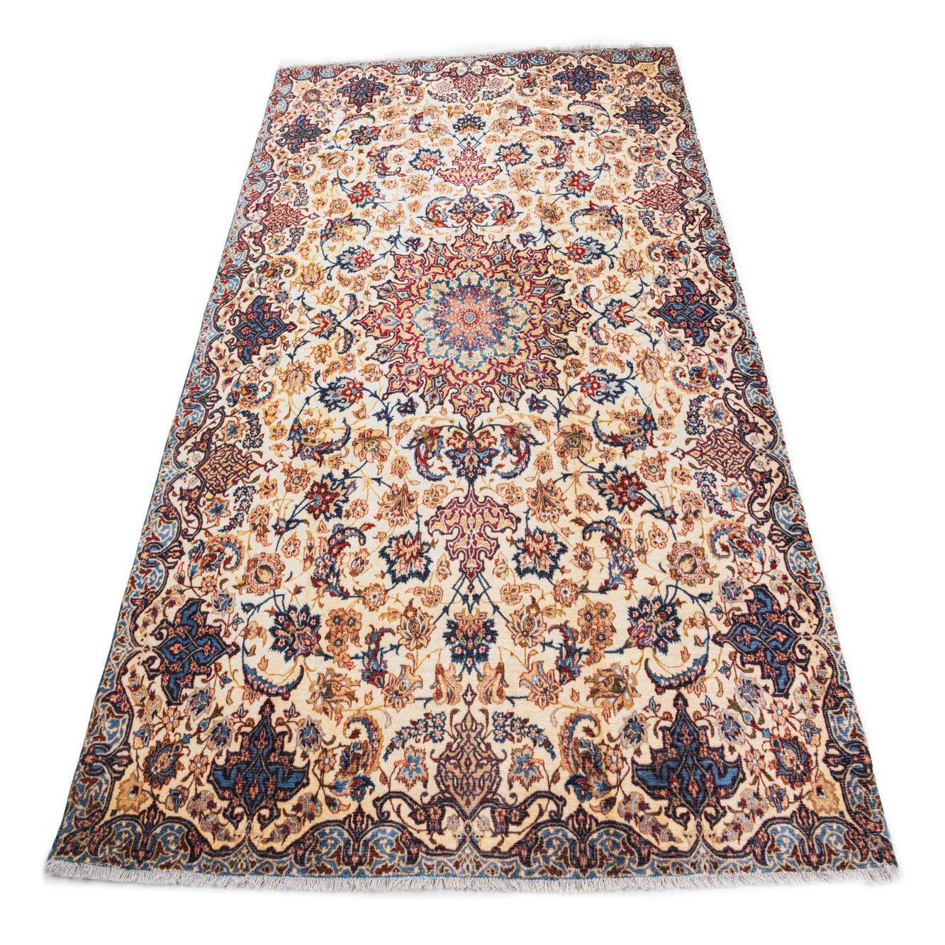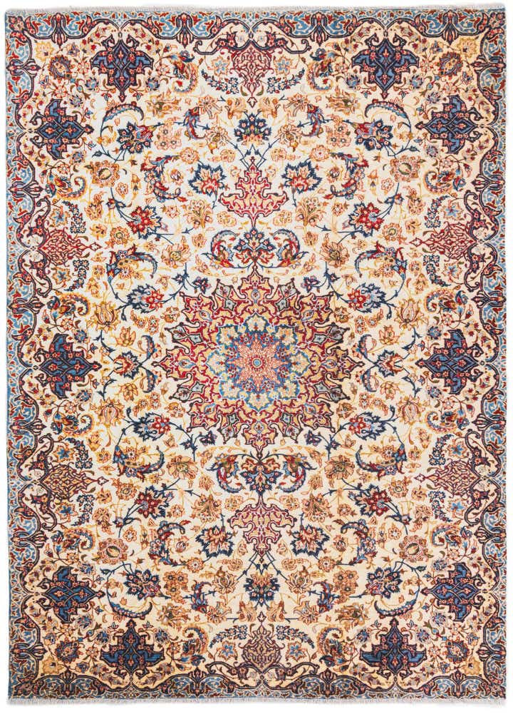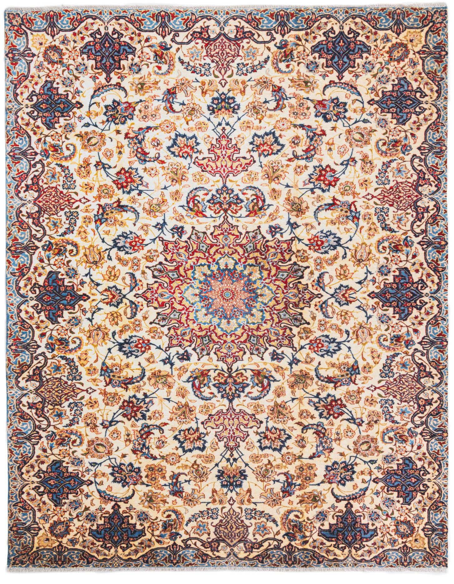 Primary color is Ivory. Colors in this rug include: Ivory, Blue, Brown, Red, Yellow.