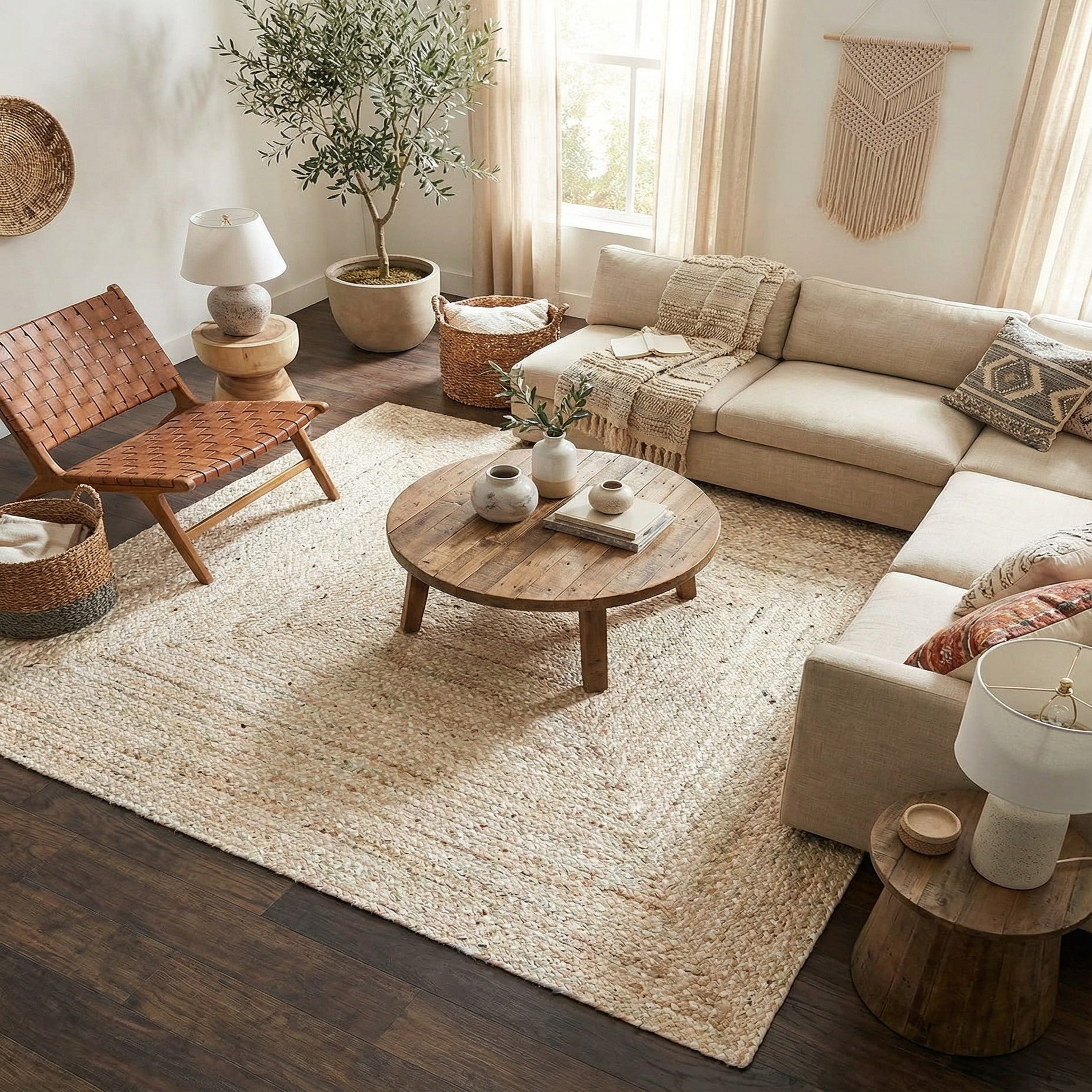 Soft, hand-braided 100% cotton construction gives this rug a warm, tactile feel and a gently textured surface. A framed, concentric braid pattern creates subtle bands across an ivory background, with beige yarns woven throughout to add depth and natural variation. The low-profile braided weave offers comfortable underfoot texture while keeping a clean, understated look that complements a range of interiors.