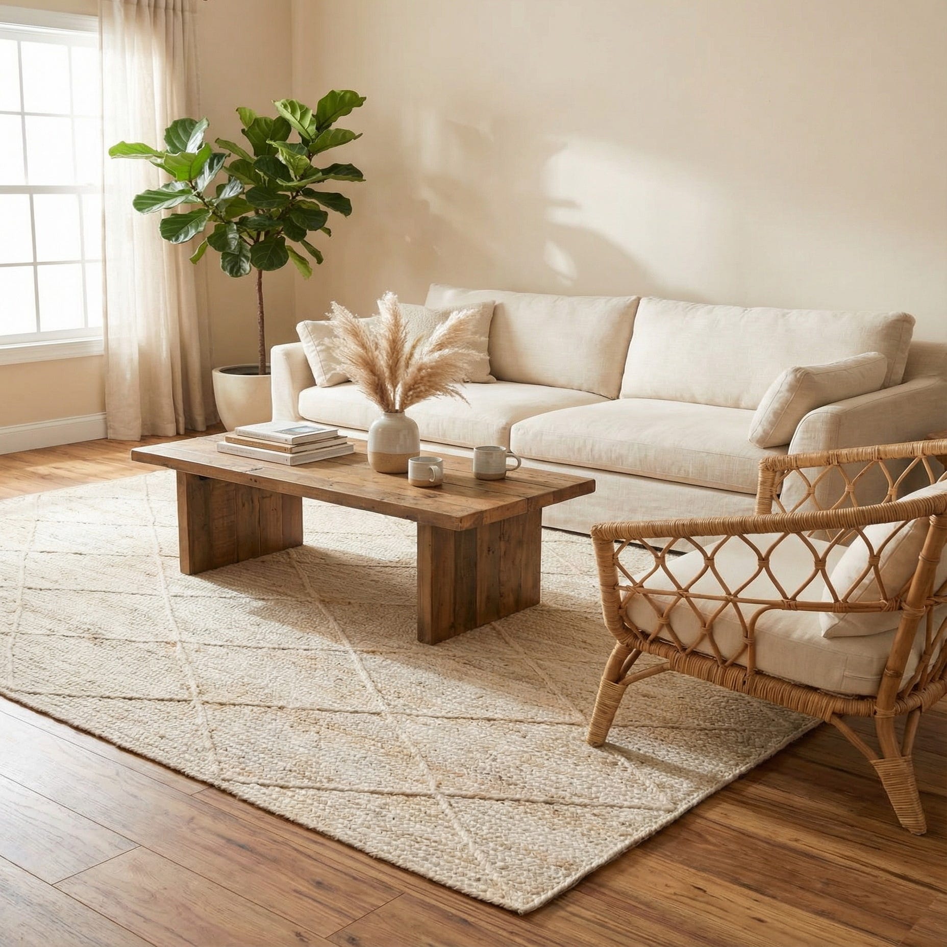 Its simple geometry and organic fiber make it a versatile anchor for relaxed, modern interiors. Place it beneath a coffee table in a living room with light-wood furniture and linen upholstery, layer it under a bed to add texture to a calm bedroom, or use it in a sunroom or entry where natural materials and woven accents set the tone. It pairs well with rattan, wicker, and matte metal finishes when you want a balance of warmth and structure.