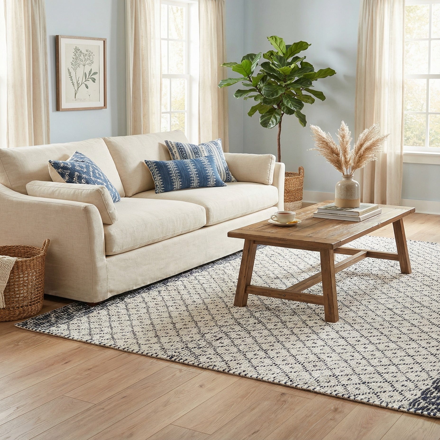 This rug works well in casual and contemporary settings — try it layered beneath a coffee table in a relaxed living room, placed in an entry or mudroom to define the space, or under a dining table paired with light wood chairs. It complements coastal, modern farmhouse, and Scandinavian interiors, and pairs nicely with linen upholstery, woven baskets, and navy or brass accents to pick up the pattern color.