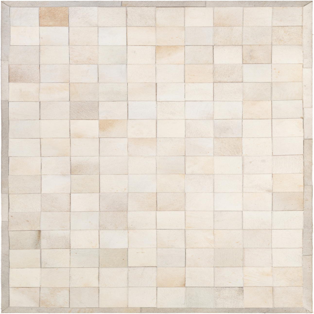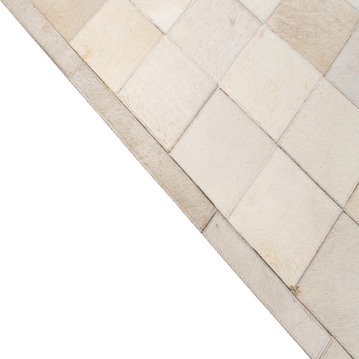 Hand-stitched squares of cowhide form a calm, geometric patchwork on an ivory ground. Each tile carries subtle cream and ivory variations and natural hair-on-hide markings, creating gentle tonal movement across the surface. Fine leather stitching defines the grid and a narrow leather binding frames the piece, giving it a clean, tailored edge. The hair-on-hide surface has a soft, velvety touch and a low sheen that catches light without drawing attention.