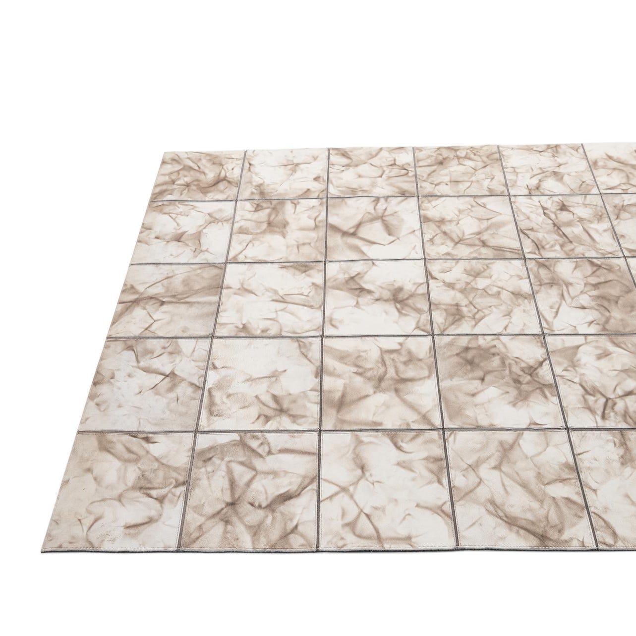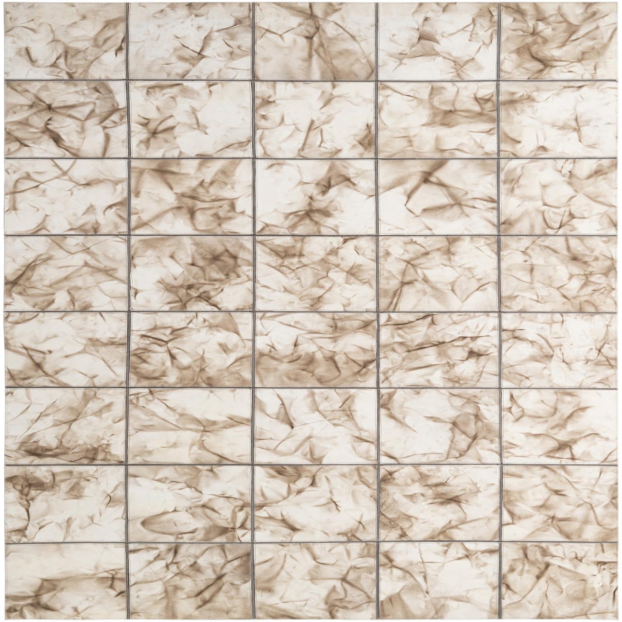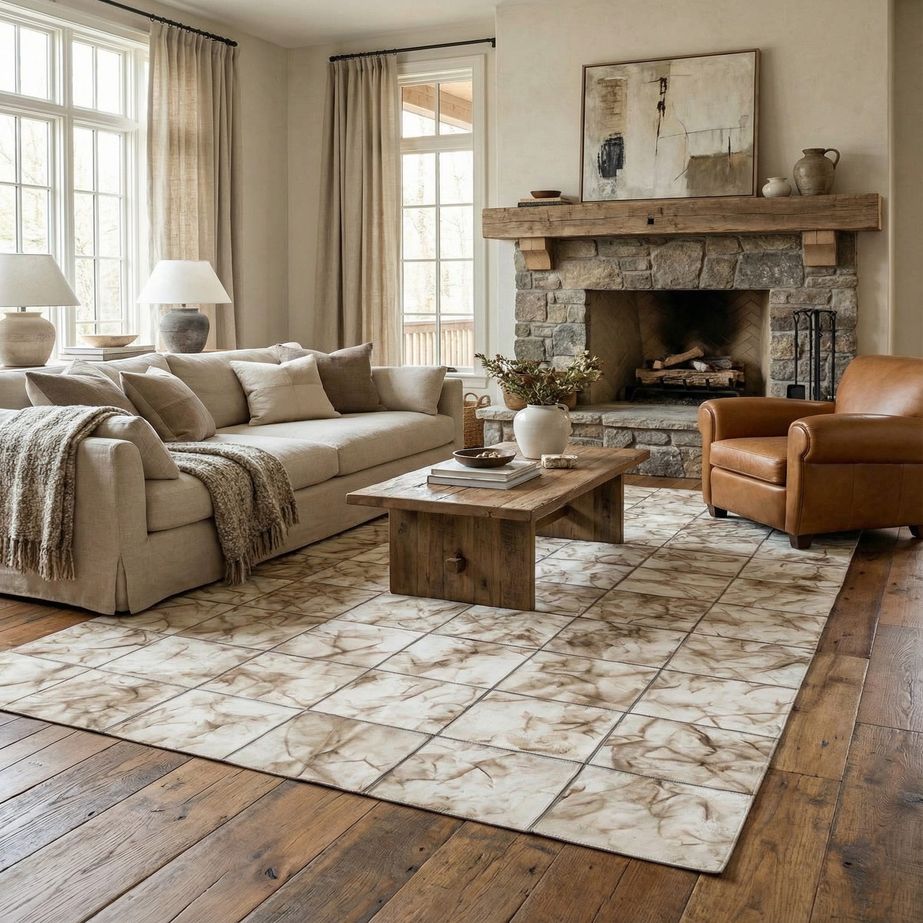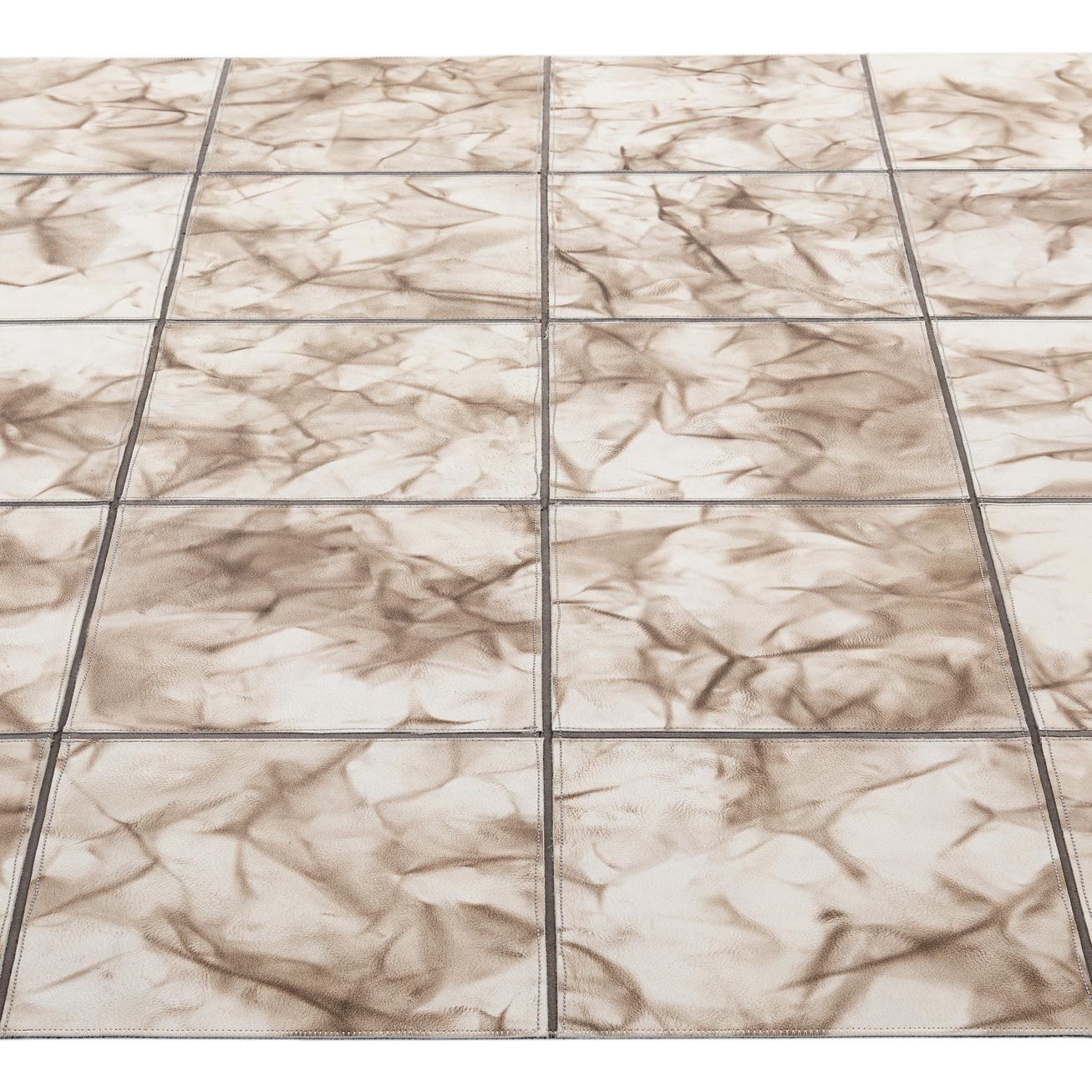 A 5x8 rectangular Cowhide Patchwork rug featuring ivory and cream squares with abstract, crinkled brown patterns, ideal for a modern living room.