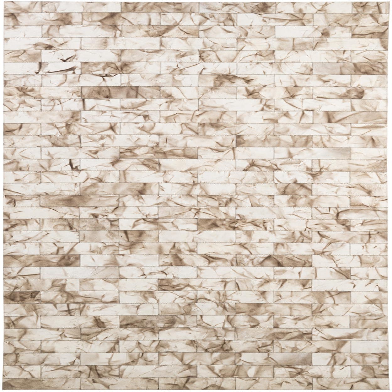 Handmade of cowhide and leather, this patchwork rug arranges narrow rectangular hides in a brick-like grid over an ivory ground. Soft brown marbling flows across the panels, and the stitched seams between patches create subtle texture and visual rhythm. The surface is soft hair-on-hide with a low profile and a gentle sheen where light catches the hair, while the leather joins add tactile contrast and a refined, natural grain.