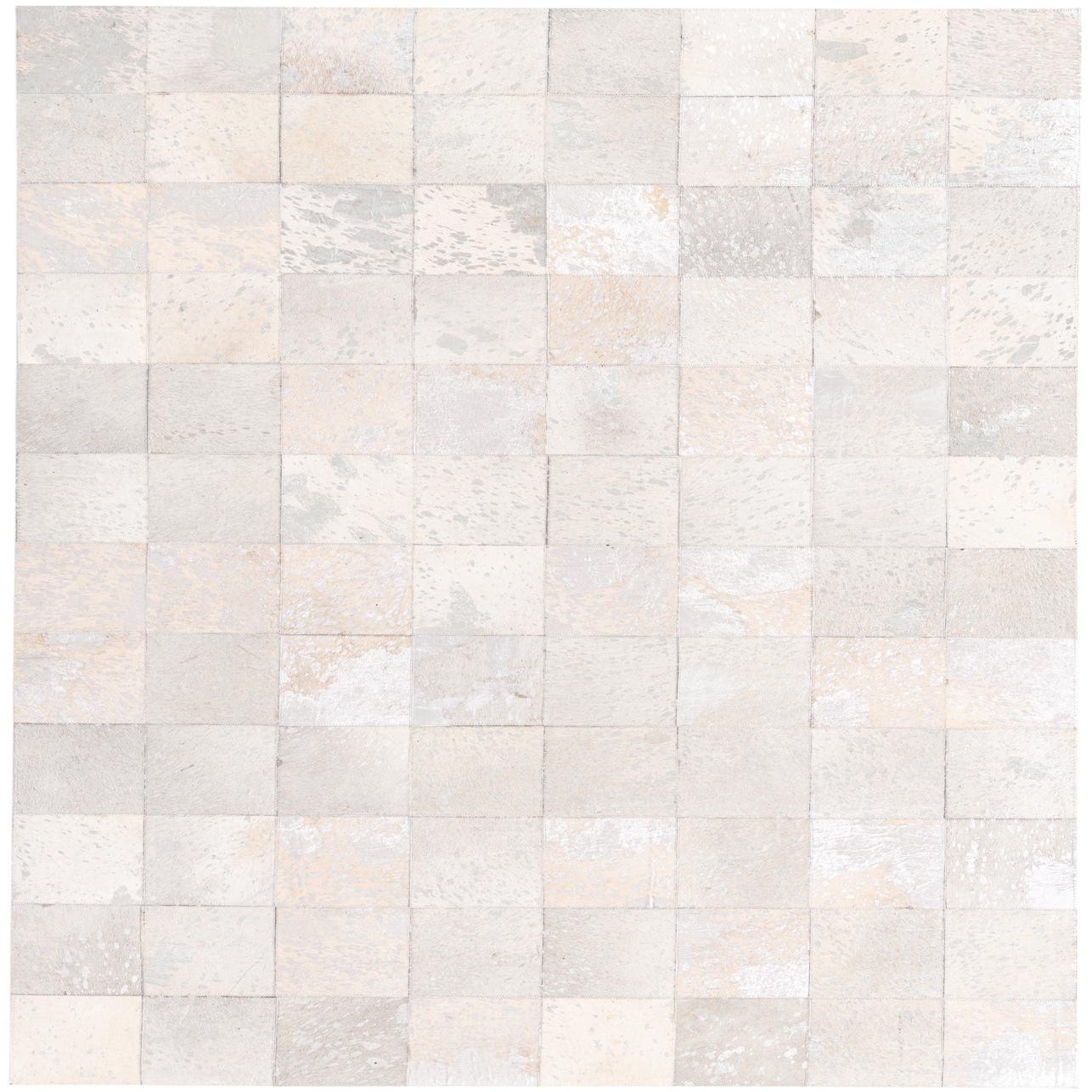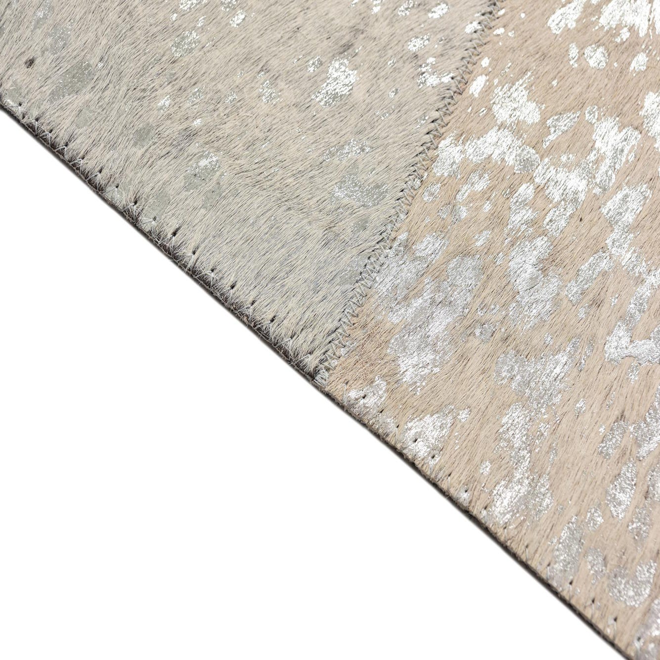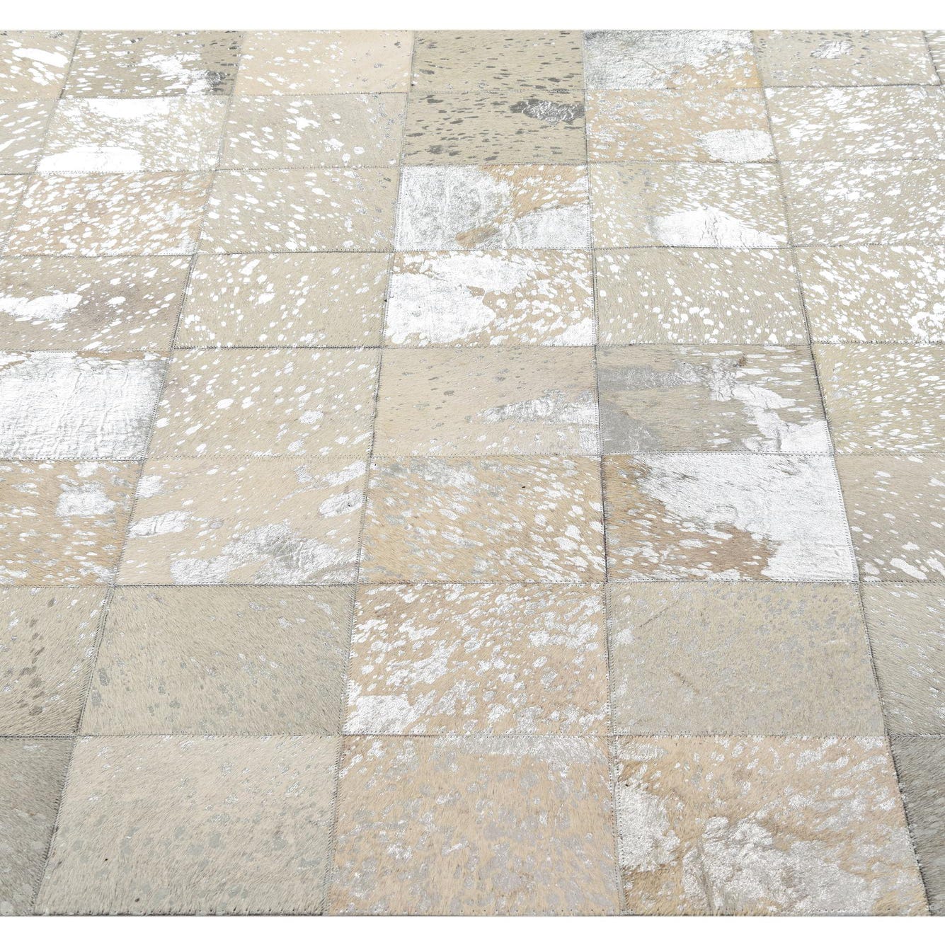 This Cowhide collection rug presents a sophisticated mosaic of ivory, beige, silver, and gray hues, harmoniously blending into an elegant patchwork design. Handmade from cowhide and leather, this 5x8 piece boasts a luxuriously smooth texture and inherent durability, ensuring both visual appeal and long-lasting quality.