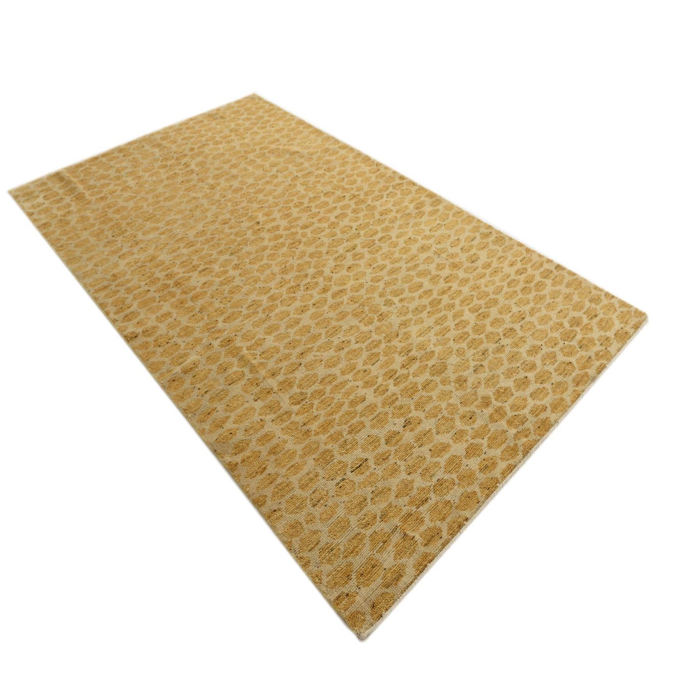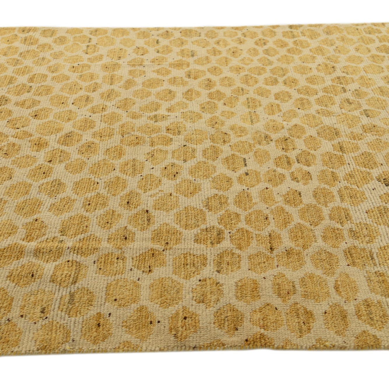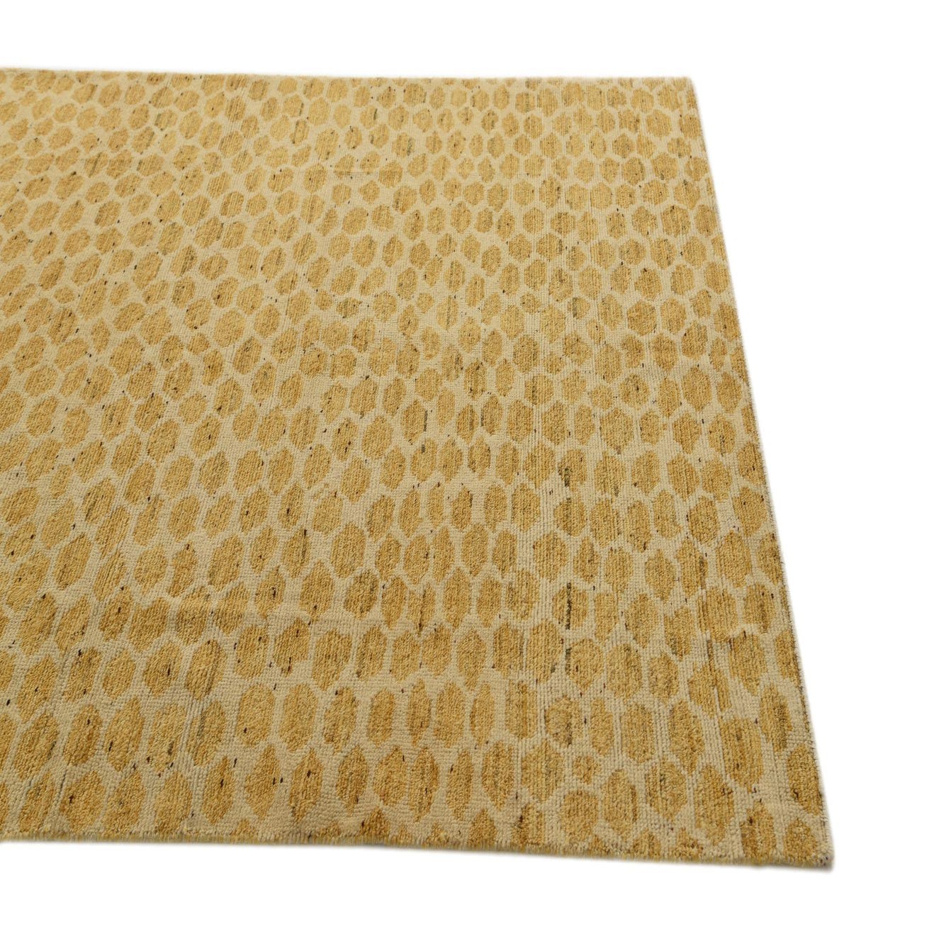 The Darya collection presents a 5x8 hand-knotted rug crafted from 100% wool, offering a naturally resilient and soft-to-touch surface. This rug showcases a dynamic pattern with an ivory background, overlaid by a distinct honeycomb motif in a vibrant yellow hue. The pattern's visual texture is enhanced by the natural variation in color, conveying a sense of depth and movement across the piece.