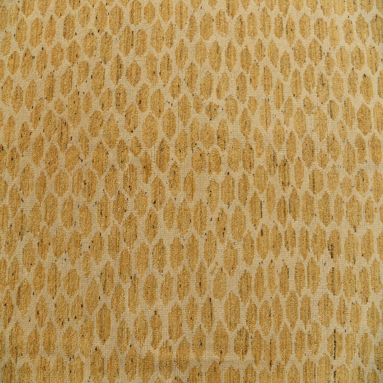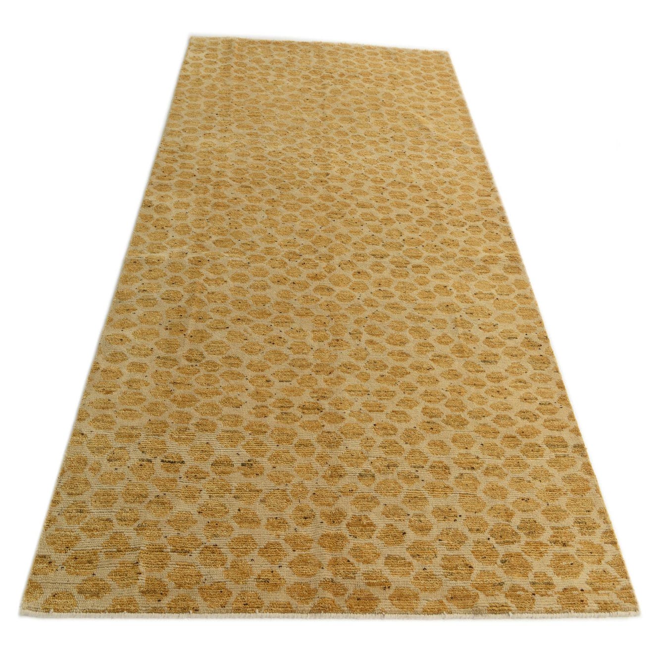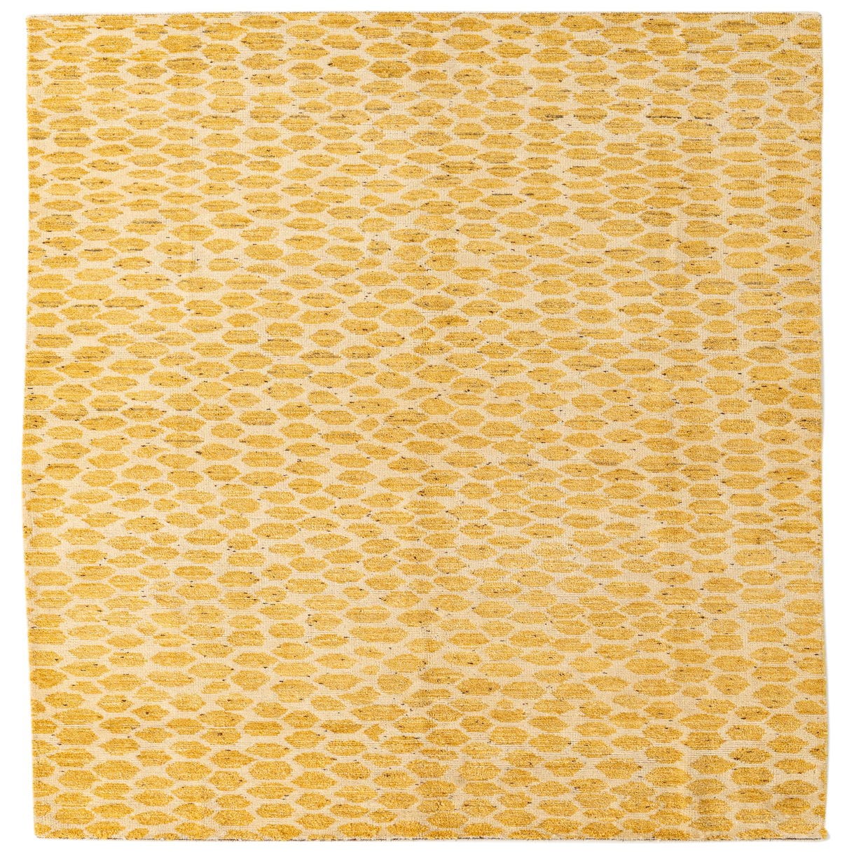 The Darya collection presents a 5x8 hand-knotted rug crafted from 100% wool, offering a naturally resilient and soft-to-touch surface. This rug showcases a dynamic pattern with an ivory background, overlaid by a distinct honeycomb motif in a vibrant yellow hue. The pattern's visual texture is enhanced by the natural variation in color, conveying a sense of depth and movement across the piece.