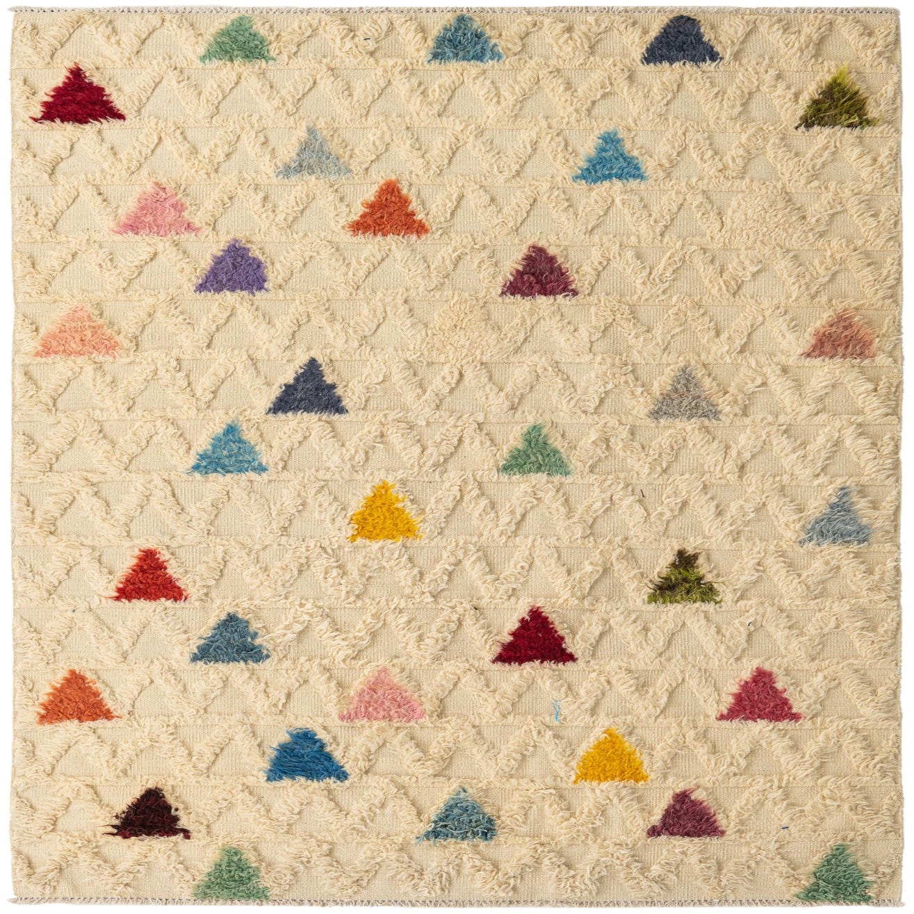 A 5x8 rectangular ivory wool rug with a high pile, featuring a modern abstract pattern of colorful triangles.