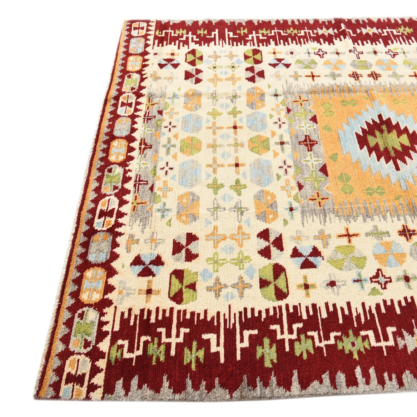A 5x8 rectangular Darya rug with an ivory field, a central abstract medallion in gold and blue, and a wide red border with geometric patterns.