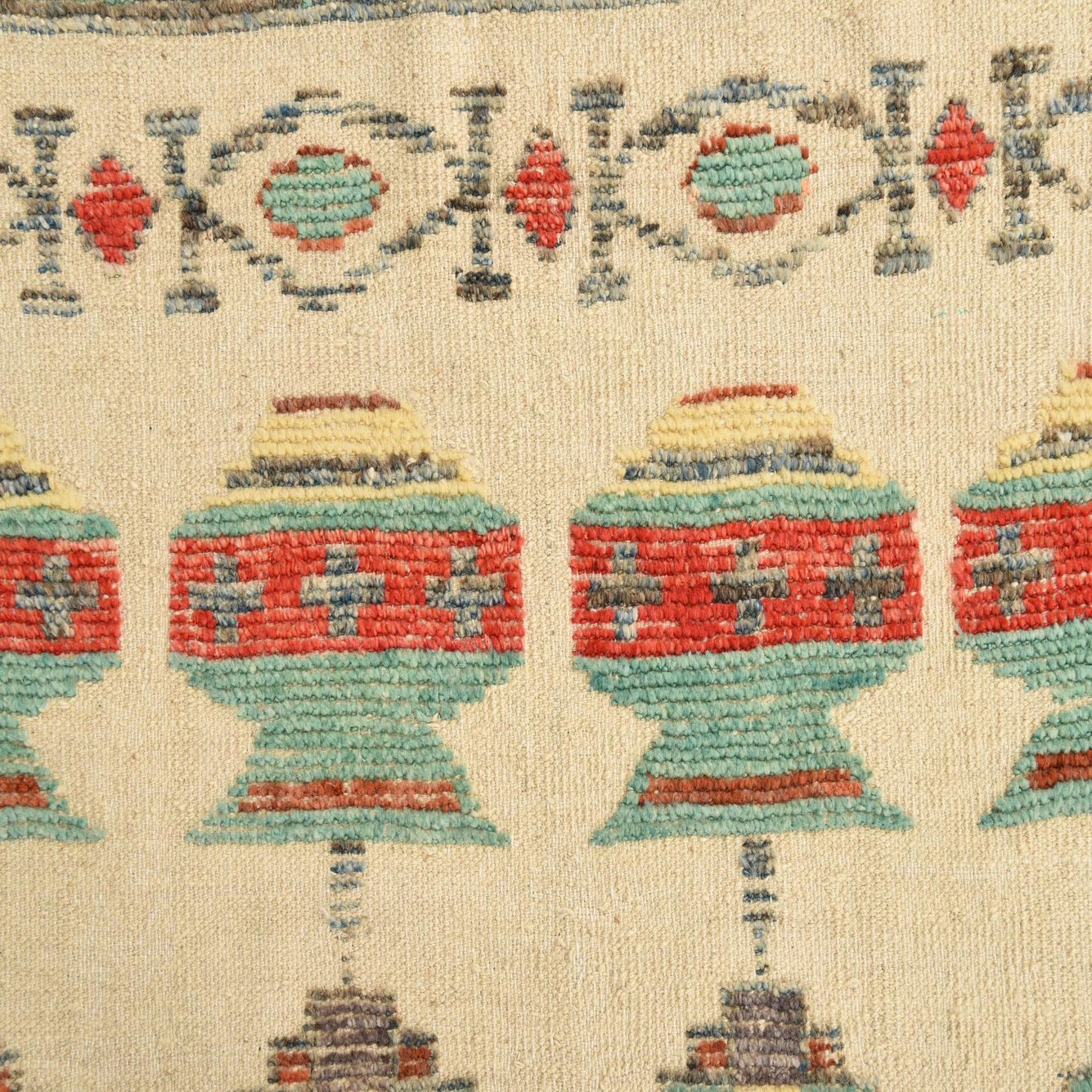 The rug's texture is indicative of its hand-knotted construction, offering a tactile richness that contributes to its distinctive character. Each knot contributes to the rug's durability, making this piece a suitable choice for high-traffic areas or as a statement element in a more intimate space.