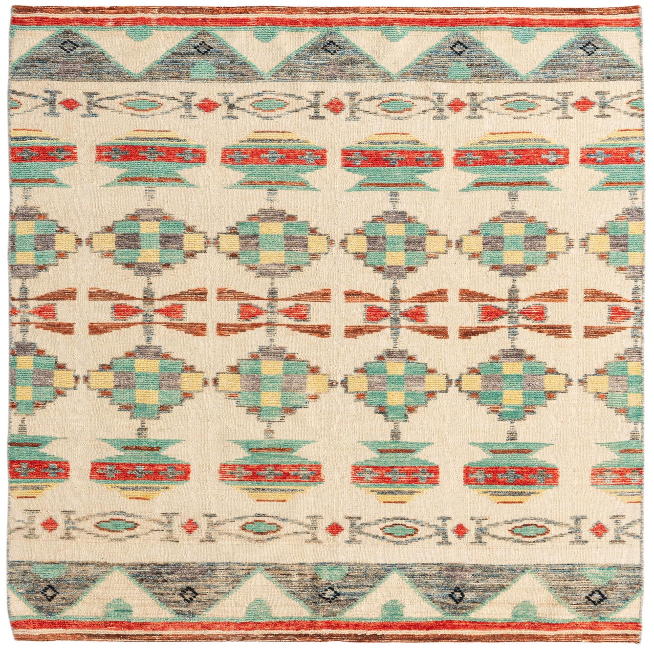 The Darya collection presents a sophisticated 5x8 hand-knotted rug crafted from 100% wool. This piece displays a rhythmic pattern featuring geometric and stylized motifs that suggest a blend of tribal and traditional aesthetics. The ivory background provides a neutral canvas for the bold overlays of black, gray, green, orange, and yellow accents, forming a harmonious palette that is both dynamic and versatile.
