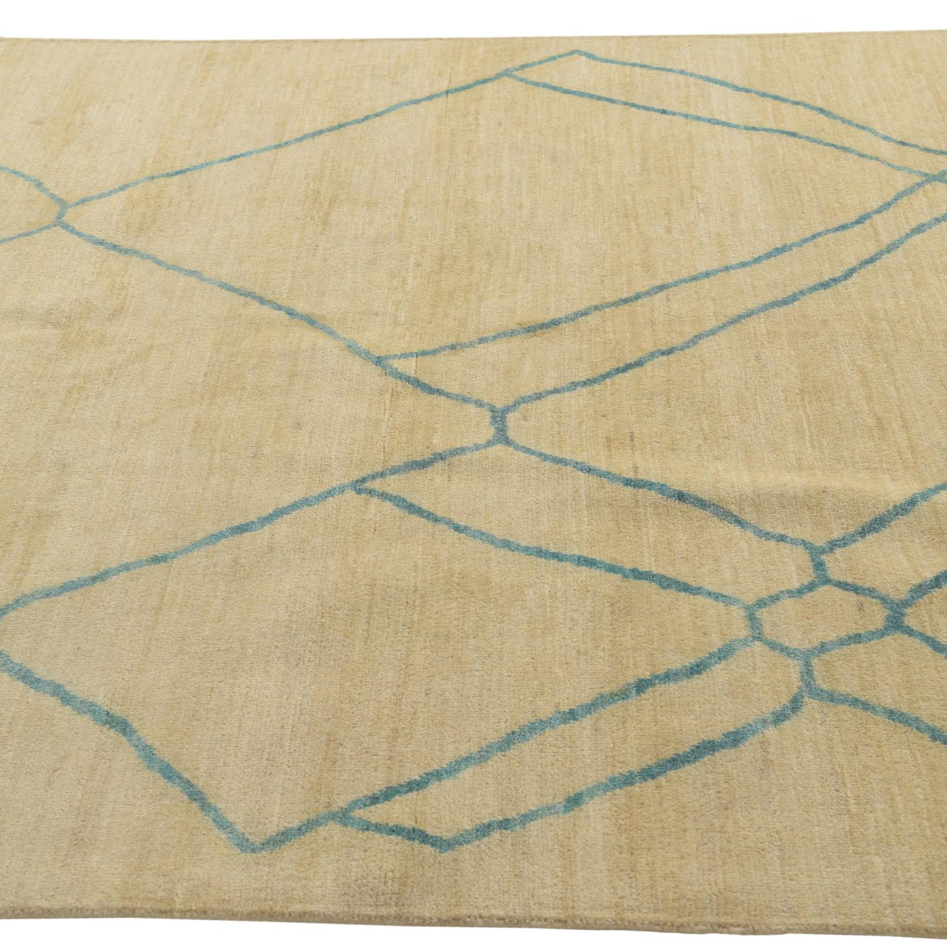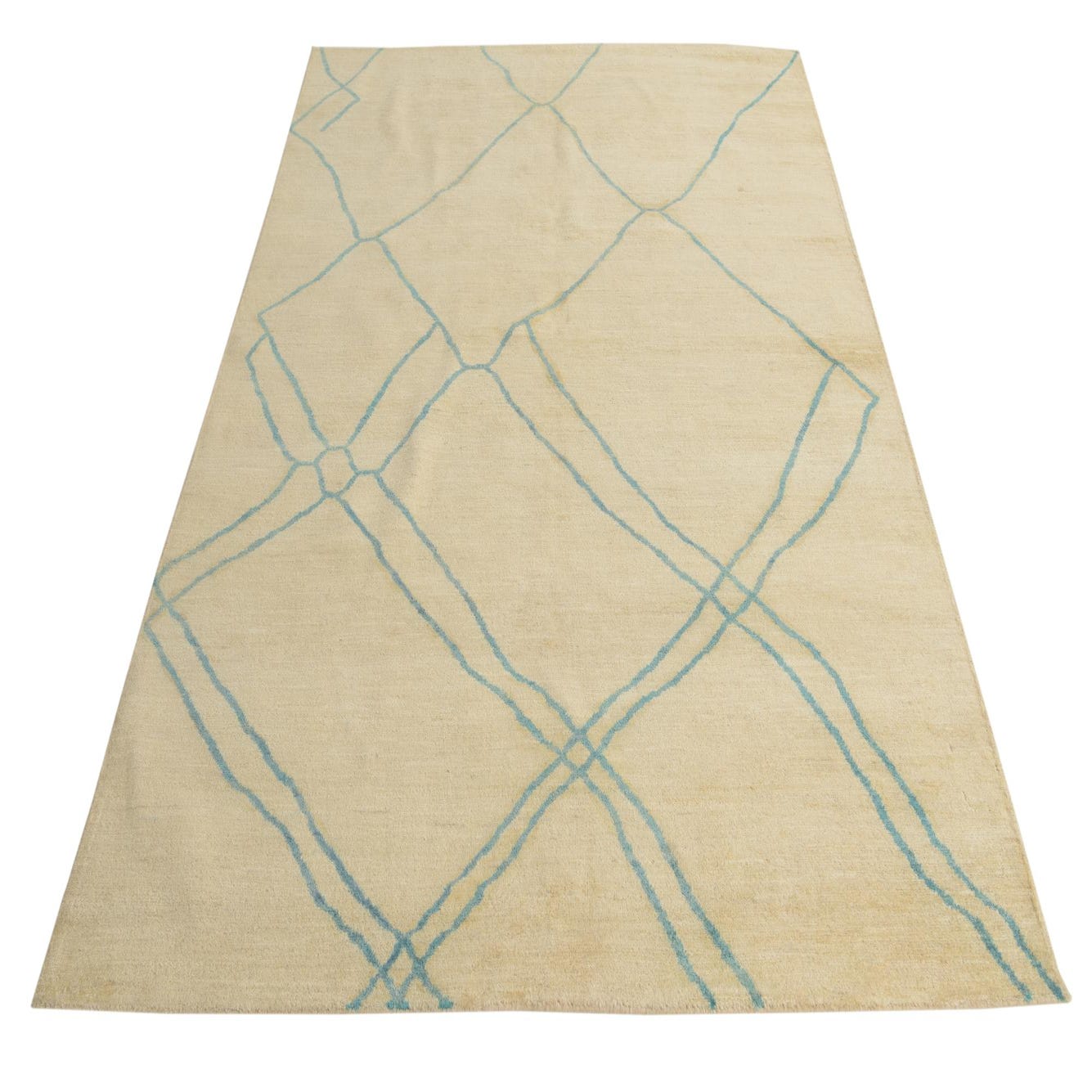 A 5x8 rectangular ivory wool rug with a modern abstract teal geometric pattern, suitable for a living room.