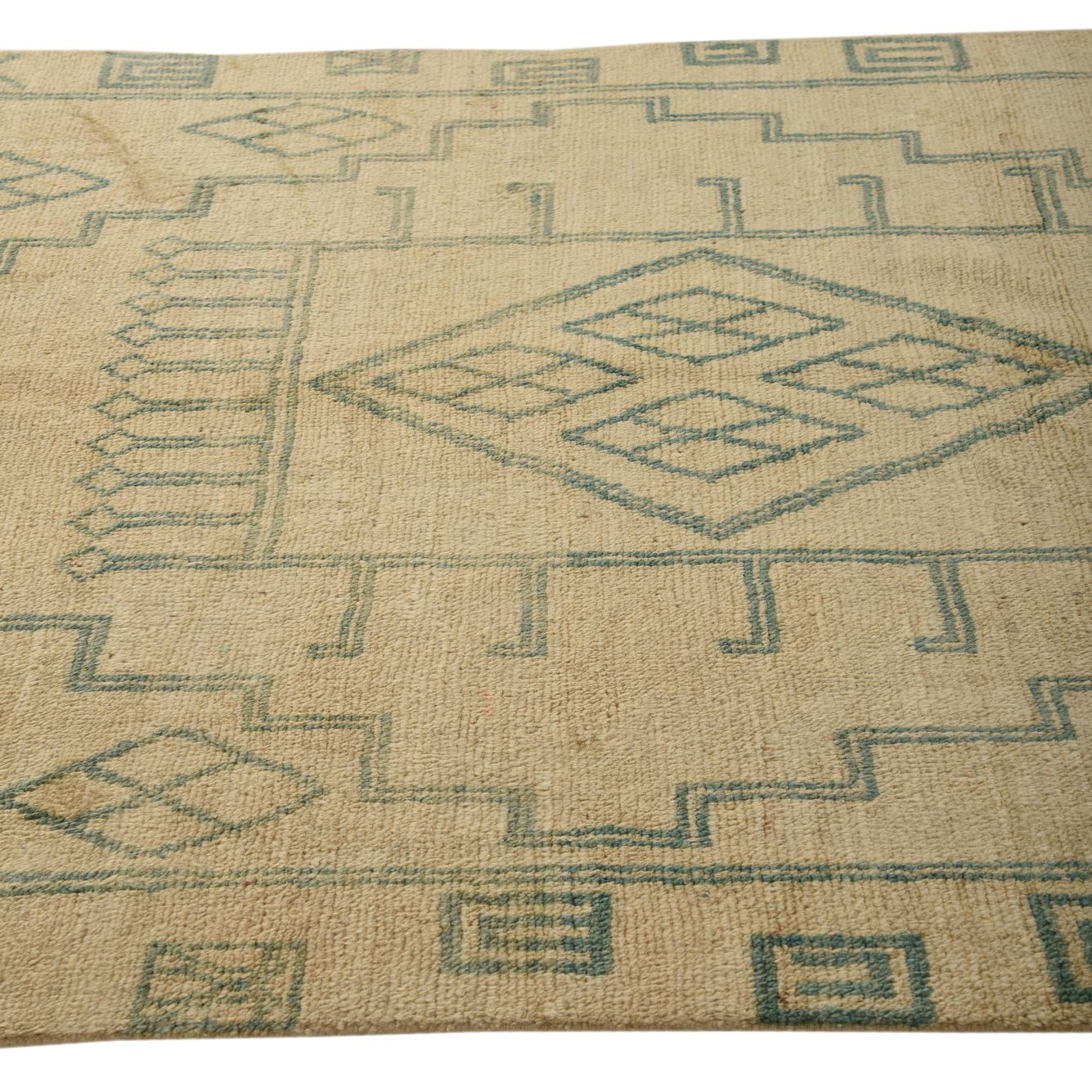 The Darya collection presents a tasteful 5x8, hand-knotted rug crafted from 100% wool, offering a blend of durability and comfort underfoot. The rug showcases a geometric pattern accented by symmetrical motifs, creating a sense of balance and structure. Its primary ivory backdrop is complemented by soft, light green detailing, delivering a subtle yet impactful visual appeal.