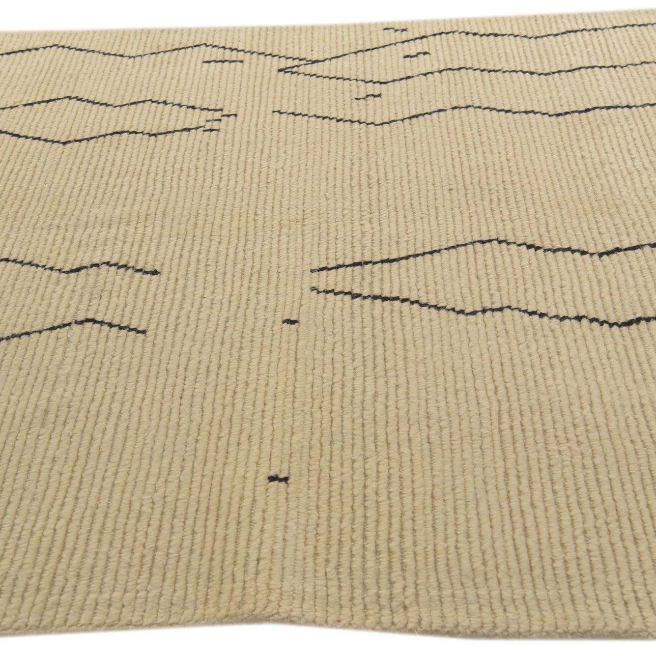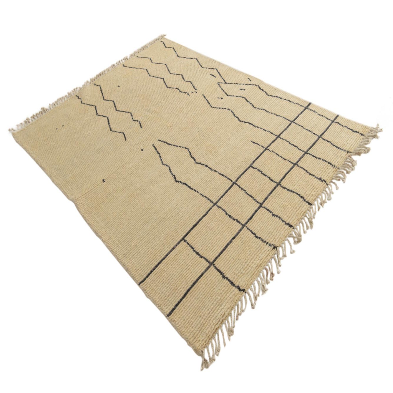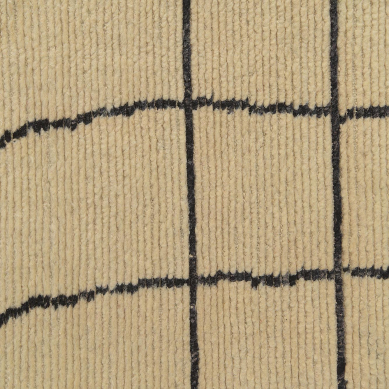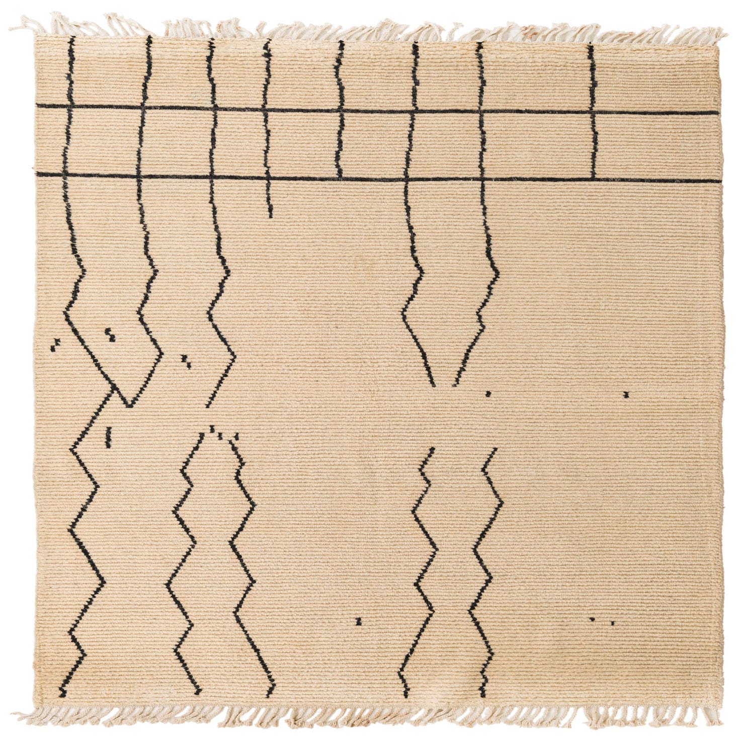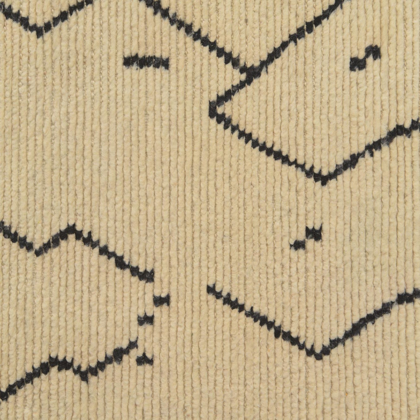 A soft ivory field provides a calm, tactile backdrop for a restrained black motif. Thin horizontal bands form a subtle grid near one end, while irregular vertical zigzags and tiny knotted dots travel down the rug, giving it an artisan, hand-drawn character. The surface is hand-knotted from 100% wool with a low, ribbed pile you can feel underfoot—warm, slightly springy, and textured where the black yarns create gentle relief. Finished with short ivory fringe at each end, the overall look is modern with a nod to traditional Moroccan geometry.