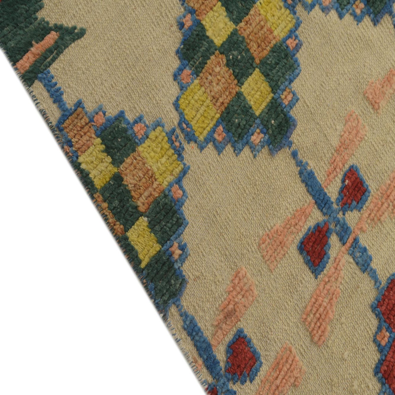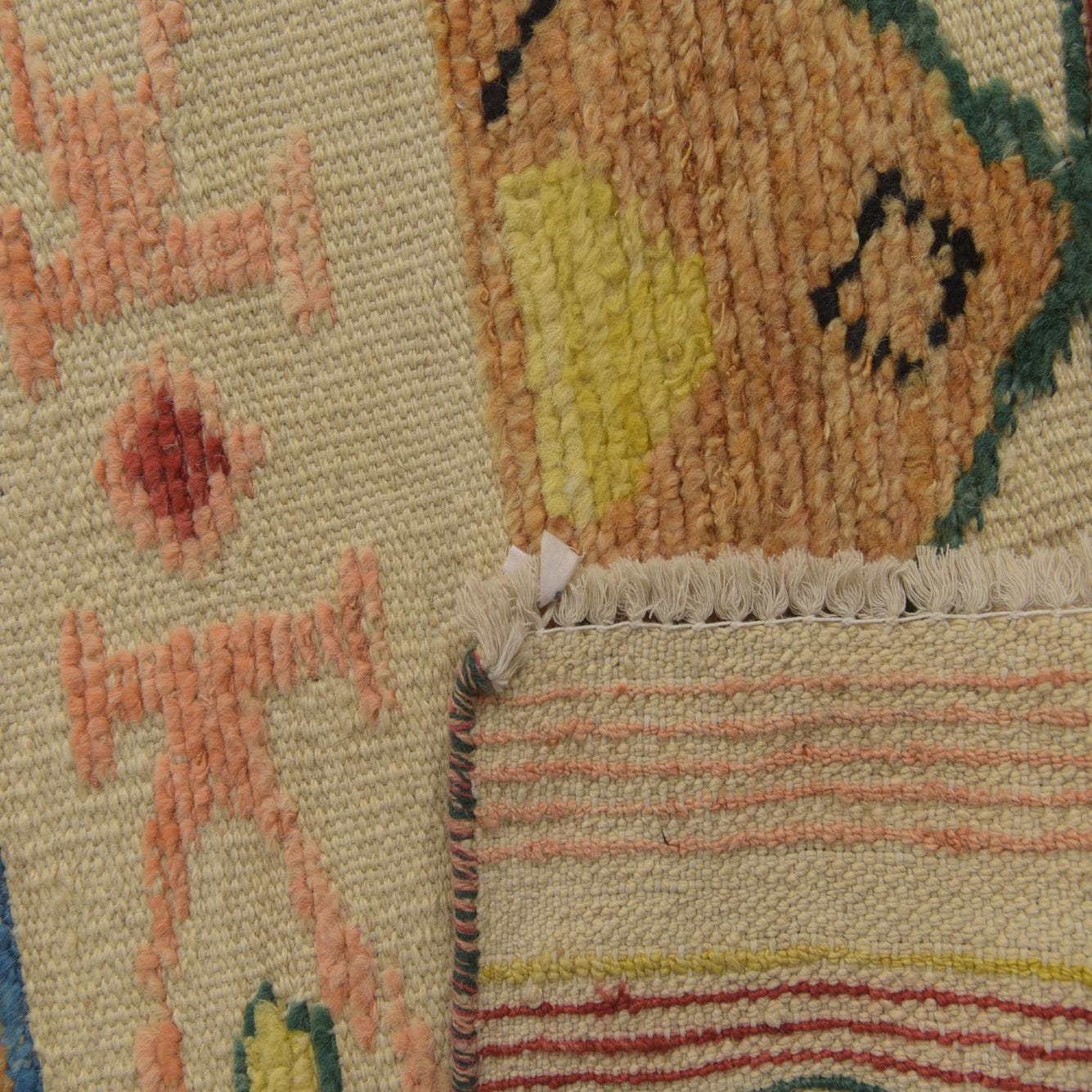 Primary color is Ivory. Colors in this rug include: Ivory, Green, Red, Yellow, Blue, Black, Gold.