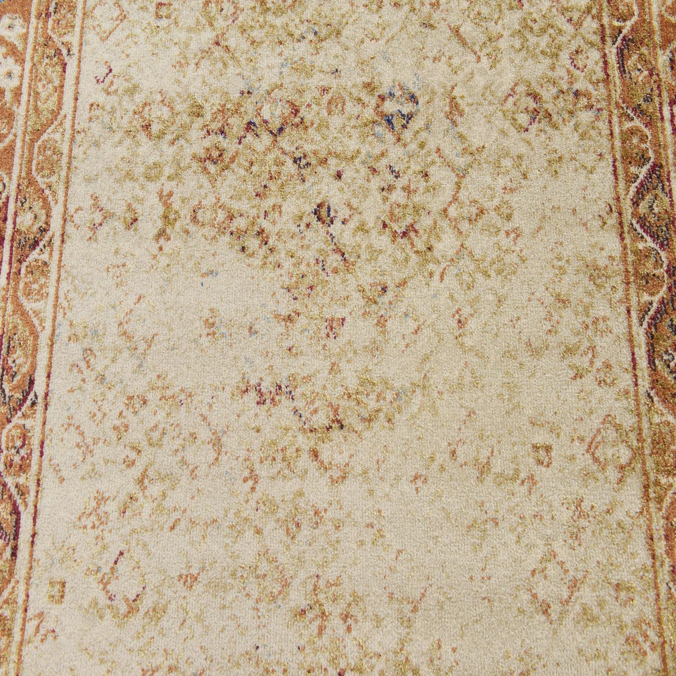 The rug's border is adorned with intricate patterns, incorporating floral and geometric motifs, lending it a classic charm that complements a variety of interior design styles. The machine-woven construction of 100% polypropylene ensures durability and a soft texture underfoot, making it a practical addition to any living space.