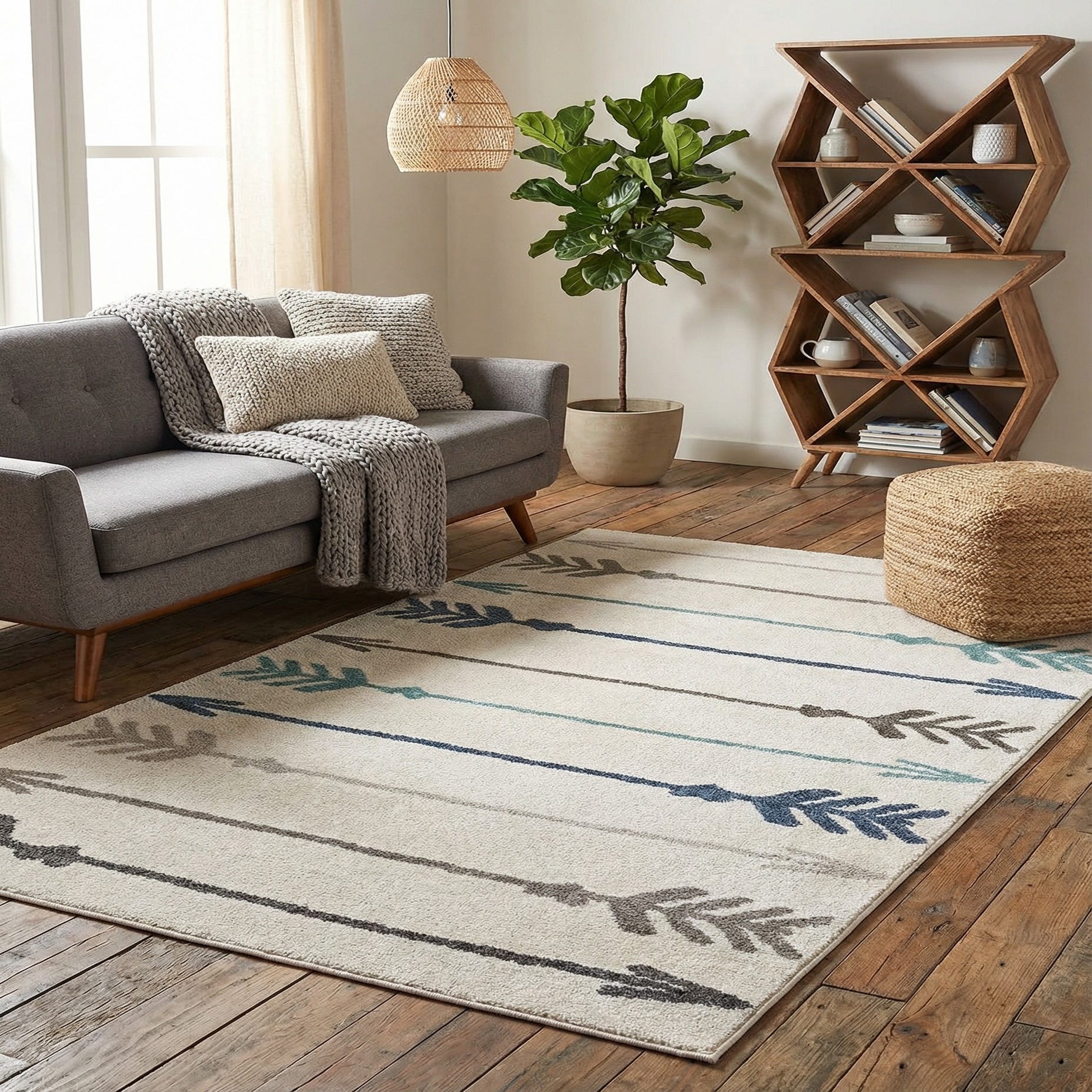 Clean rows of hand-drawn arrows traverse an ivory field, creating a relaxed, linear pattern with a modern-casual sensibility. Each arrow is rendered in shades of gray, black, navy blue and light green, offering a balanced mix of cool neutrals and soft color. The rug’s cut-pile surface feels soft underfoot with a low-to-medium profile that provides comfortable cushioning while maintaining a tidy, contemporary appearance.