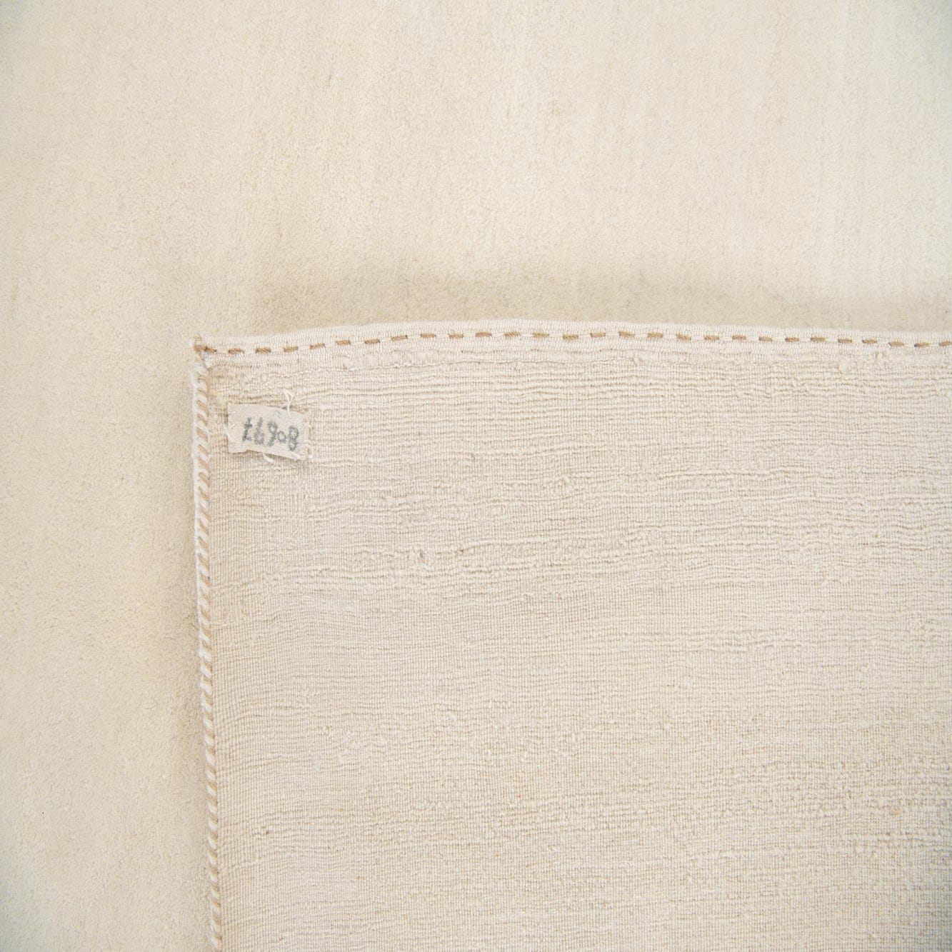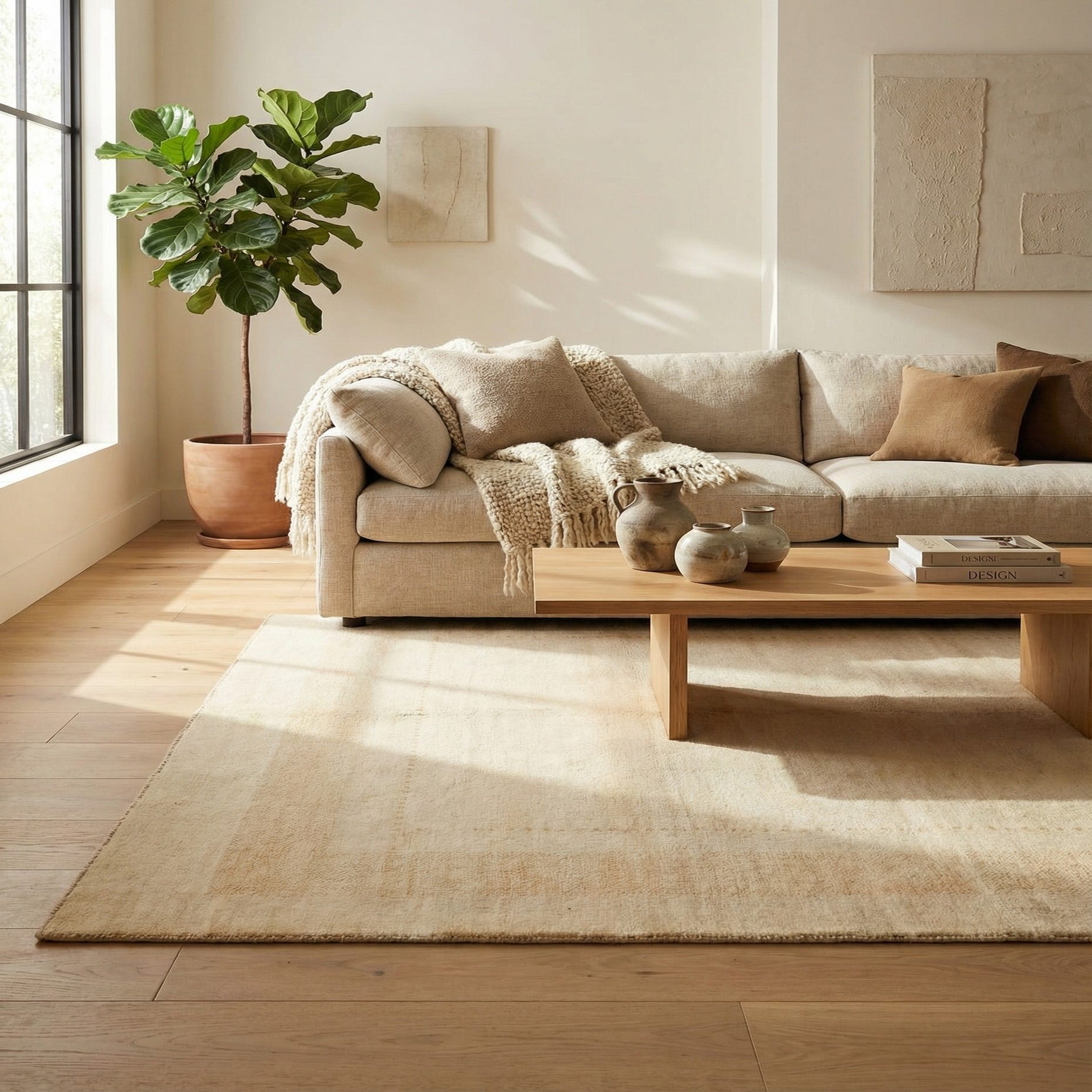 A 5x8 rectangular ivory wool rug with a subtle solid pattern and a medium pile, ideal for a living room.