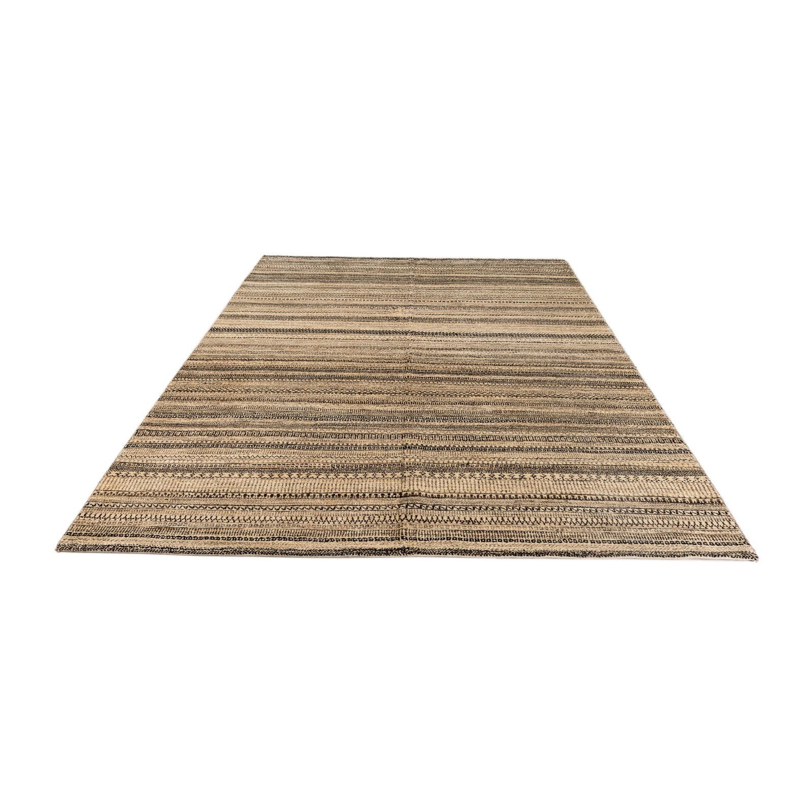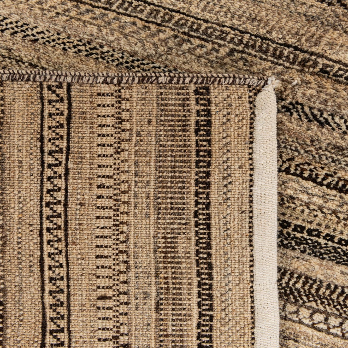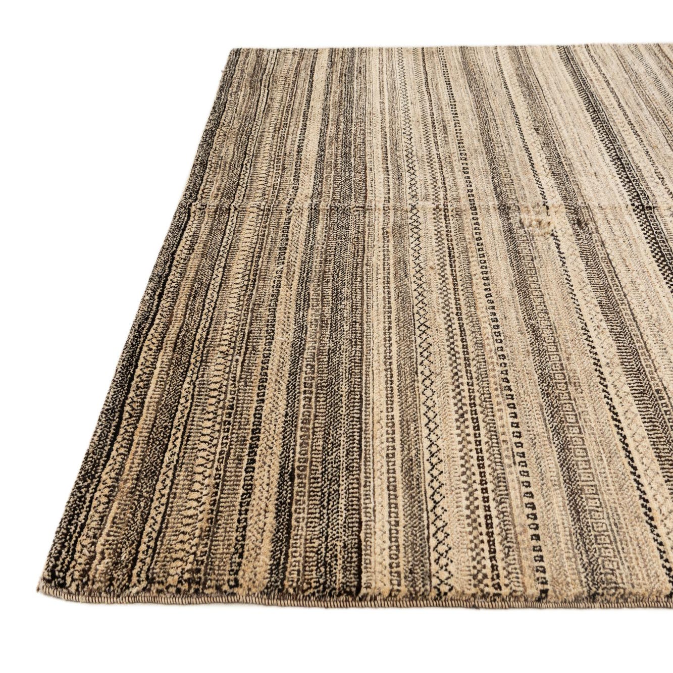 A 5x8 rectangular Gabbeh rug in ivory and cream with a modern striped pattern, handmade from wool.