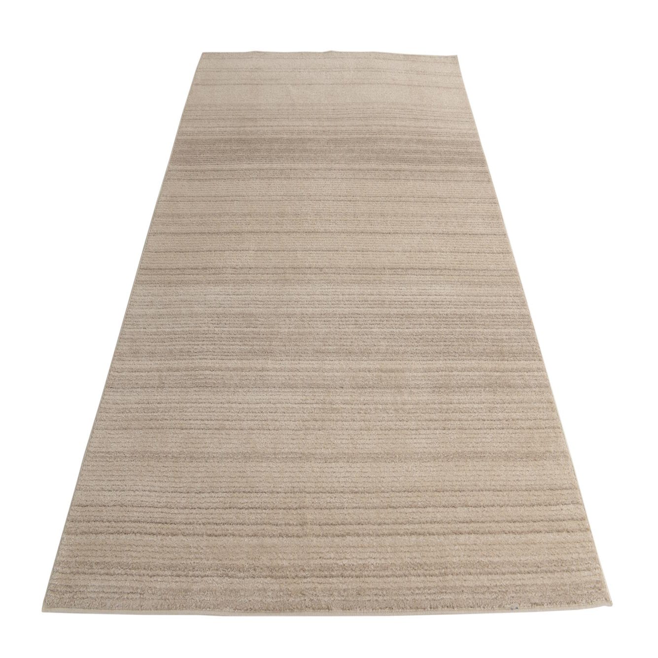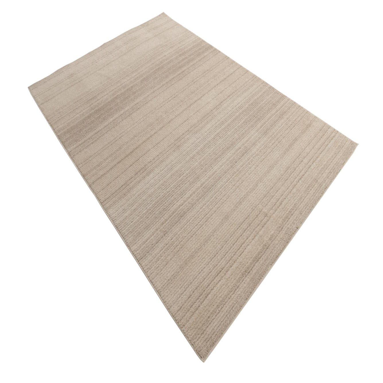 A rectangular 5x8 ivory and cream modern area rug with subtle horizontal textured stripes, perfect for a living room.