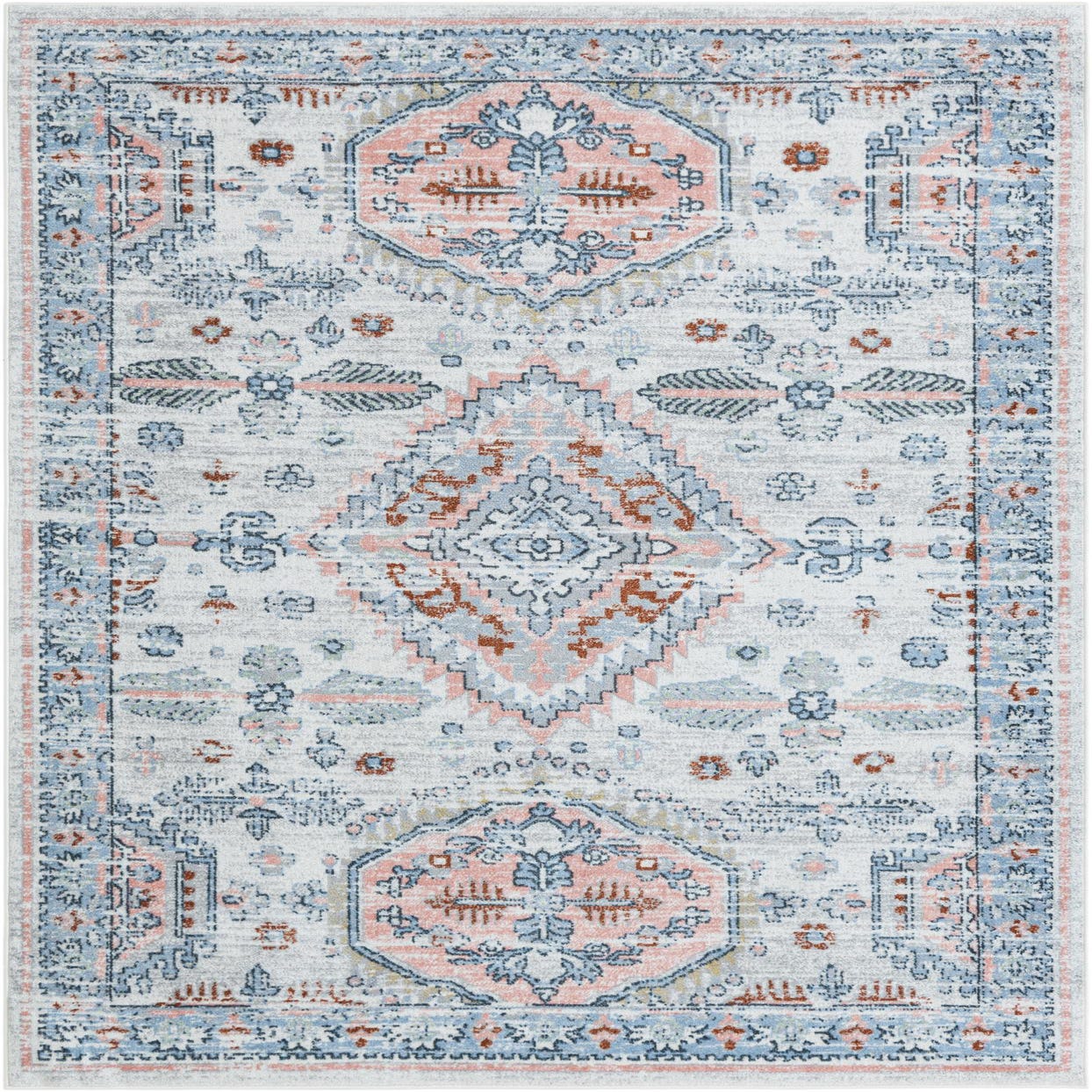 Primary color is Ivory. Colors in this rug include: Ivory, Gray, Light Blue, Rust Red, Navy Blue, Pink.