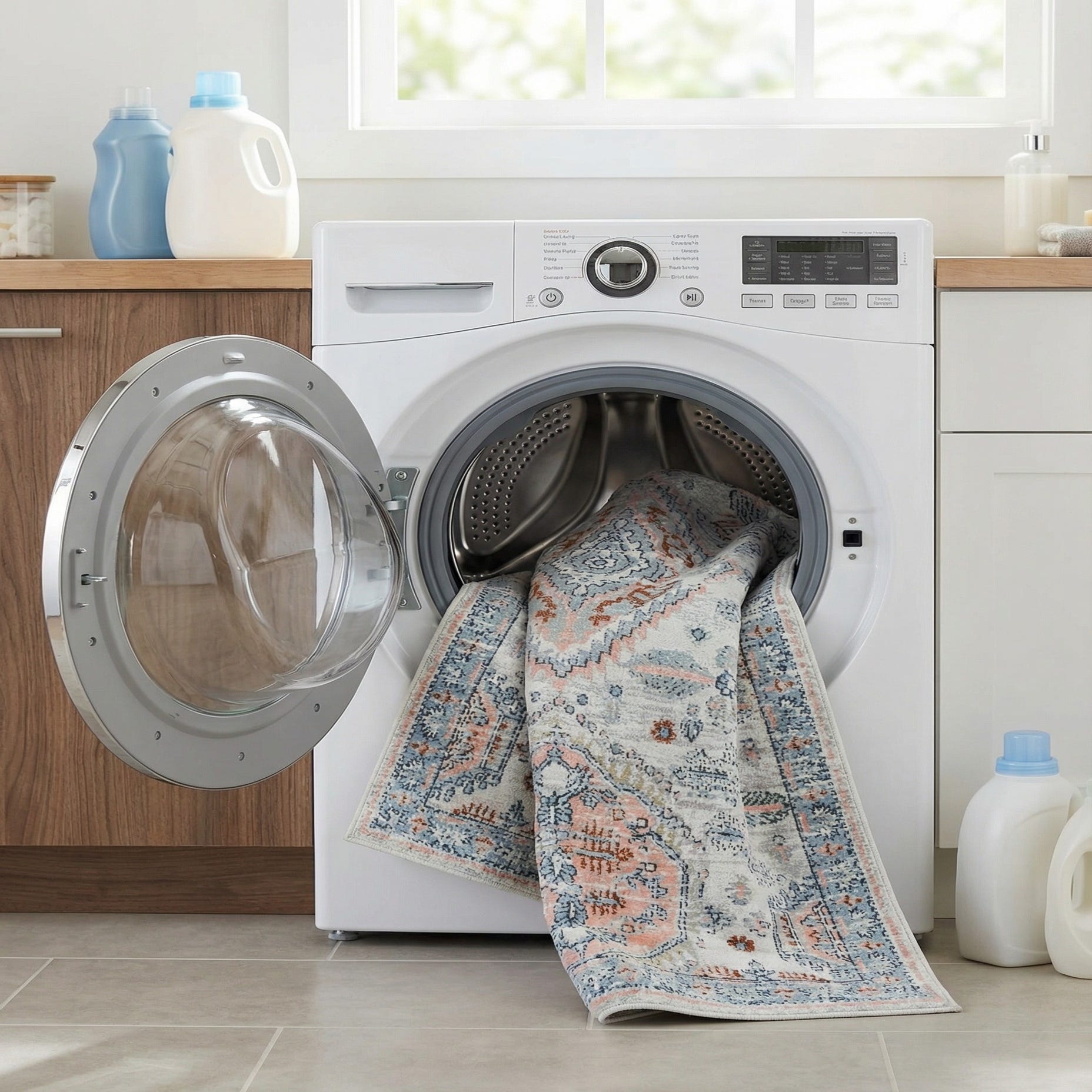 A 5x8 rectangular Kamala Washable rug featuring a distressed ivory, blue, and coral traditional medallion pattern.