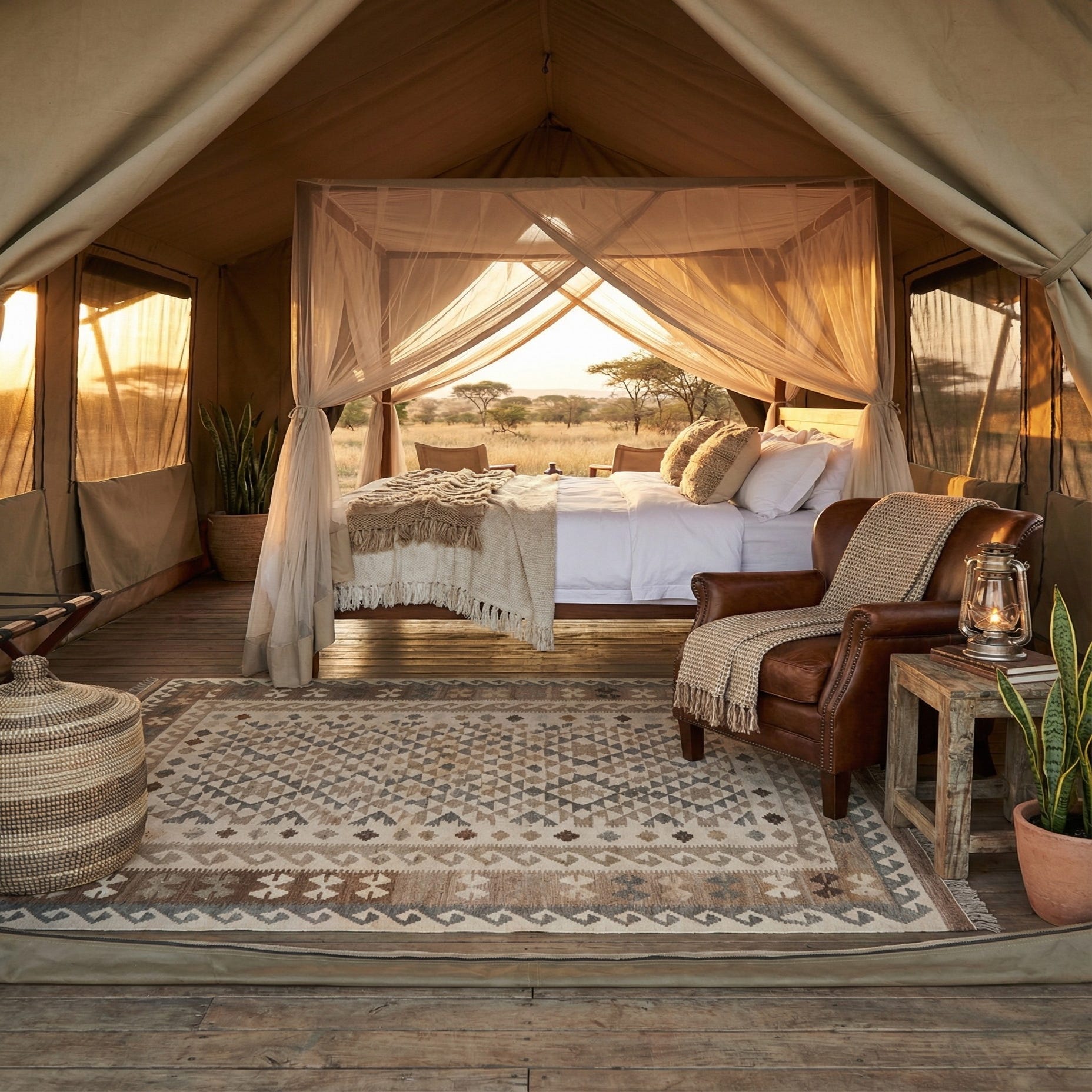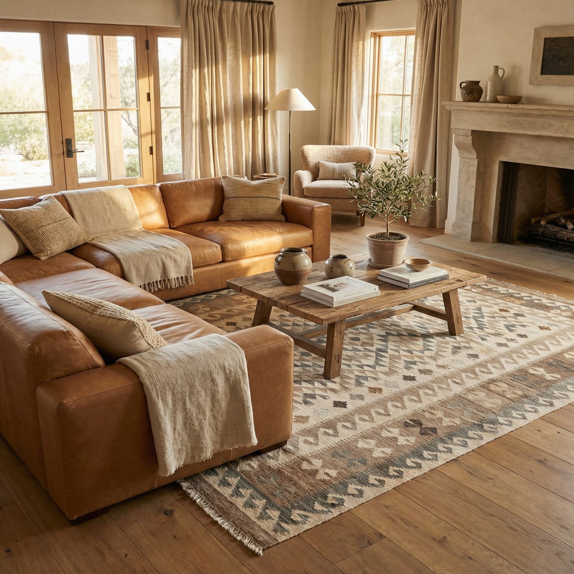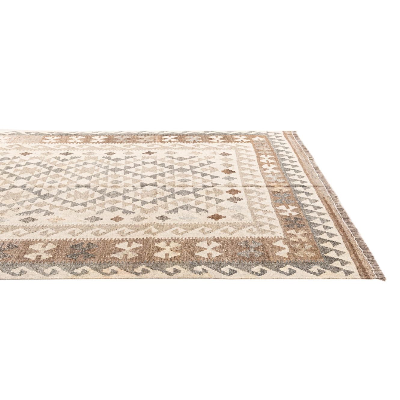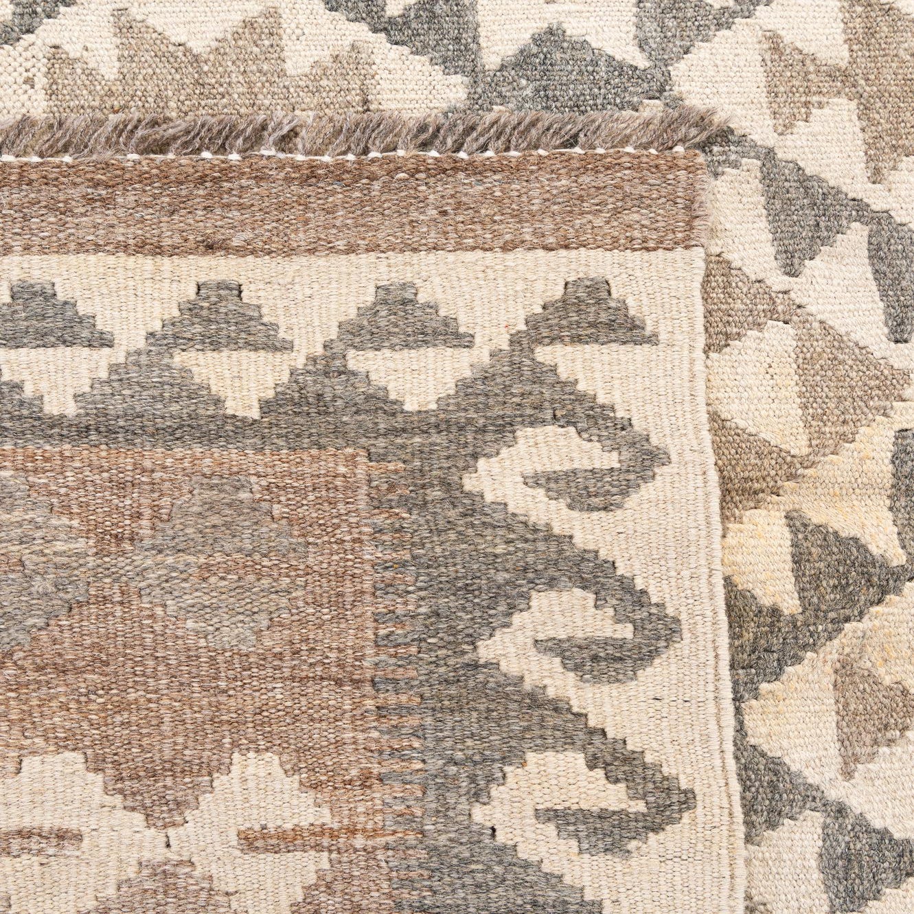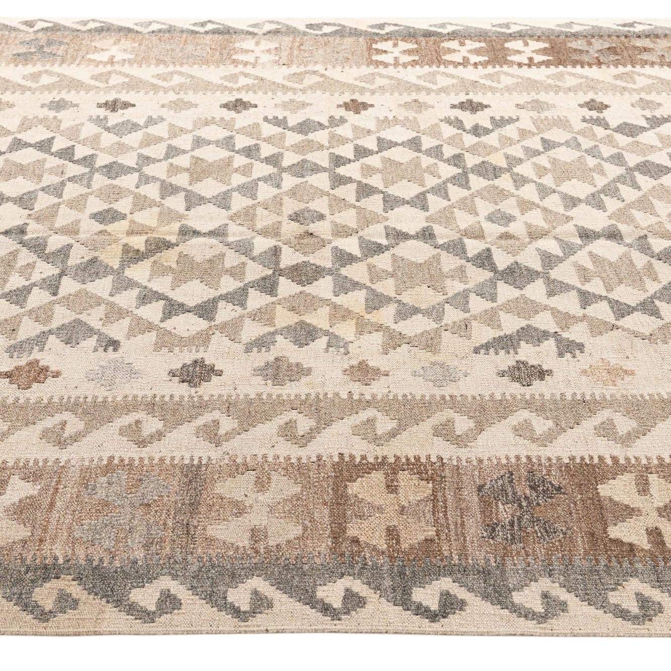 A rectangular 5x8 Kilim Maymana rug featuring a tribal geometric pattern in shades of ivory, cream, white, and brown.