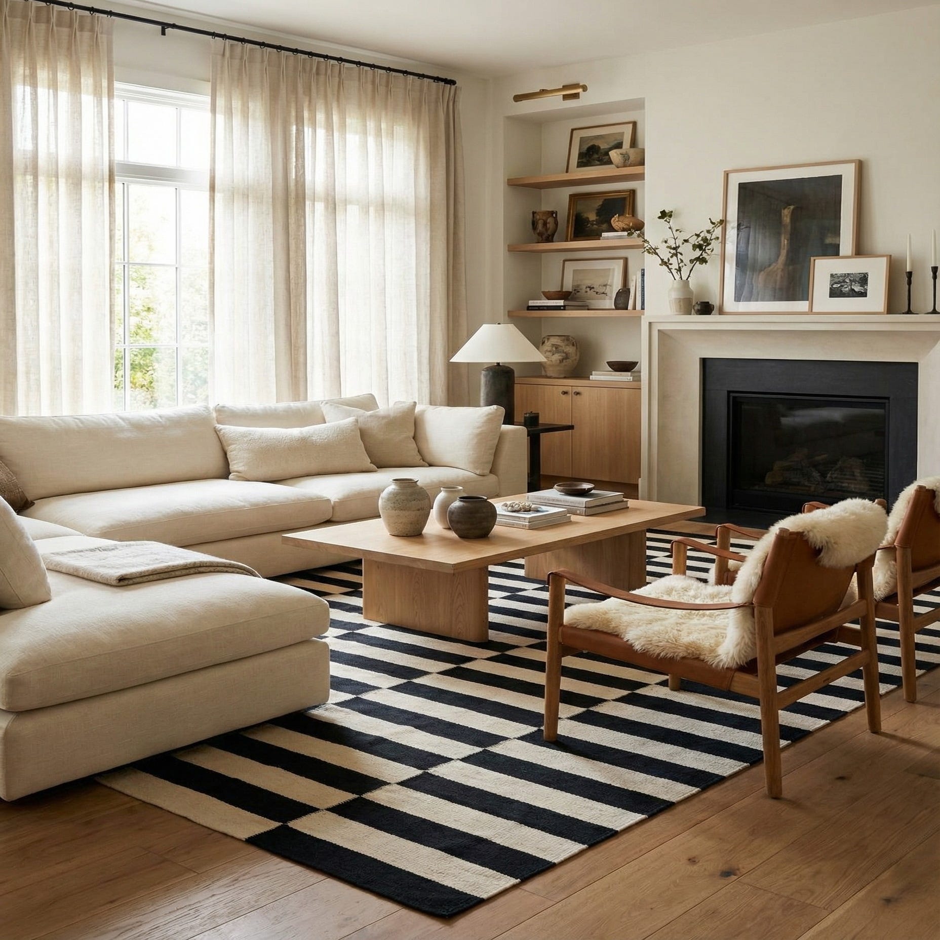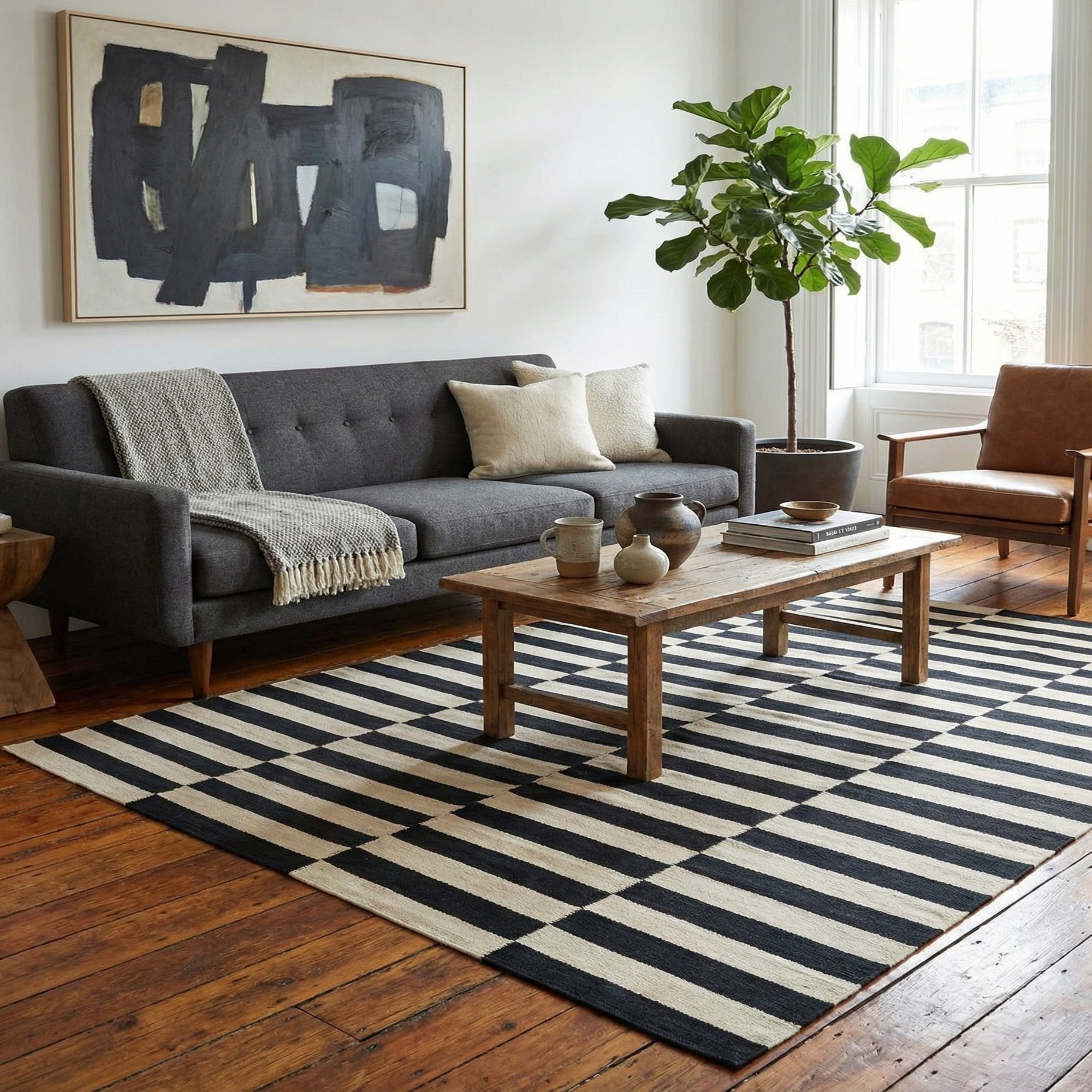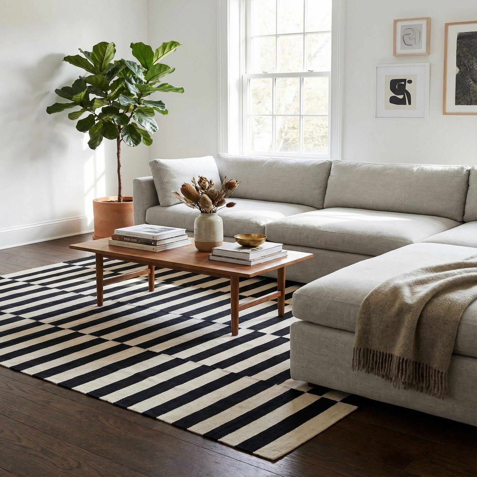 Hand-woven from 100% wool in a kilim flatweave, the surface is low-profile and pleasantly textured underfoot, with the tight weave emphasizing the crisp stripe edges and subtle variations in the yarn. This rug pairs well with minimalist and mid-century pieces, Scandinavian-inspired interiors, or a neutral-modern scheme that benefits from strong linear contrast. Use it to anchor a small seating area or coffee table, layer it at the foot of a bed, place it in a home office for added structure, or set it beneath a dining nook to define the space.