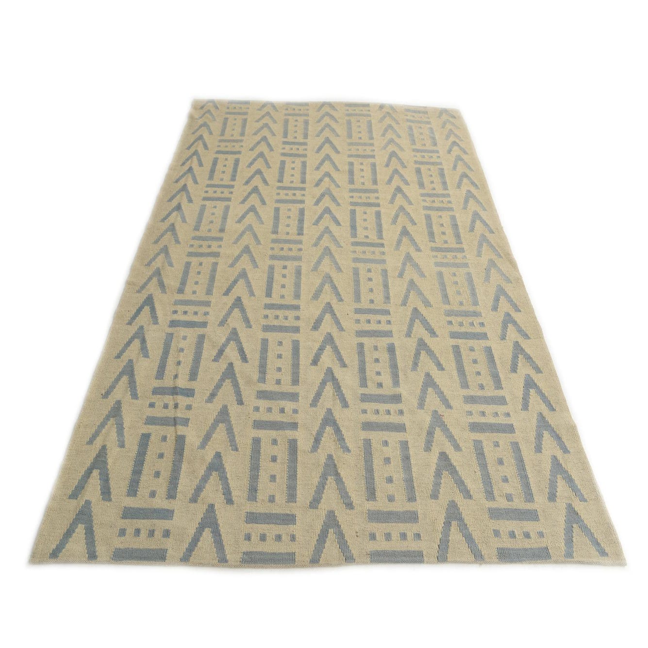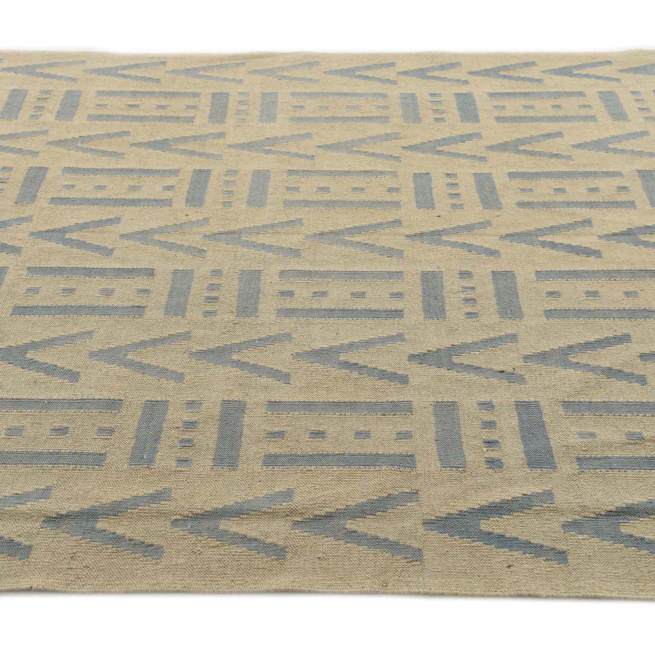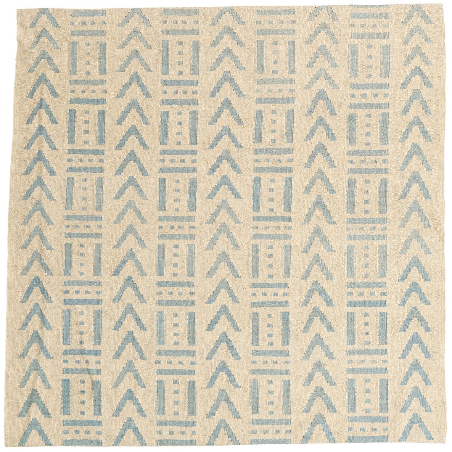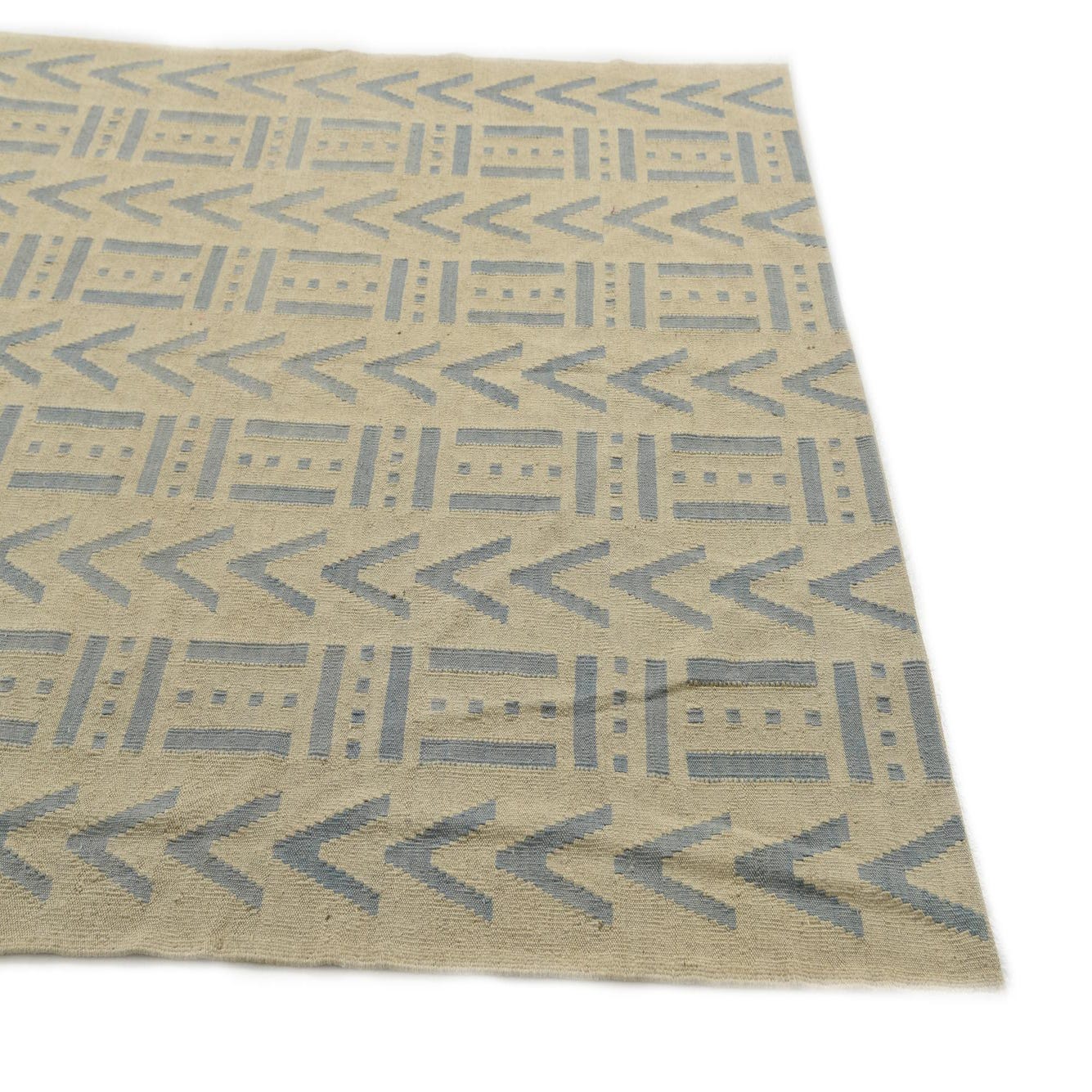 A 5x8 rectangular ivory flatweave wool rug with a repeating light blue tribal geometric pattern.