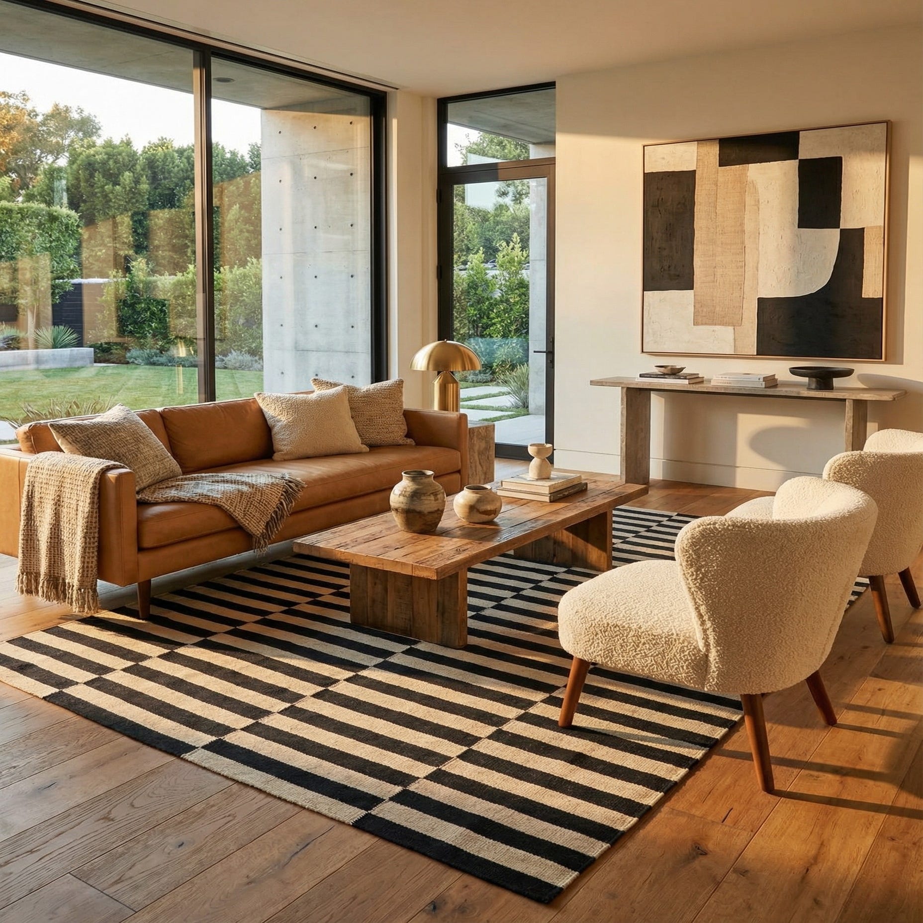 This rug pairs naturally with clean-lined, modern furnishings and warm wood tones for a contemporary living room or dining area. It also works well in minimalist, Scandinavian, or mid-century inspired spaces where graphic patterning can add focus without overwhelming the palette. Use it to anchor a seating group, as a grounding element under a small dining table, or layered over a larger neutral rug to introduce contrast and structure.