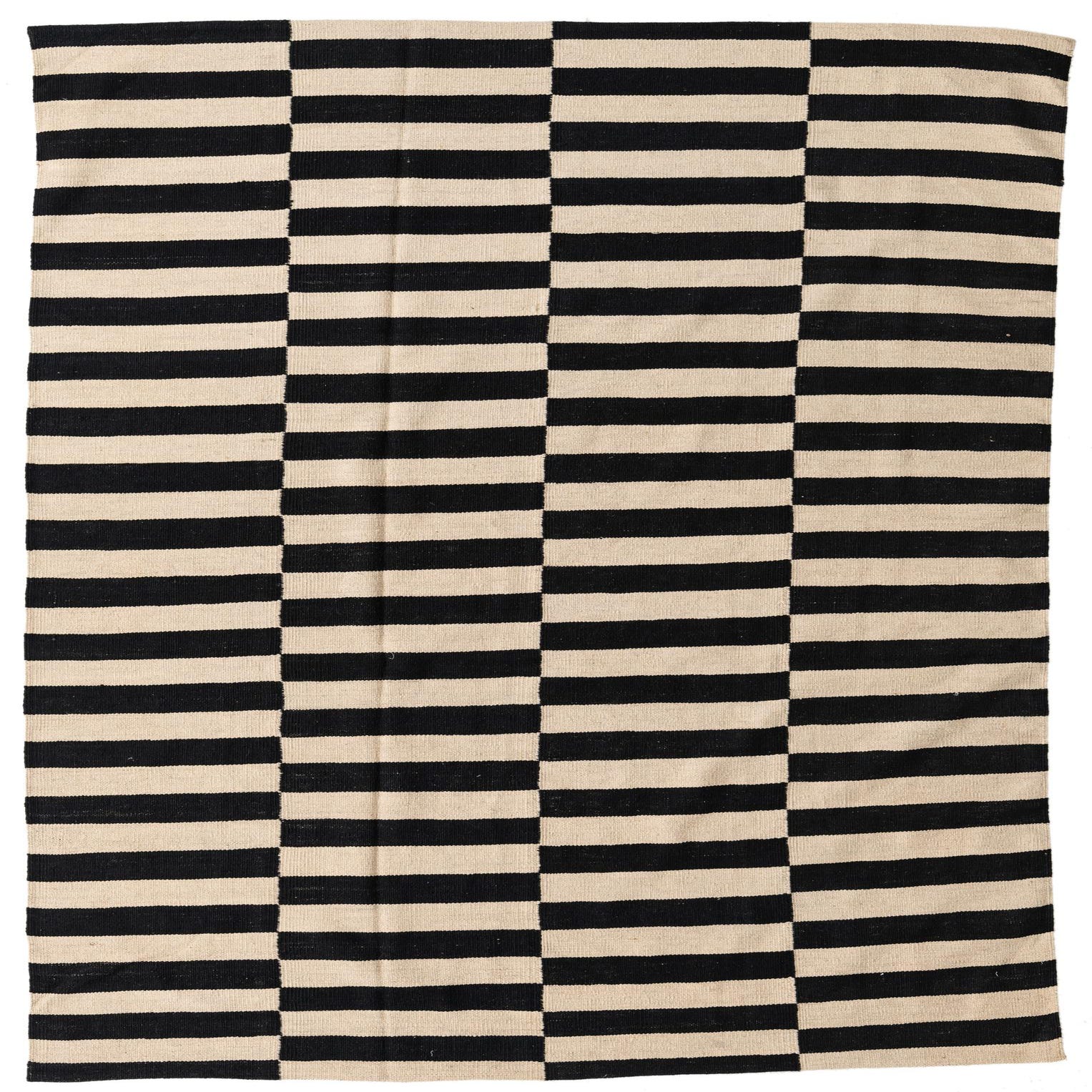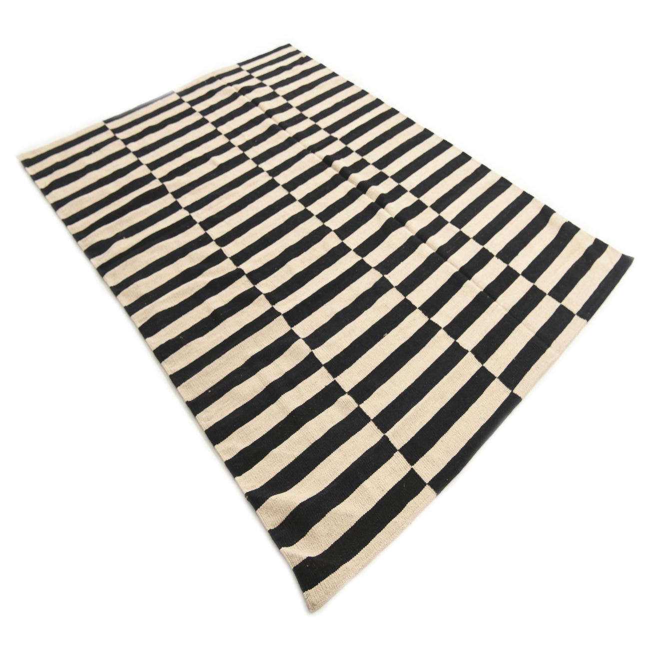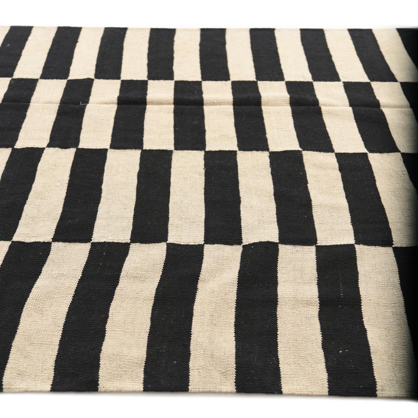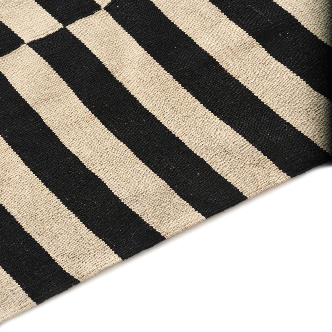 A graphic, geometric rug with a bold black-on-ivory motif, this hand-woven kilim presents alternating horizontal bands arranged in repeating vertical columns that create a rhythmic, checkerboard-like grid. The ivory background brightens the composition while the black stripes bring clear definition and contrast. Woven from 100% wool into a flatweave, the surface has a low profile and a tactile, slightly textured hand typical of traditional kilims—firm underfoot with a subtle natural warmth.