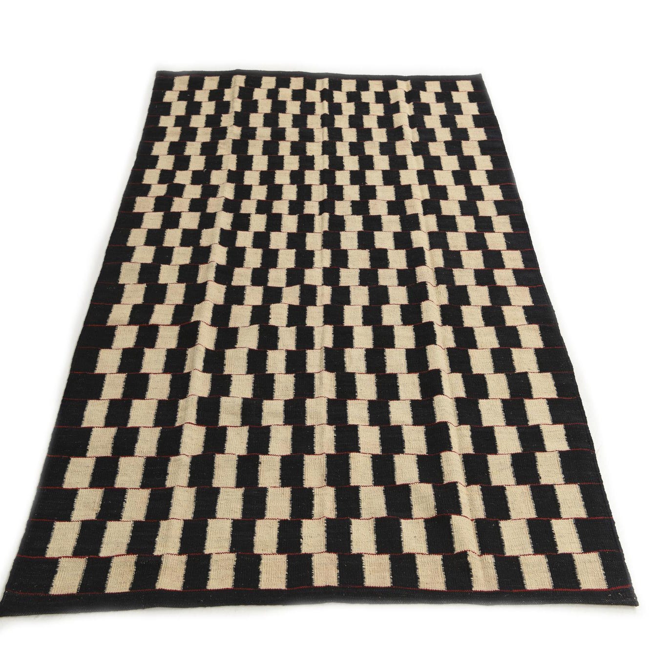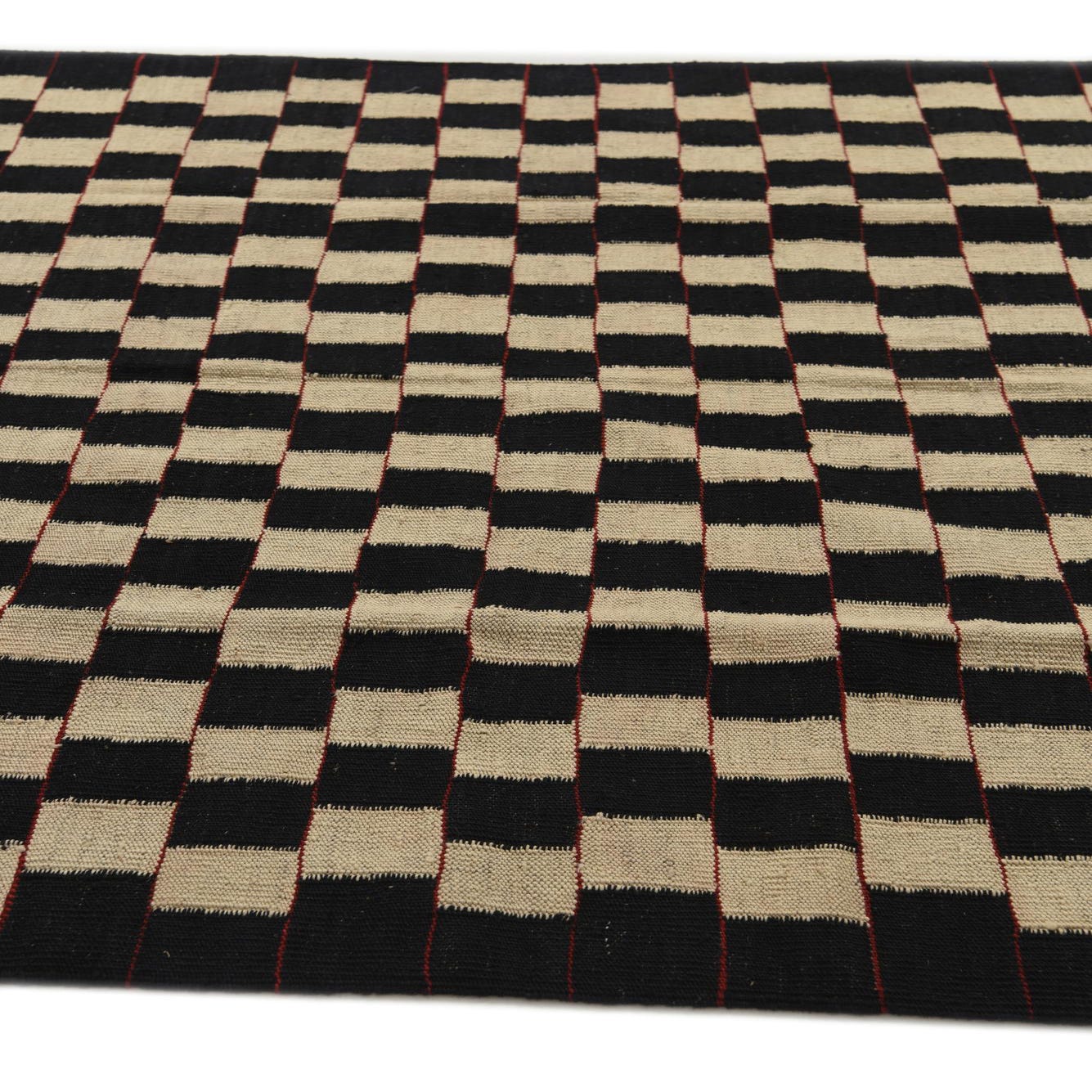 A 5x8 rectangular Kilim Modern rug with a black and ivory checkerboard pattern, featuring thin red horizontal lines.
