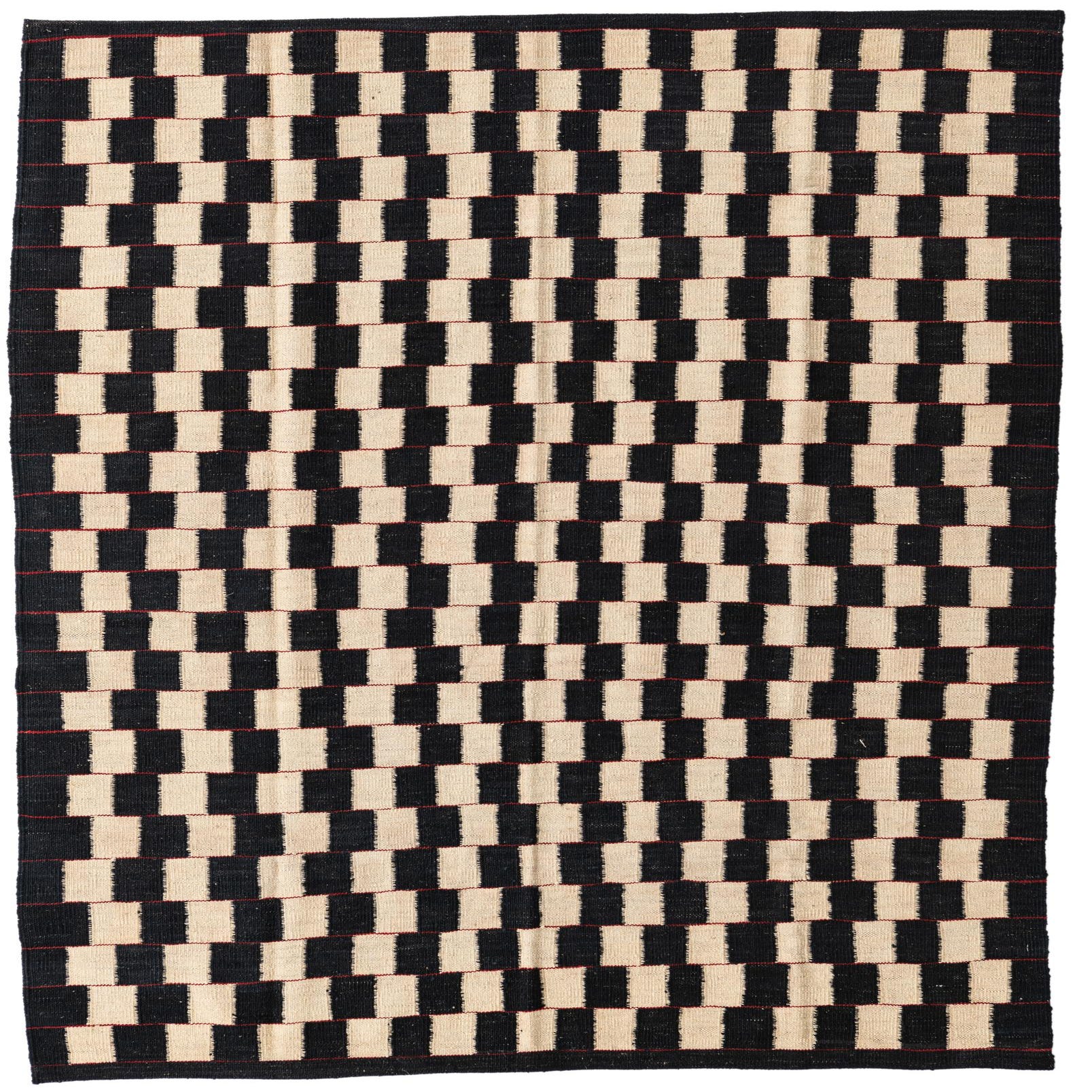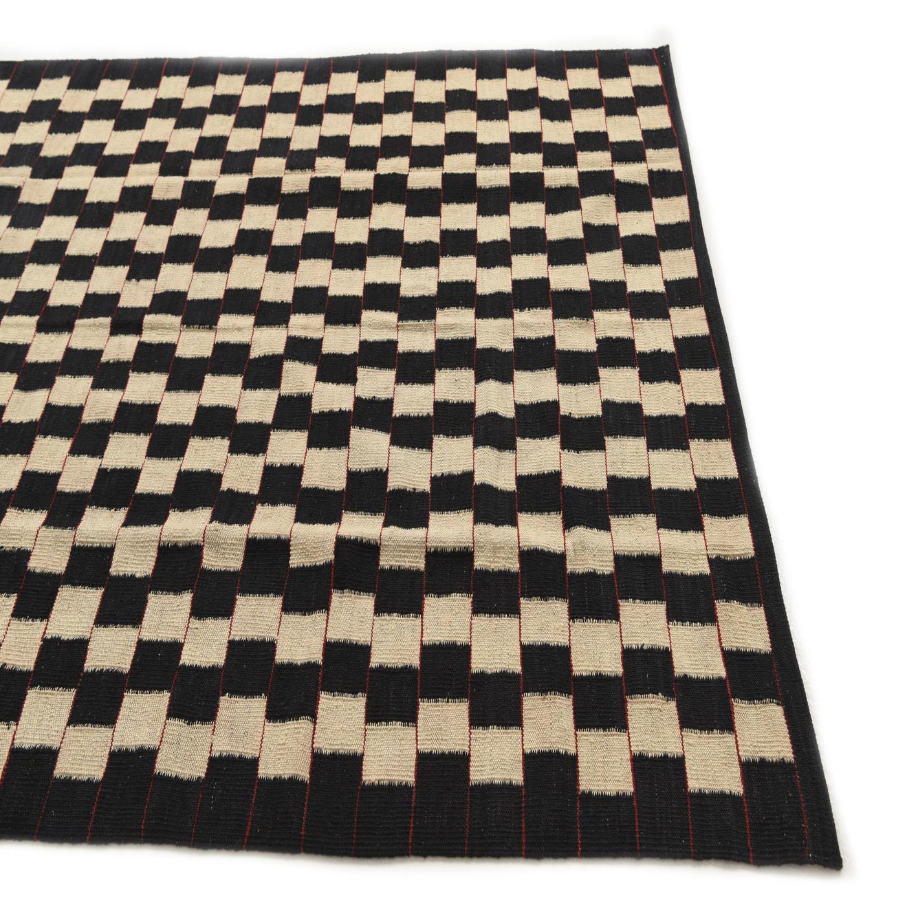 The rug's flatweave construction and wool material provide a durable yet reassuringly soft texture underfoot, making it a practical and stylish choice for various living spaces. Its well-defined pattern and striking contrast offer a versatile aesthetic that can complement modern, minimalist, and Scandinavian interiors, as well as add a touch of sophistication to more eclectic or transitional decors.